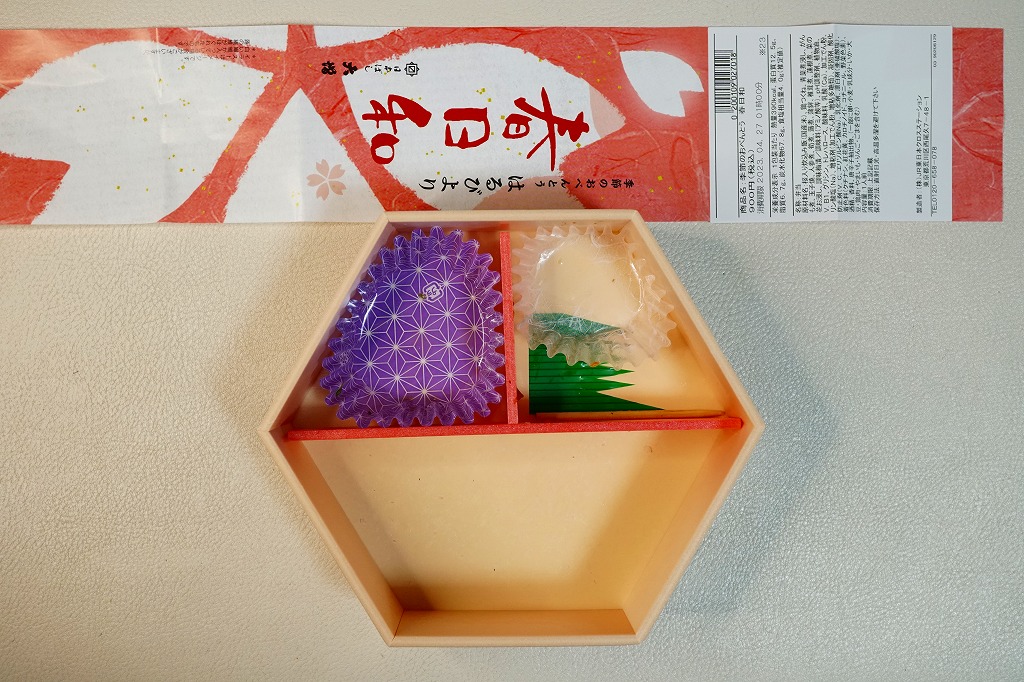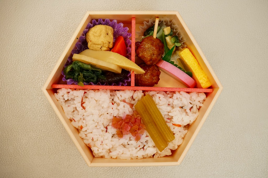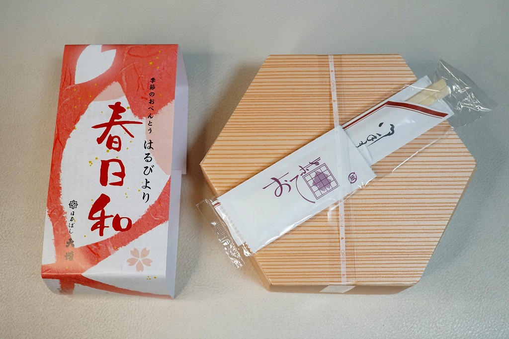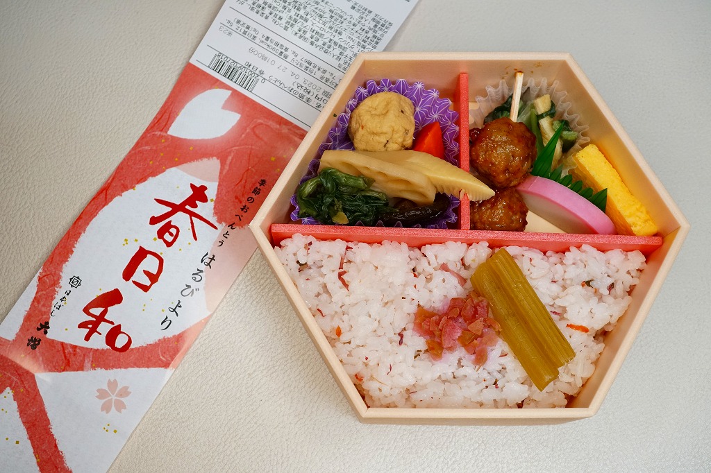 2021(令和3)年の春に初めて販売か。その年には併売した、20年以上続いた季節の駅弁「たけのこおこわ弁当」に代わり、3月から5月まで東京で売られる、駅やデパ地下のお弁当。正六角形の容器を3つに仕切り、半分におこわでない桜入り炊込み飯を、残りの半分にタケノコやニンジンやがんもなどの煮物を、残りに蒲鉾と玉子焼と鶏つくねと菜の花お浸しを詰める。分量と構成と品質が確保された、東京では貴重な、1,000円でお釣りが来る駅弁。調製元は2023年4月から「日本ばし大増」ブランドのJR東日本クロスステーション。