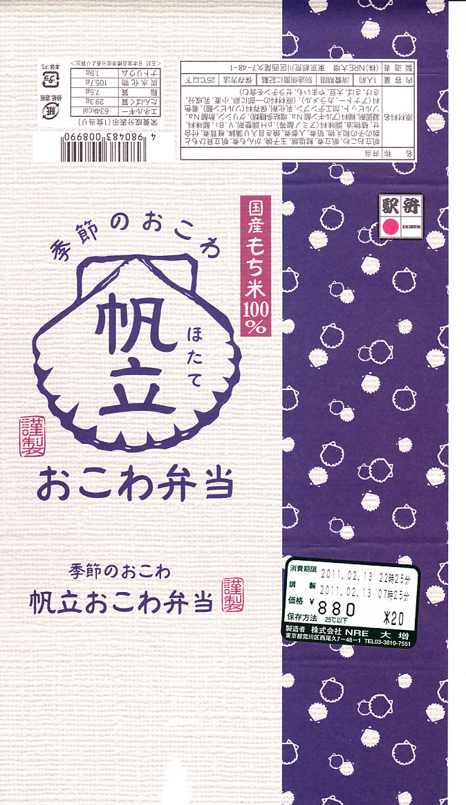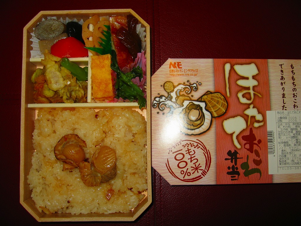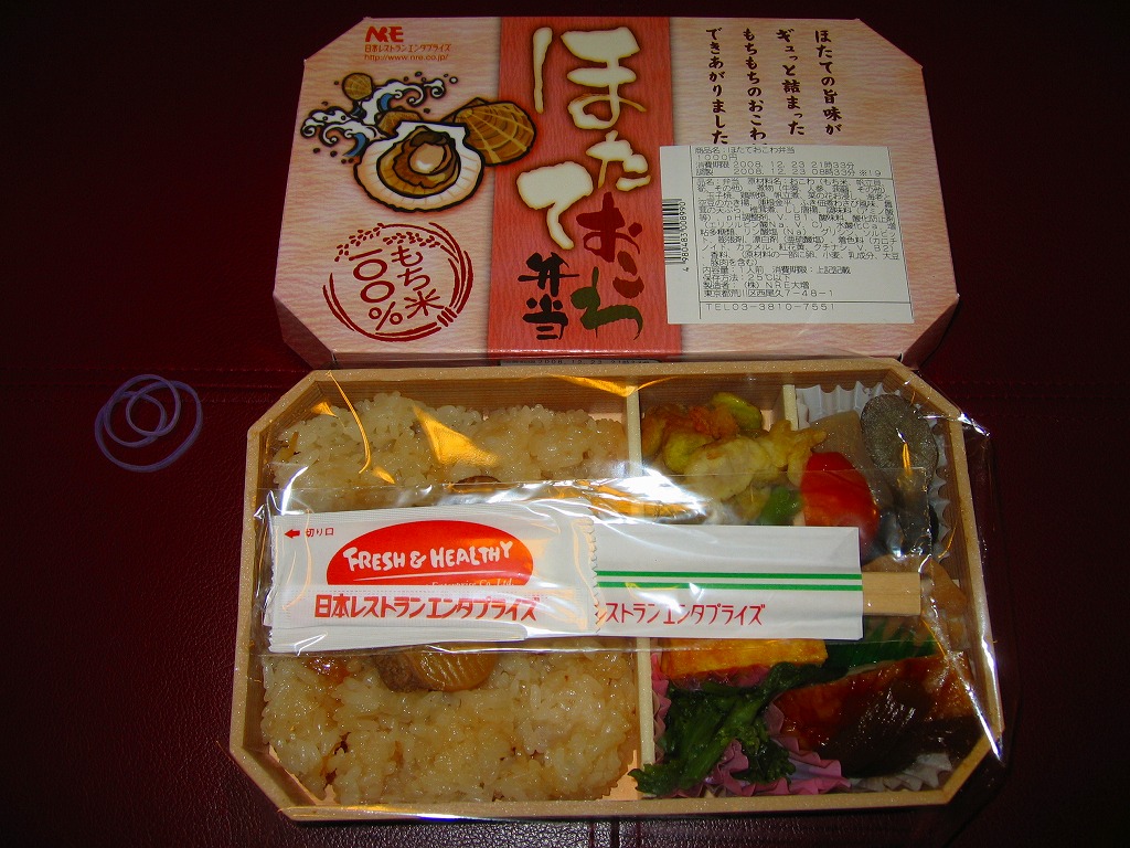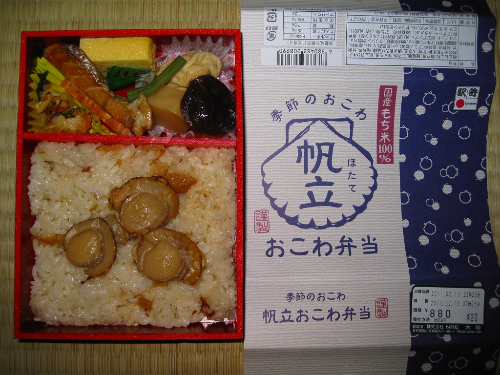 NREの首都圏エリアの、季節のおこわ弁当の2010〜2011年の冬バージョン。2010年の「たけのこおこわ弁当」と同じく、下記の2008年版と比べて大きくリニューアル。黒塗りの赤い容器を使用、掛紙が青と白の冬色になり、中身は煮ホタテを3個置いたほたておこわに鮭塩焼、玉子焼、がんもやタケノコなどの煮物、ホタテのひもとカズノコの和え物など。