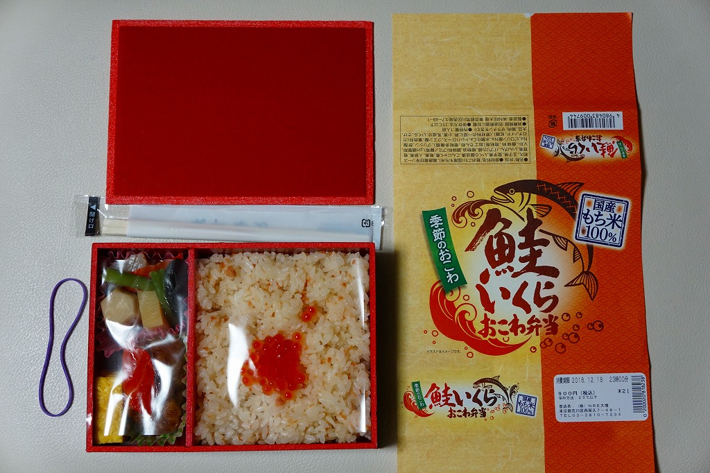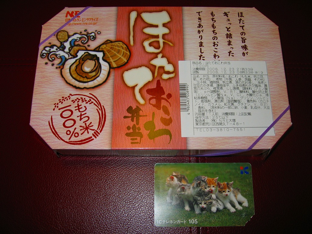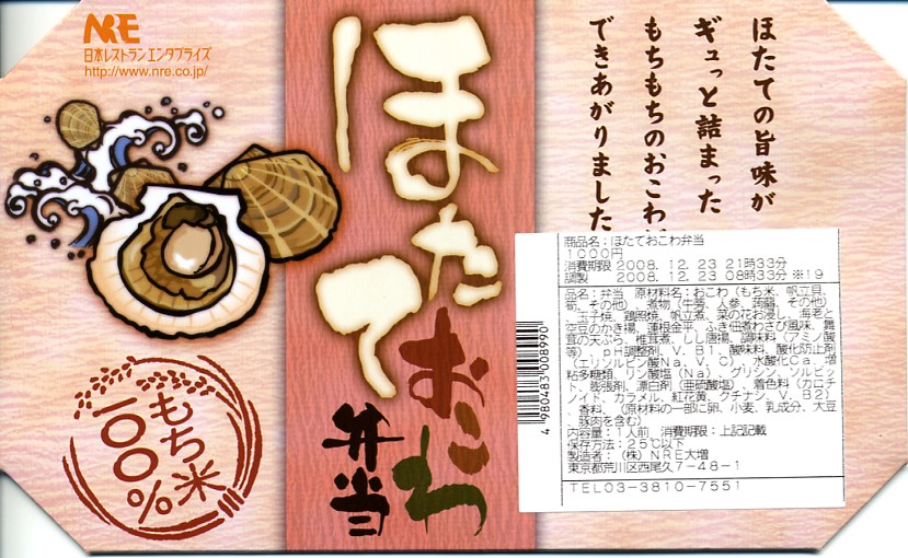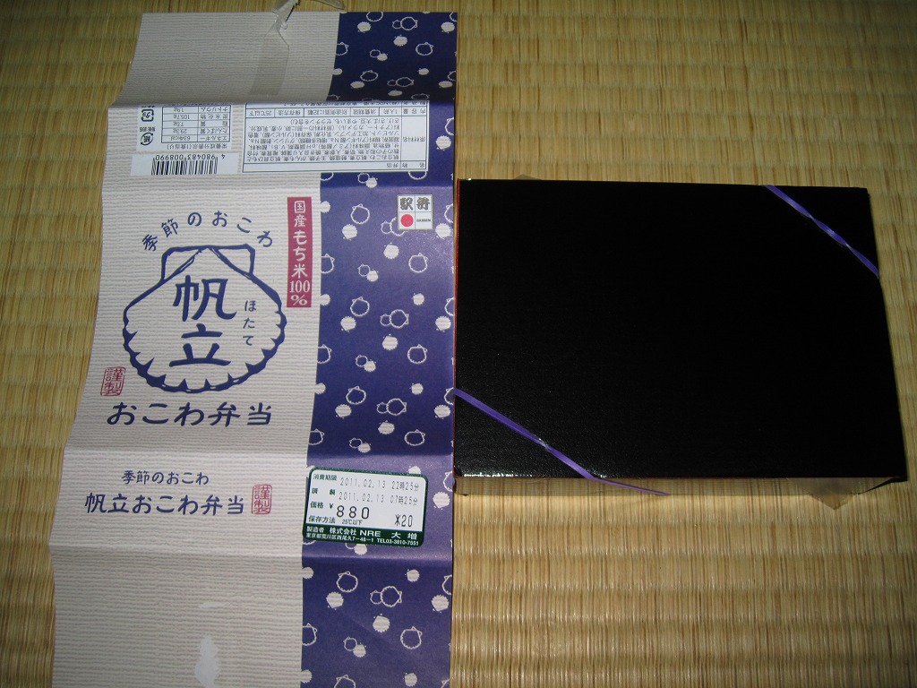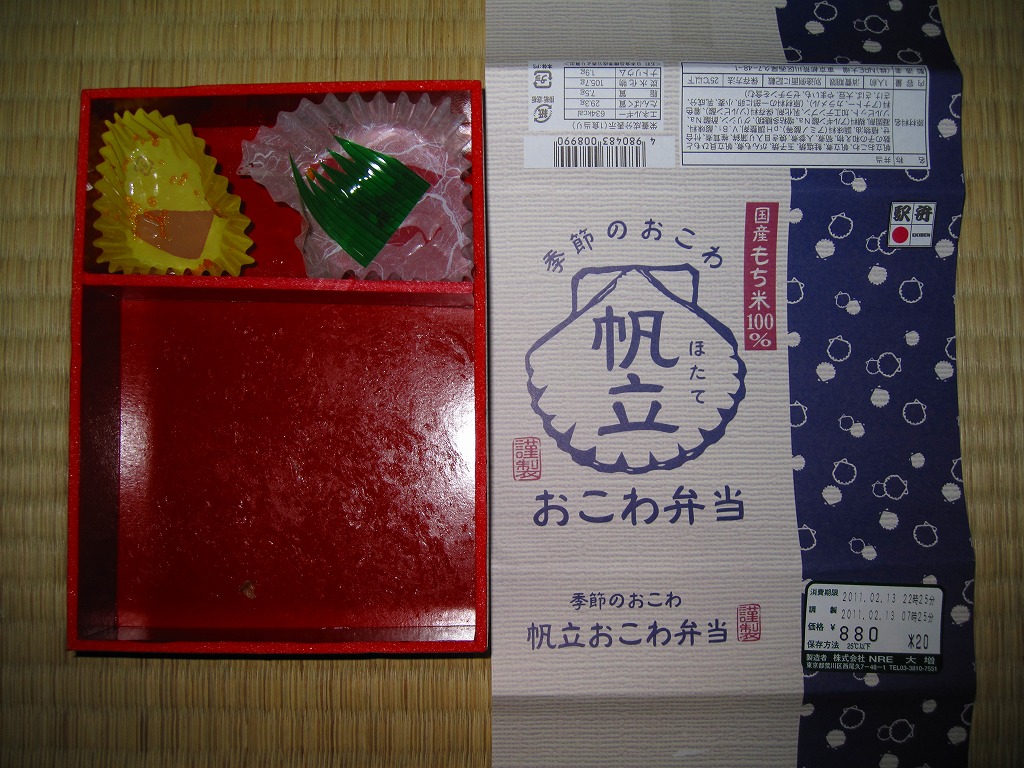 NREの首都圏エリアの、季節のおこわ弁当の2010〜2011年の冬バージョン。2010年の「たけのこおこわ弁当」と同じく、下記の2008年版と比べて大きくリニューアル。黒塗りの赤い容器を使用、掛紙が青と白の冬色になり、中身は煮ホタテを3個置いたほたておこわに鮭塩焼、玉子焼、がんもやタケノコなどの煮物、ホタテのひもとカズノコの和え物など。