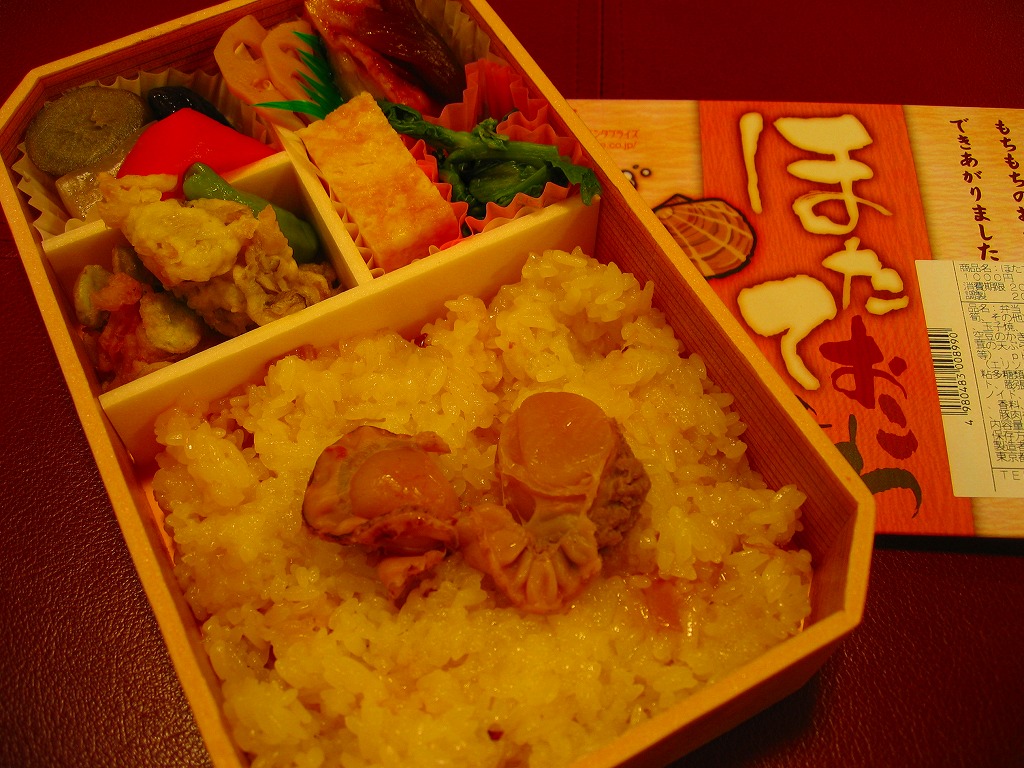 冬の駅弁「ほたておこわ弁当」は、2008(平成20)年12月に初登場か。このシリーズで使われるいつもの容器を使用、半分に帆立貝柱やタケノコを混入してベビーホタテ煮2個を載せた、駅弁の名前どおりのほたておこわを詰め、半分はおかずで玉子焼、ニンジンやシイタケなどの煮物、鶏照焼、エビとソラマメのかき揚げ、菜の花など。千円でお釣りが来ないものの、餅米に混入する帆立貝柱の分量を考えると、それなりのもの。幕の内や牛肉弁当よりお得かと言われれば、そうでもなし。