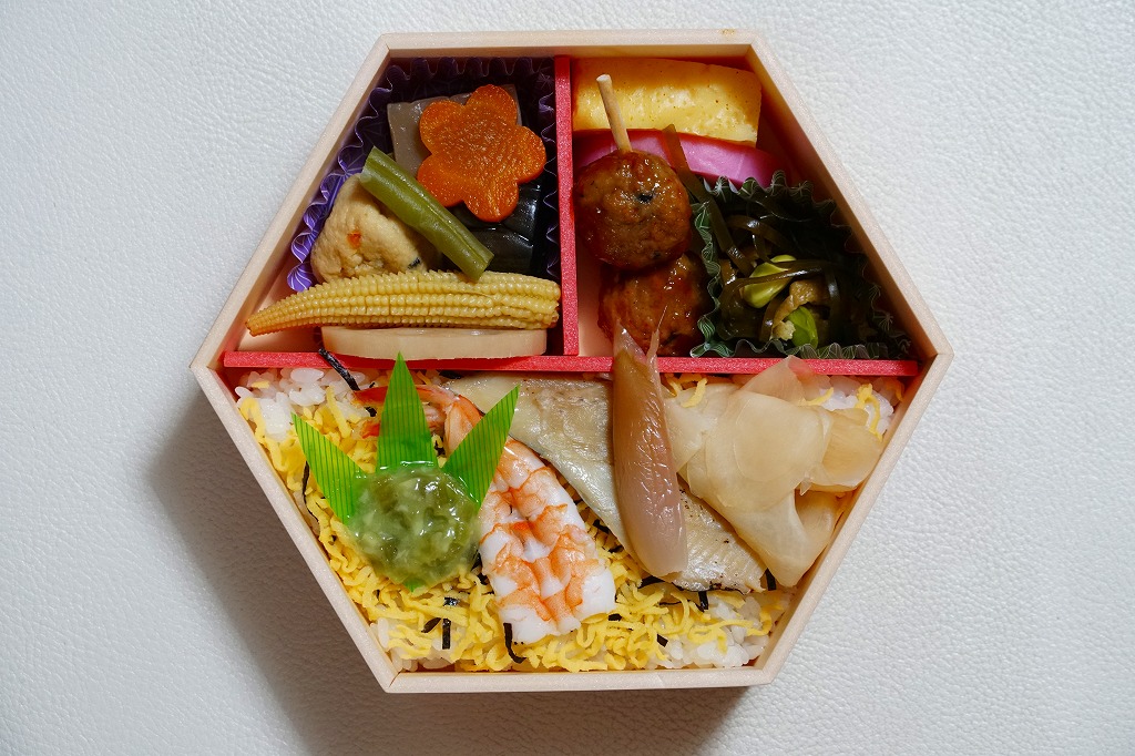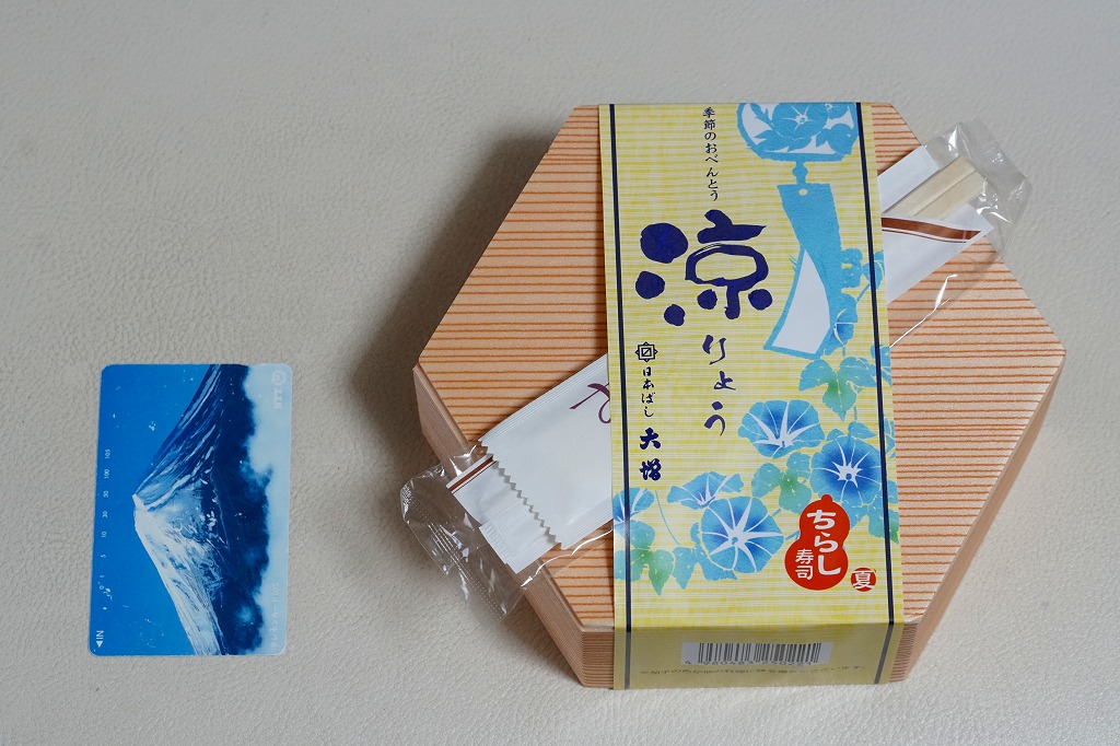 2021(令和3)年5月の発売か。20年以上続いた季節の駅弁「あさりおこわ弁当」に代わり、5月から8月まで東京で売られる、駅やデパ地下のお弁当。正六角形の容器を3つに仕切り、半分で酢飯をアナゴと生姜と海老と錦糸卵と刻み海苔と味付わさびで覆い、残る半分にナスやがんもどきやヤングコーンなどの煮物、残りにかまぼこ、玉子焼、鶏つくね、切昆布煮を詰める。掛紙で「ちらし寿司」を名乗るも、内容はまるで酢飯と小柄の幕の内弁当のよう。東京なのに千円以下で買える、有難い存在。