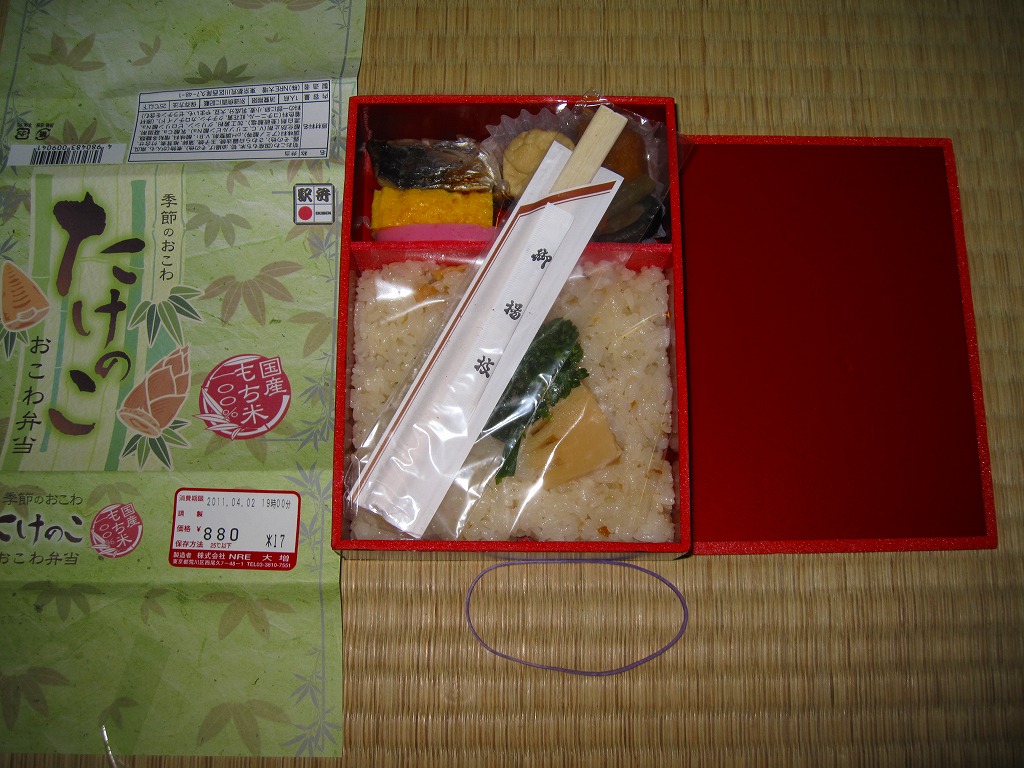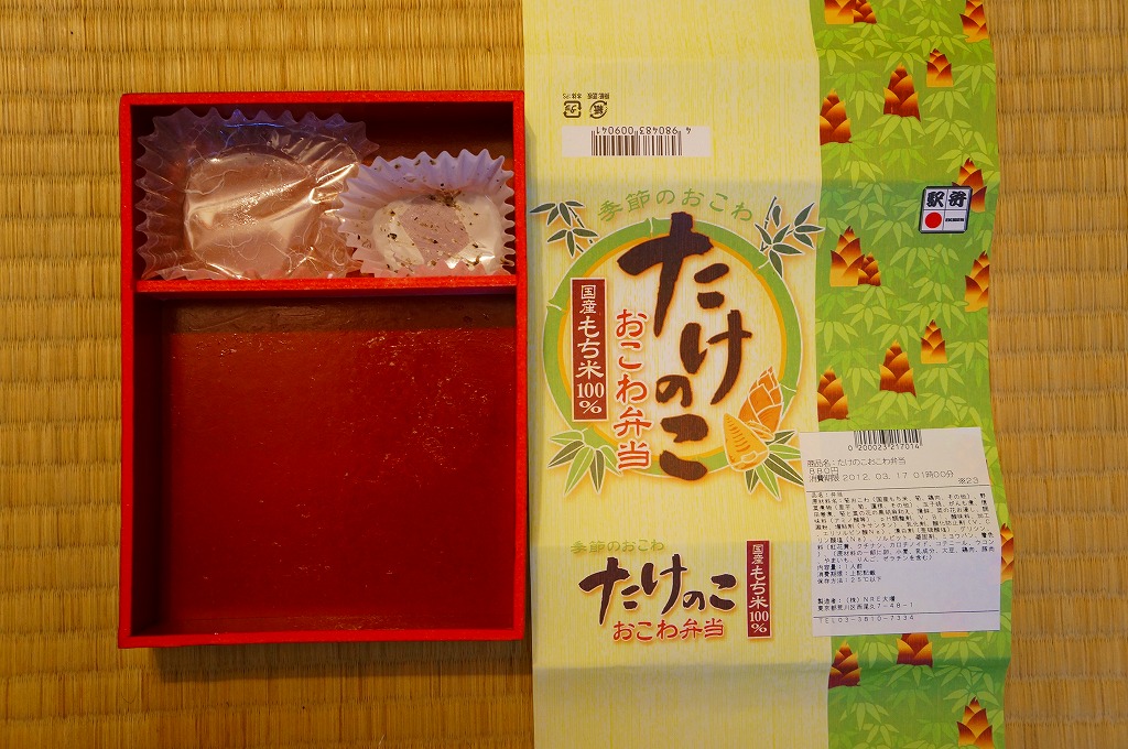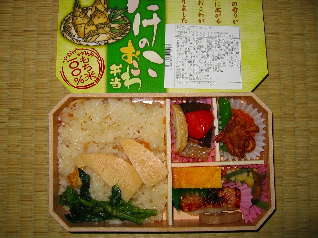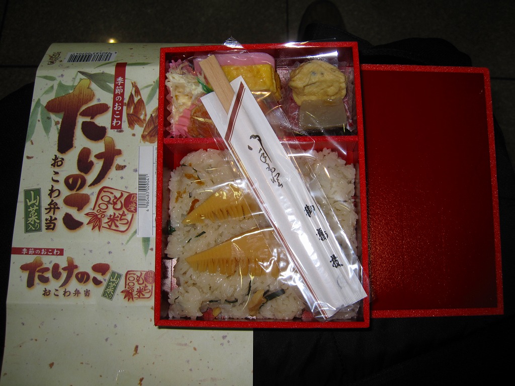 下記の駅弁「たけのこおこわ弁当」の2010年の春バージョンで、見てのとおり今回は大きくリニューアル。黒塗りの赤い容器を使用、駅弁の名前などを描いた淡い緑色の掛紙を巻く。中身は山菜入りたけのこおこわに、かまぼこ、玉子焼、鮭塩焼、こんにゃくなどの煮物、たけのこサラダ。おかずがシンプルになり、しかし幕の内駅弁の定義に合うレベルでは残り、しかし価格が120円下がり、メインのおこわがよりふっくらもちっとなったのではと思う。
