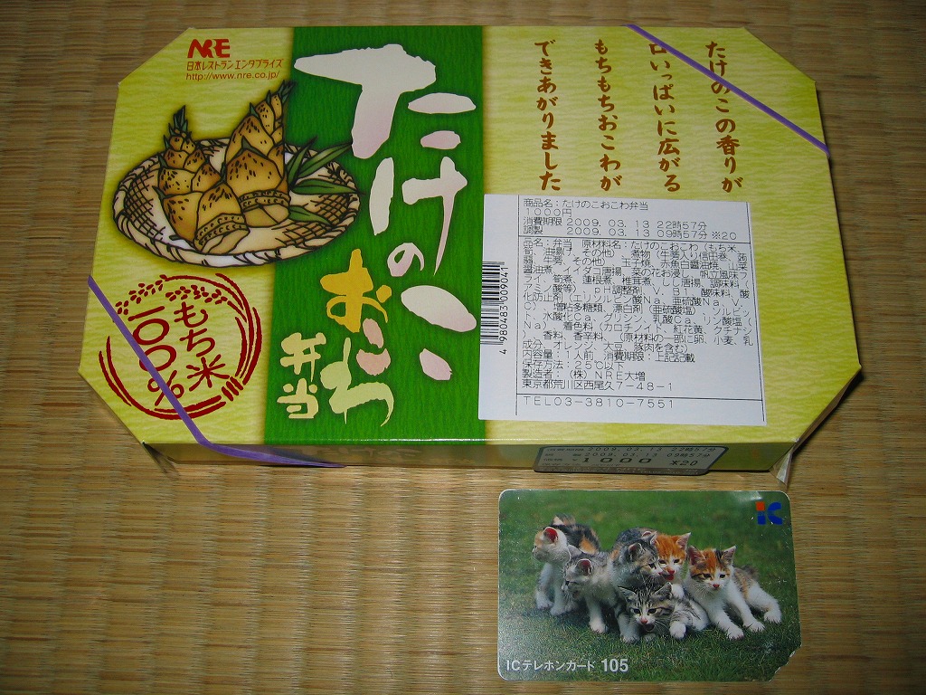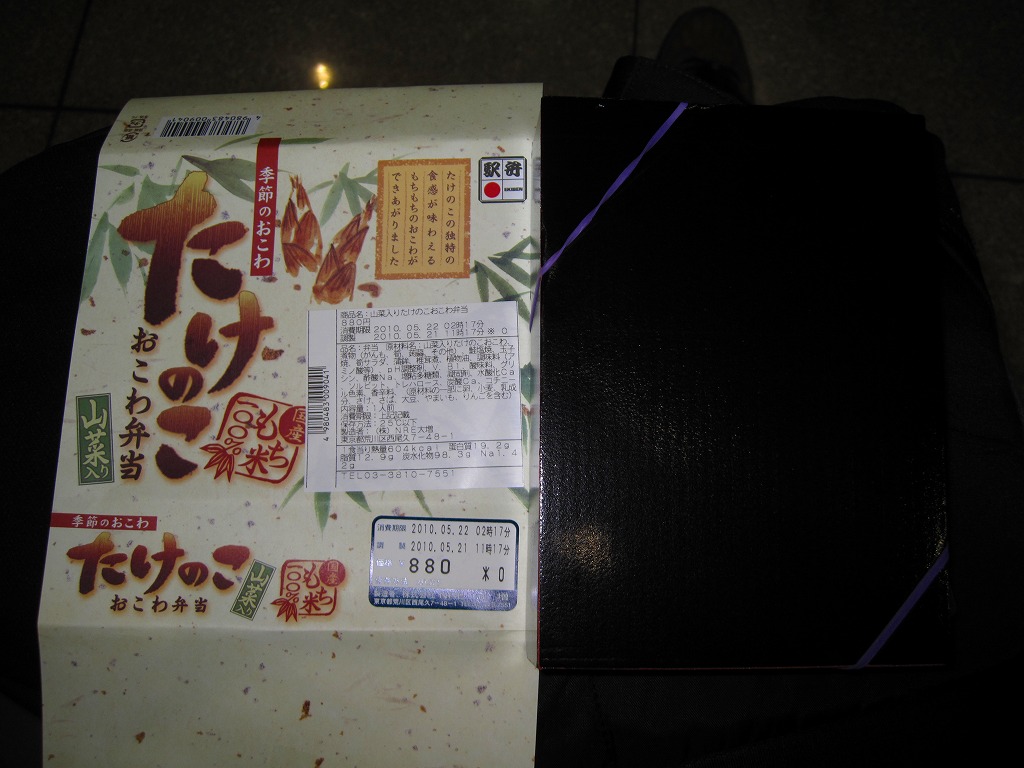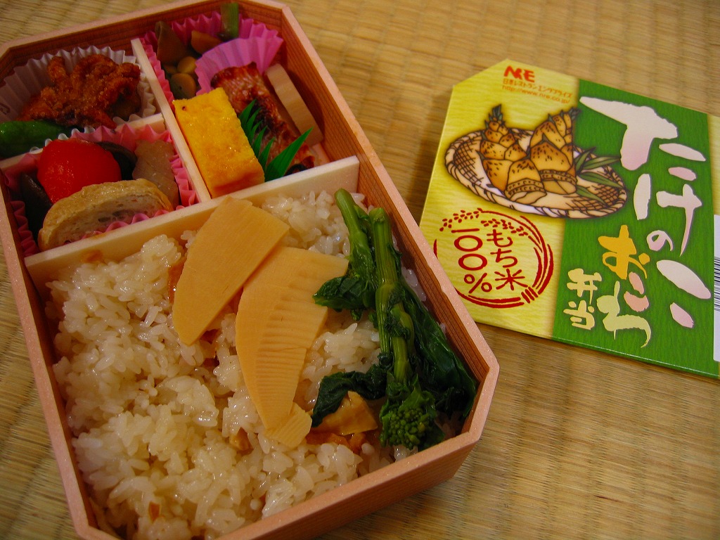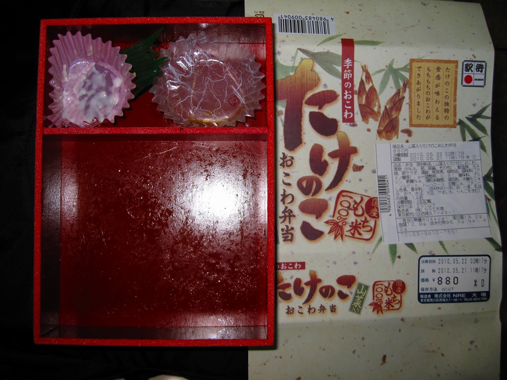 下記の駅弁「たけのこおこわ弁当」の2010年の春バージョンで、見てのとおり今回は大きくリニューアル。黒塗りの赤い容器を使用、駅弁の名前などを描いた淡い緑色の掛紙を巻く。中身は山菜入りたけのこおこわに、かまぼこ、玉子焼、鮭塩焼、こんにゃくなどの煮物、たけのこサラダ。おかずがシンプルになり、しかし幕の内駅弁の定義に合うレベルでは残り、しかし価格が120円下がり、メインのおこわがよりふっくらもちっとなったのではと思う。