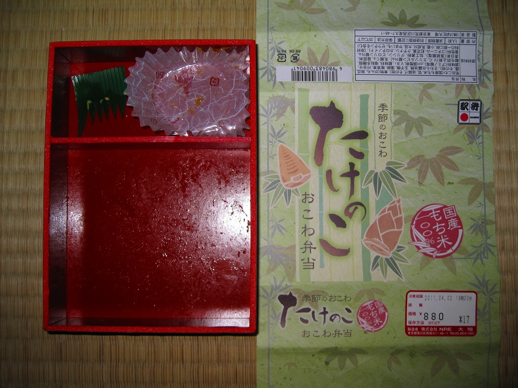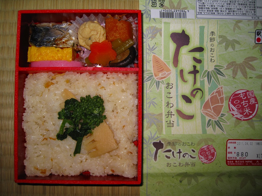NREの首都圏エリアの、季節のおこわ弁当の20111年の春バージョン。前年の同じ名前の駅弁と比べて、容器や価格は変わっておらず、掛紙のデザインが変わり、御飯の上に載るタケノコが1切れに減り、鮭塩焼がサワラ白醤油焼に変わり、たけのこサラダが消えて煮物が増えた。