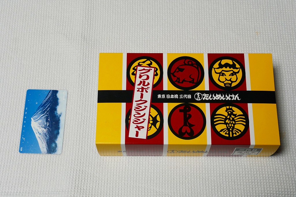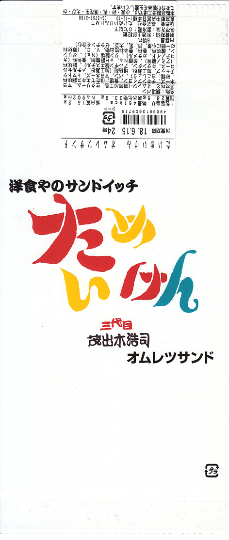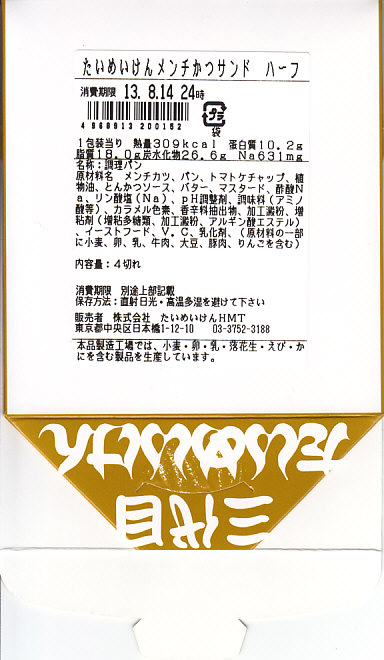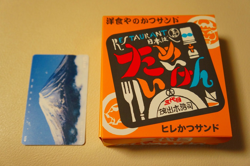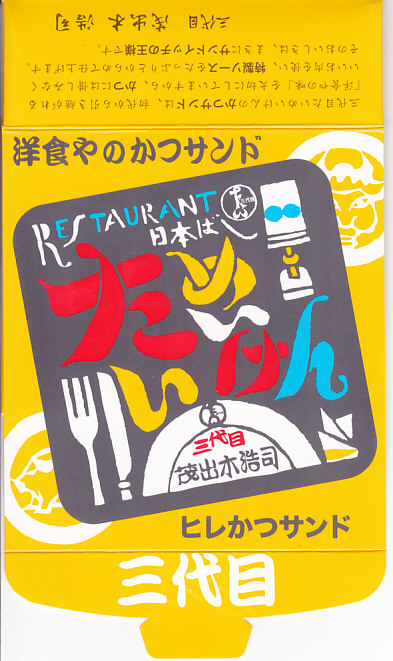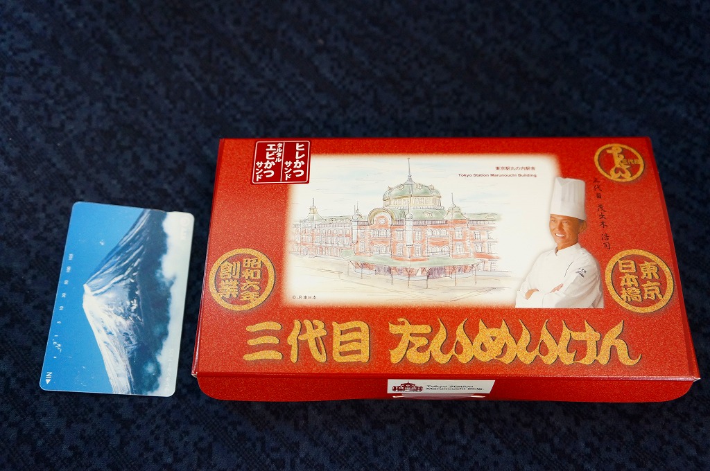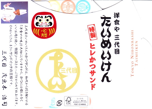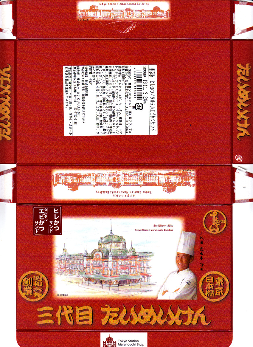 中身はつまり、都内のデパ地下や空港や駅でおなじみの、「三代目たいめいけん」を名乗るサンドイッチで、ヒレかつサンドとタルタルエビかつサンドをそれぞれ2切れ詰めた透明な袋を箱に詰める。紙箱にその東京駅舎を描くことで、東京駅限定商品となる。商魂たくましいなと思う。この箱では2013年頃まで、商品自体は2017年までの販売か。