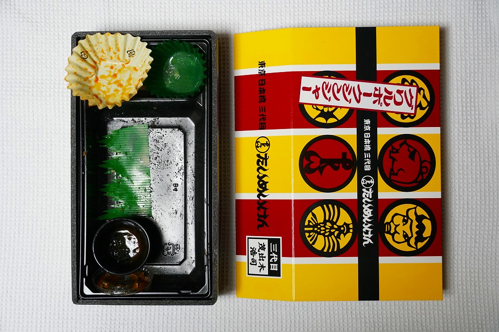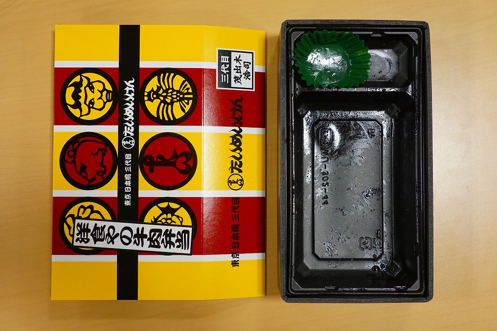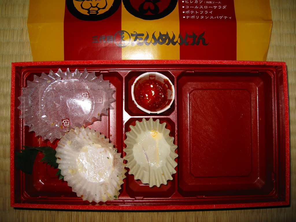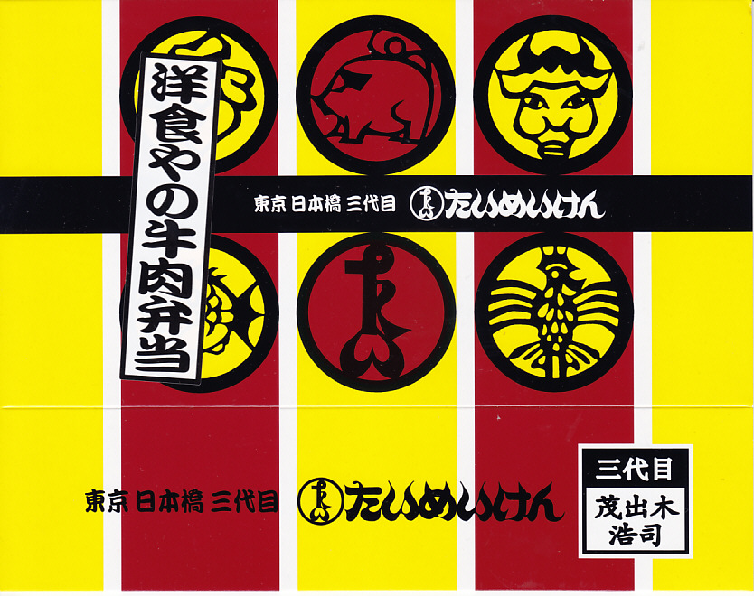 羽田空港や東京都内で2009(平成21)年から増殖を続けている、たいめいけんブランドの弁当類のひとつとして、2010年5月までには発売か。黒塗りの赤い容器を使用、一連のたいめいけん商品と同じ意匠の掛紙を巻く。