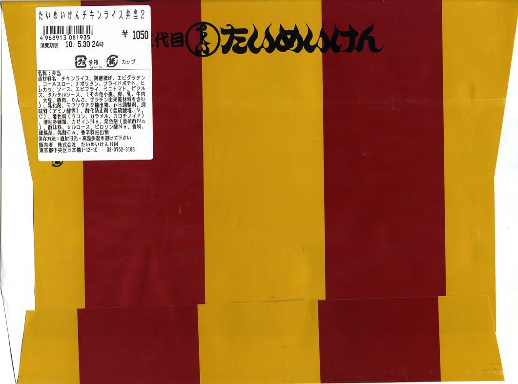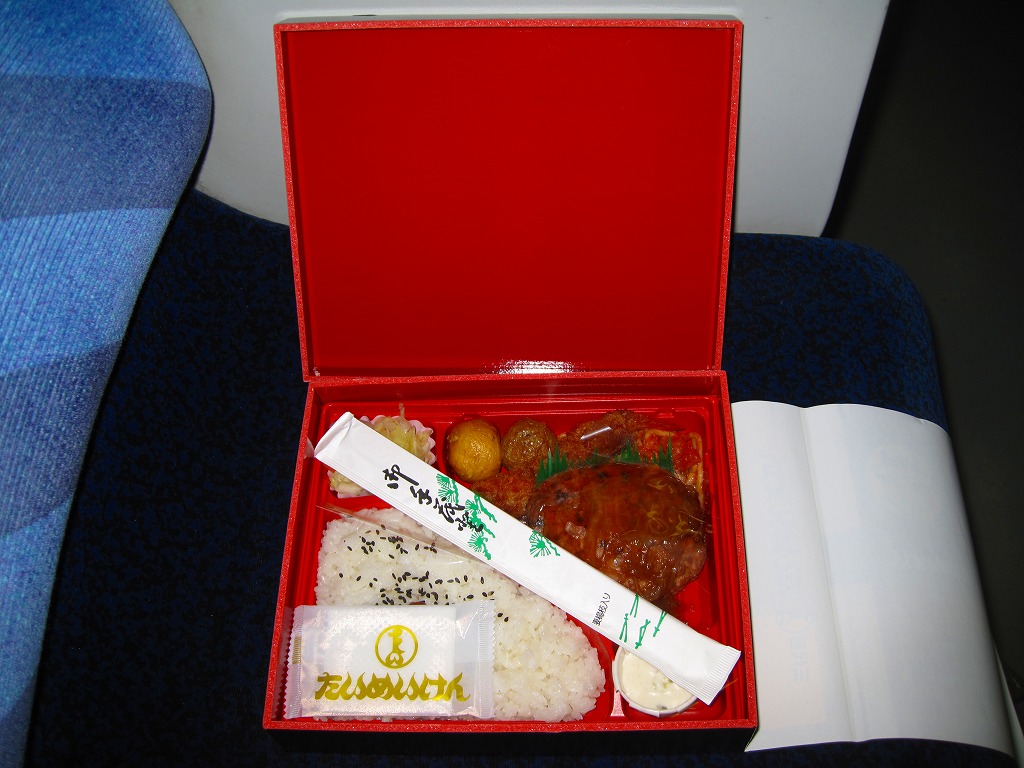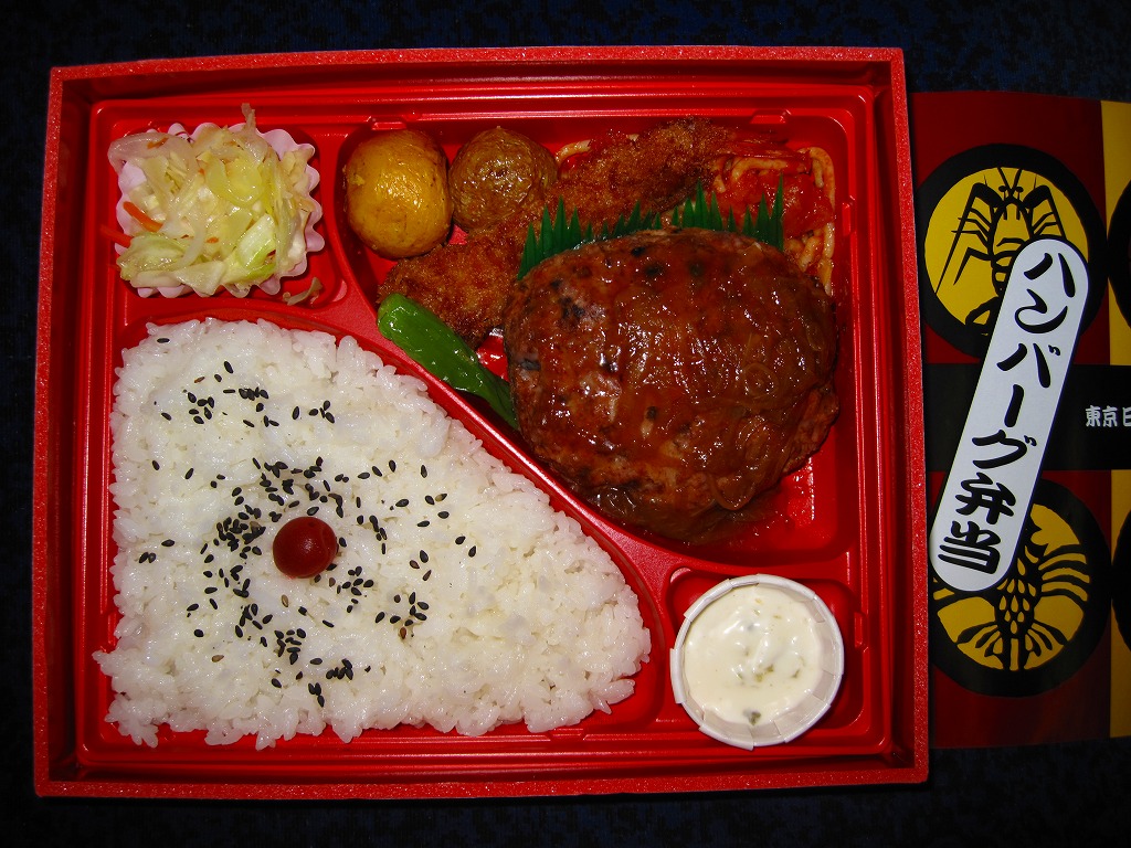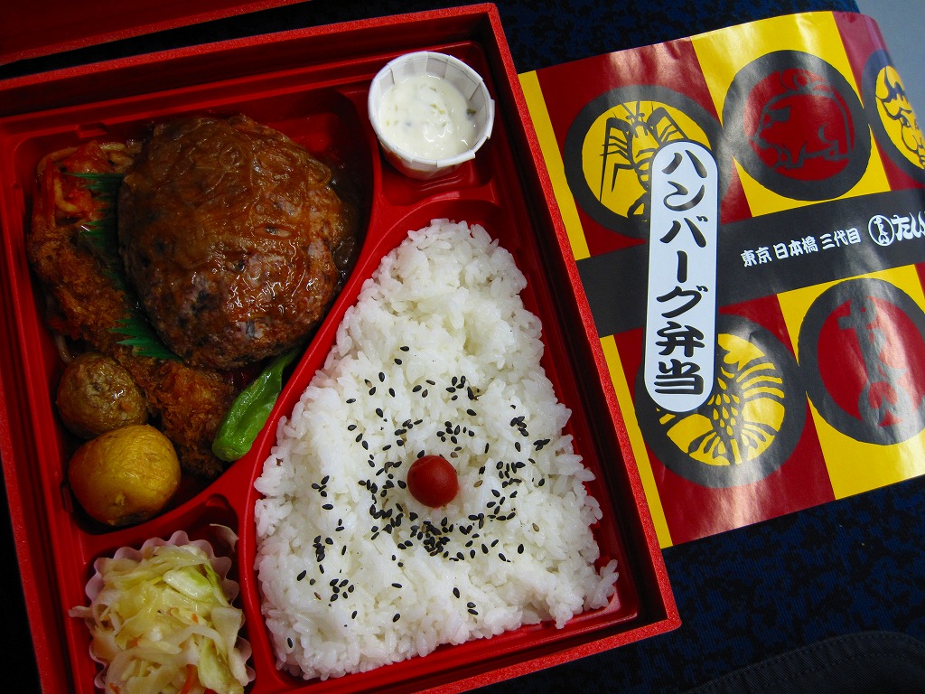 2009(平成21)年から急に羽田空港や東京都内で涌いてきた、たいめいけんブランドの弁当類のひとつ。黒塗りの容器に、このブランドのイメージイラストだと思うデザインの掛紙を巻く。中身は白御飯にハンバーグ、エビフライ、スパゲティ、ポテトフライと書いてある小イモふかし、ししとう、コールスローという、典型的なハンバーグ弁当。東京の日本橋で有名な老舗の洋食屋の味と言われれば、そうなのかなとは思うけれど、冷めてもおいしい弁当かと言われれば、そうではないと思う。2019年までの販売か。