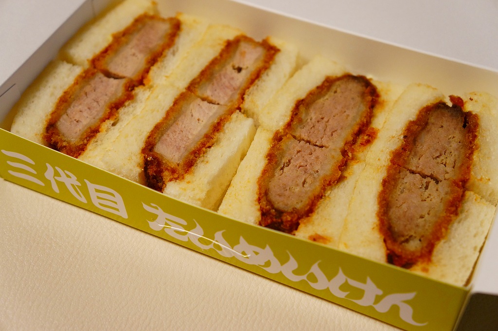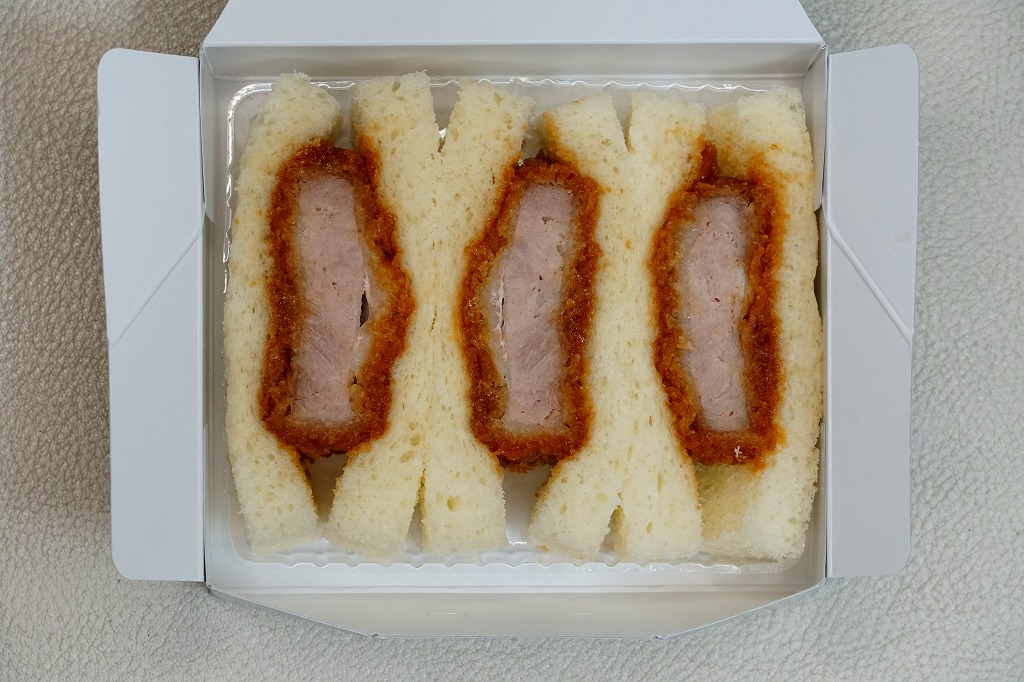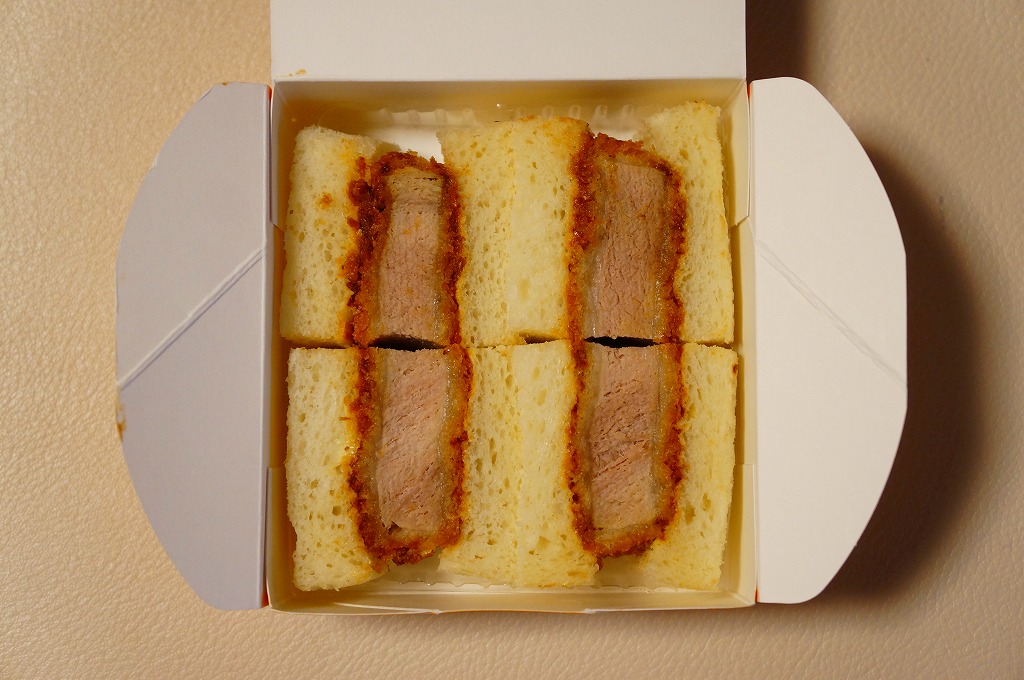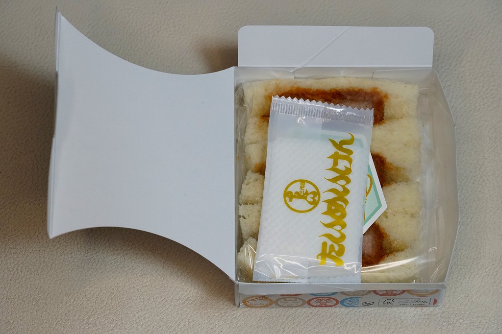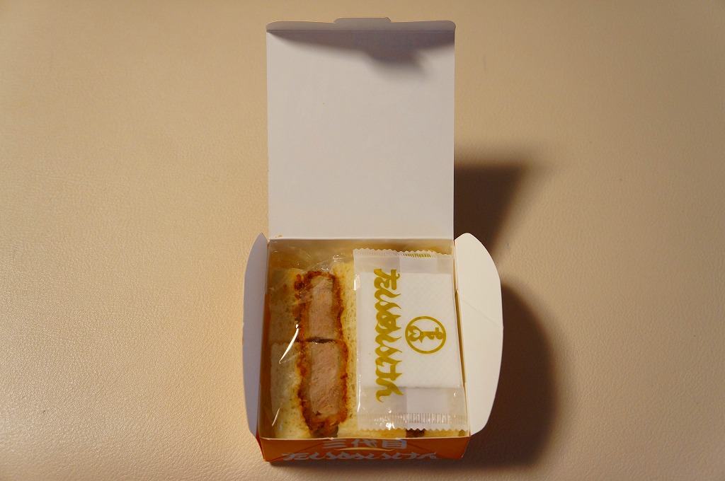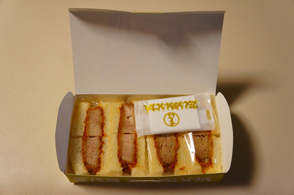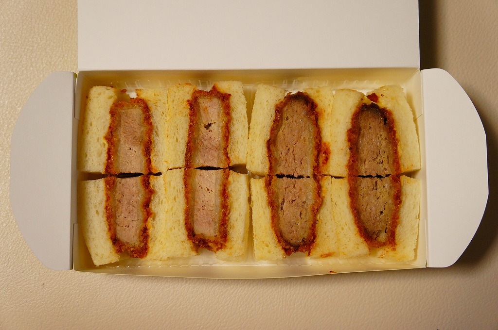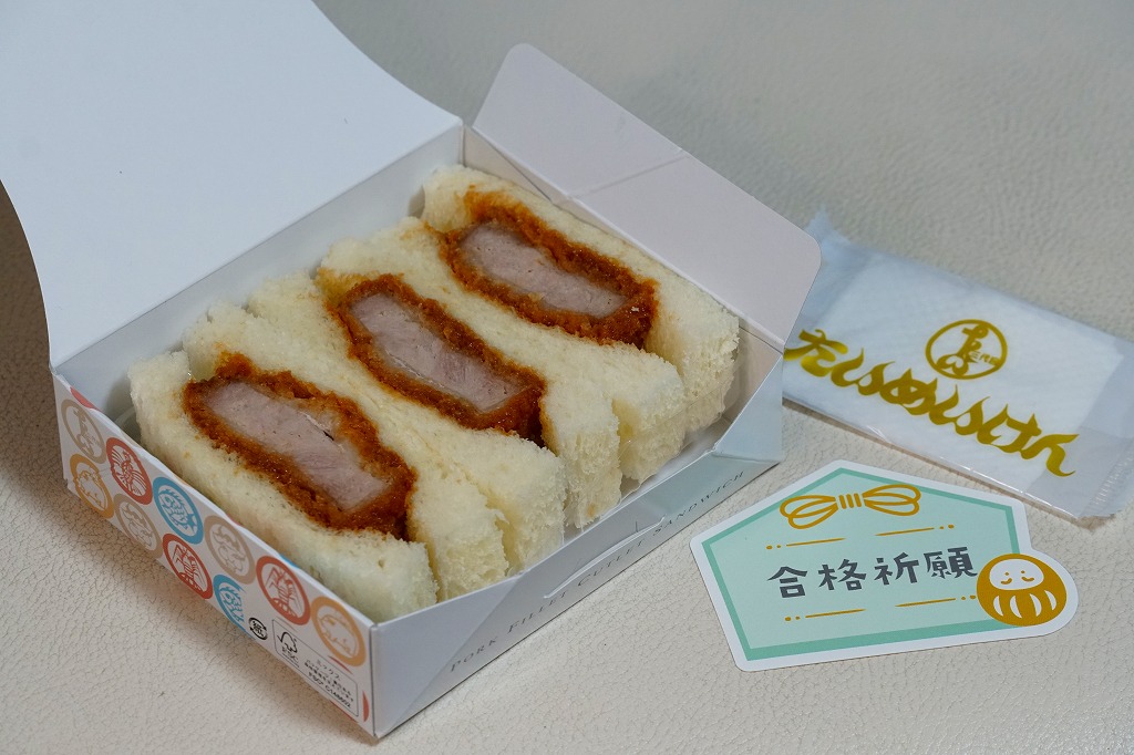 小さな専用の紙箱に、透明なプラ製トレーに並べた、ヒレカツのソース付けを耳なし食パンで挟んだ、とても小さなカツサンドが3切れ。駅で見ない間に調製元が東京都大田区の食肉加工業者に変わり、外装が明るく替わり、形状が都内のデパ地下で同じようによく見かける「まい泉」の紙箱入りカツサンドに似てきた。また、受験シーズンに買ったためか、紙箱に「必勝」だるまのシールを貼り、中身に「合格祈願」の紙片が付いていた。