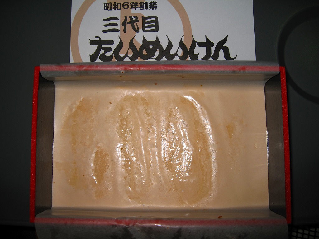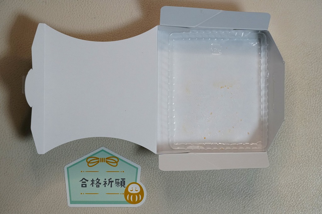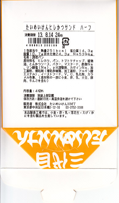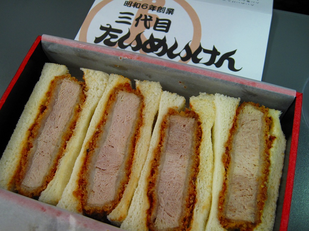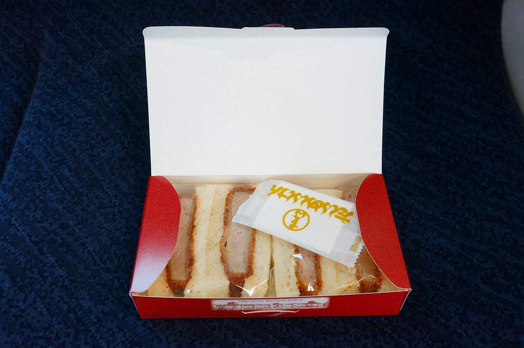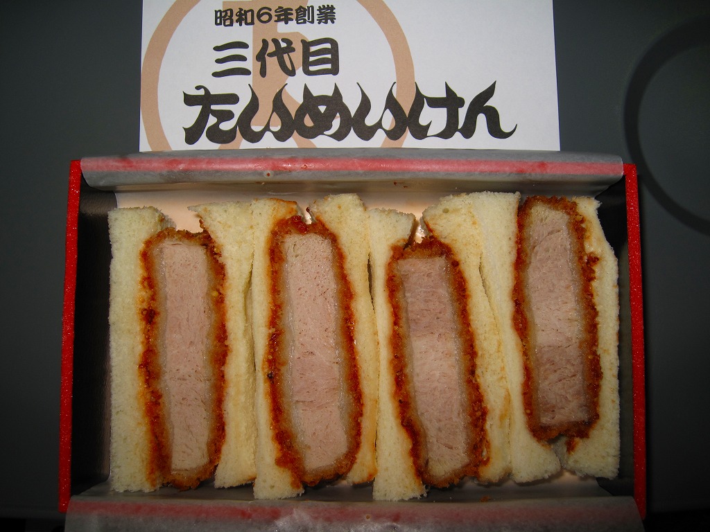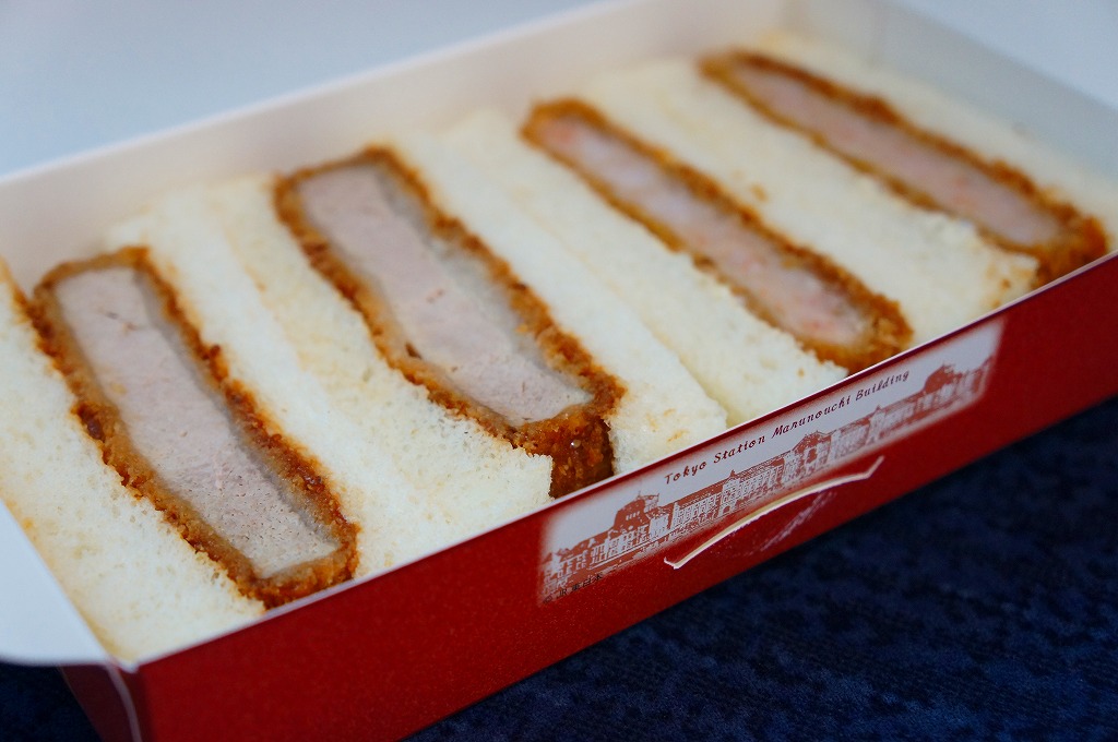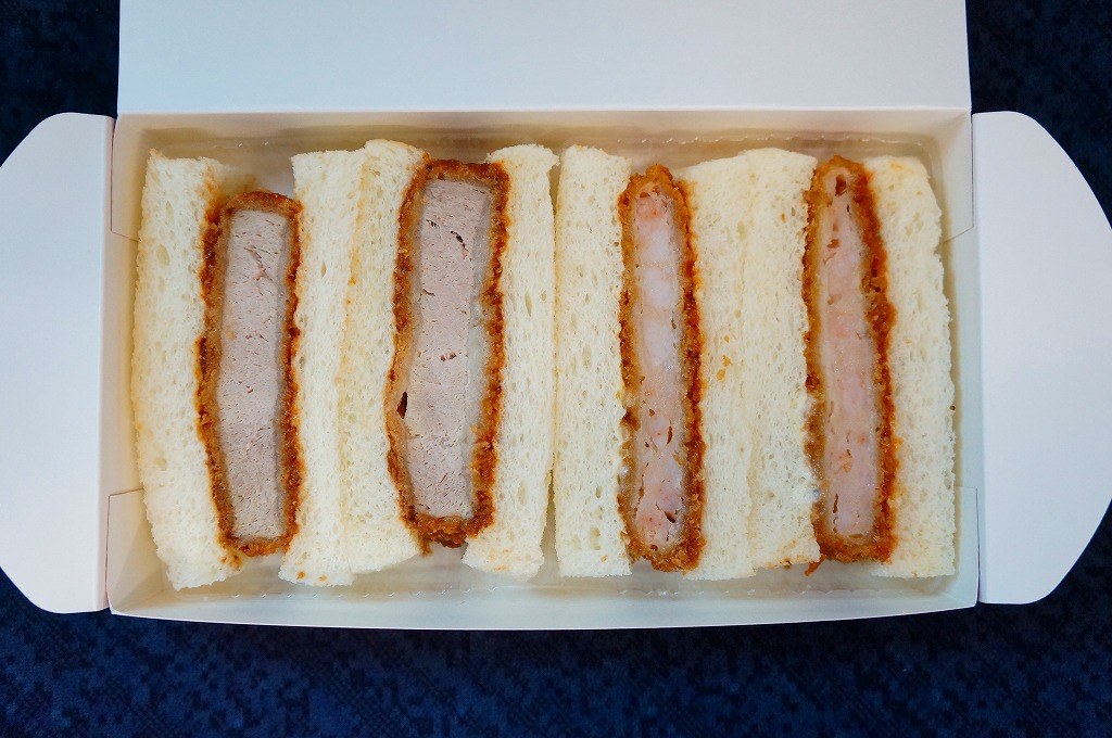 小さな専用の紙箱に、透明なプラ製トレーに並べた、ヒレカツのソース付けを耳なし食パンで挟んだ、とても小さなカツサンドが3切れ。駅で見ない間に調製元が東京都大田区の食肉加工業者に変わり、外装が明るく替わり、形状が都内のデパ地下で同じようによく見かける「まい泉」の紙箱入りカツサンドに似てきた。また、受験シーズンに買ったためか、紙箱に「必勝」だるまのシールを貼り、中身に「合格祈願」の紙片が付いていた。