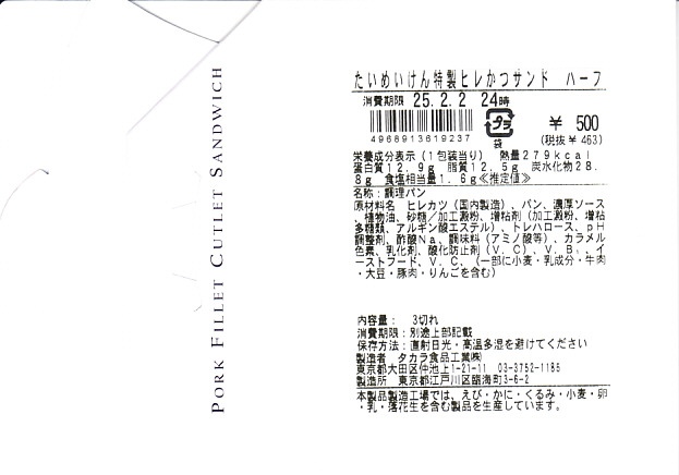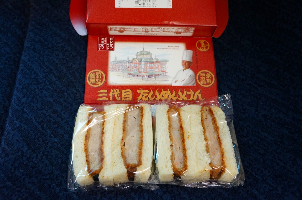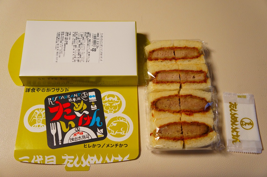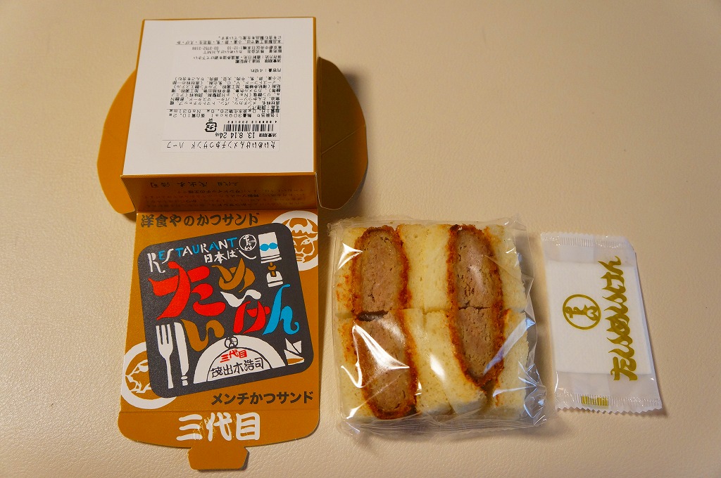 2025(令和7)年2月に、新横浜駅の駅弁売り場で購入。下記のとおり2010年代に東京の駅弁売店でよく売られた「たいめいけん」ブランドの弁当やカツサンドは、2020年の新型コロナウイルス感染症の流行の頃から駅ではみられなくなっており、5年ぶり久々に駅で出会えた。