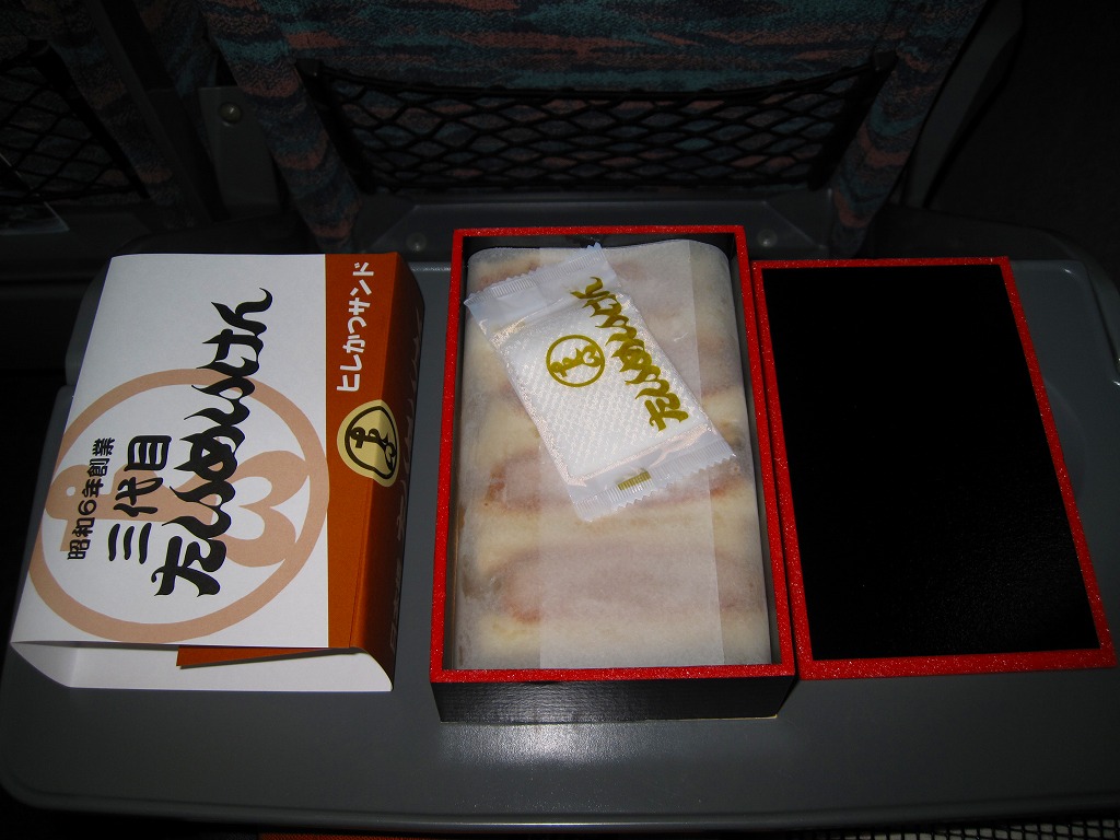 2009(平成21)年のこの頃から駅へ進出してきた、東京日本橋で有名な洋食屋のブランドを名乗るカツサンド。黒い小さな箱に同じ素材でふたをして、商品名を書いたやや厚手な掛紙を巻く。中身はカツサンドが4切れですべて。880円もするほど、老舗の店名を名乗るほど素晴らしくはない、普通の今風なカツサンドという感じ。この弁当は2020年頃から、駅ではその姿を見ていない。