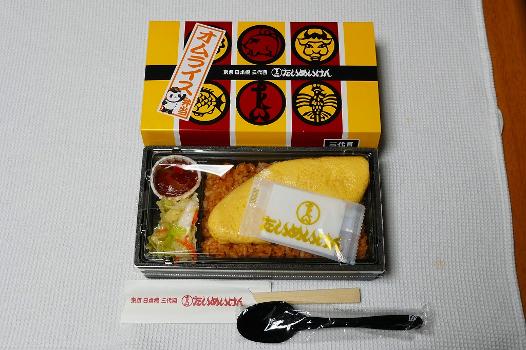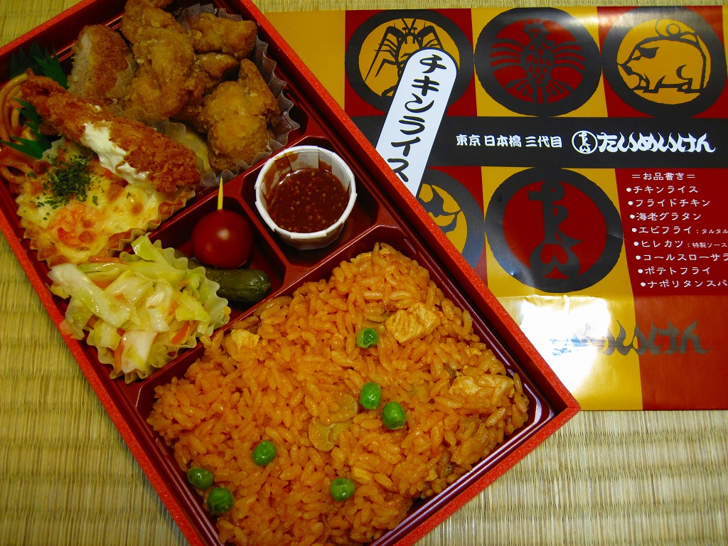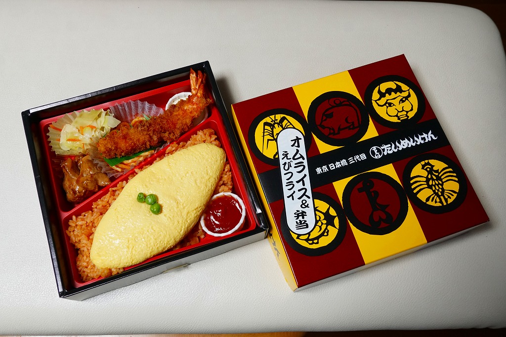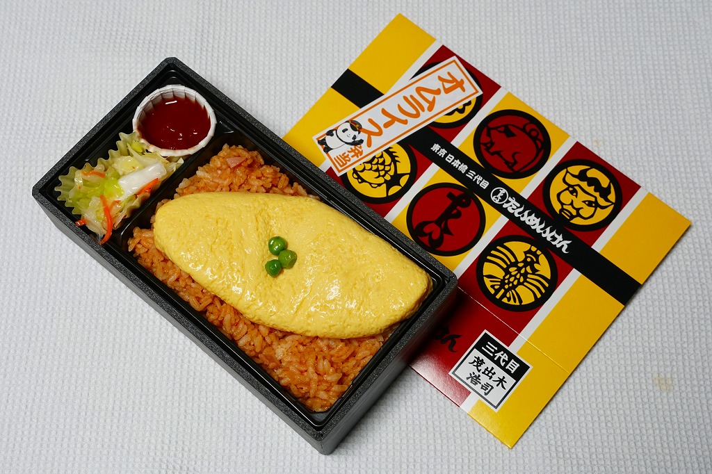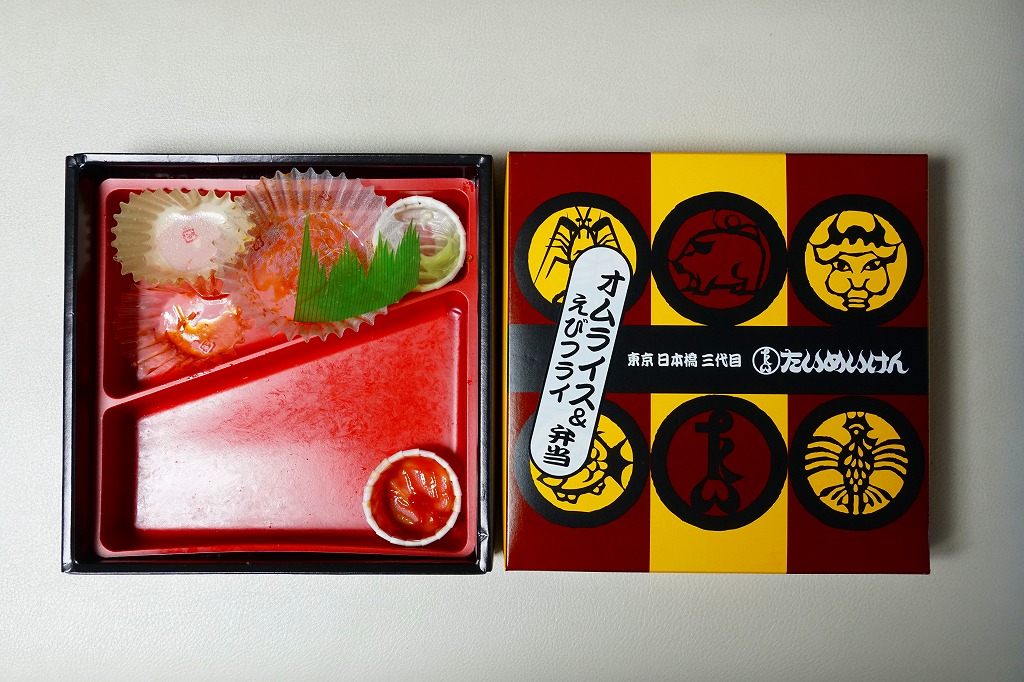 東京の駅や空港やデパ地下でおなじみの、「三代目たいめいけん」ブランドのお弁当のうちひとつで、2016(平成28)年までには登場していた模様。ケチャップライスにふわとろオムレツをのっそり載せ、エビフライ一尾に鶏肉やスパゲティやタルタルソースを添えるお惣菜。この弁当は2020年頃から、駅ではその姿を見ていない。
