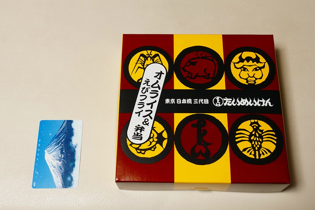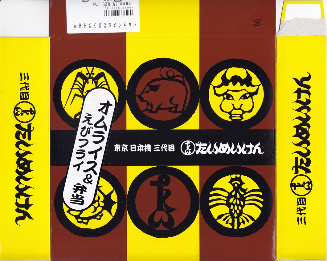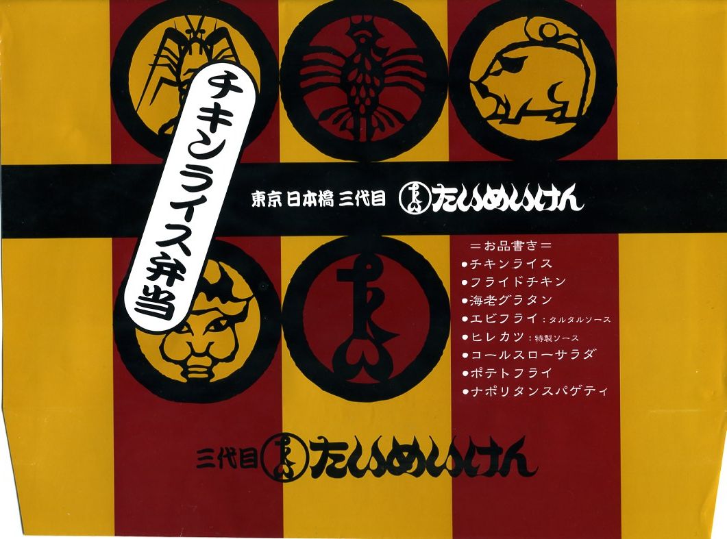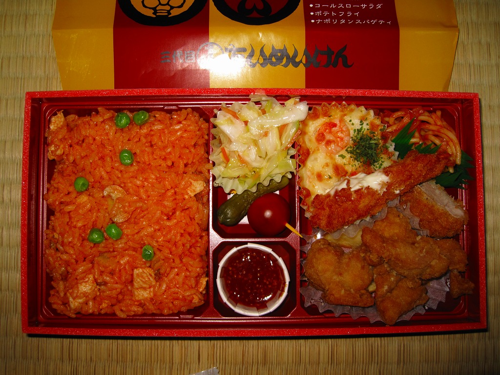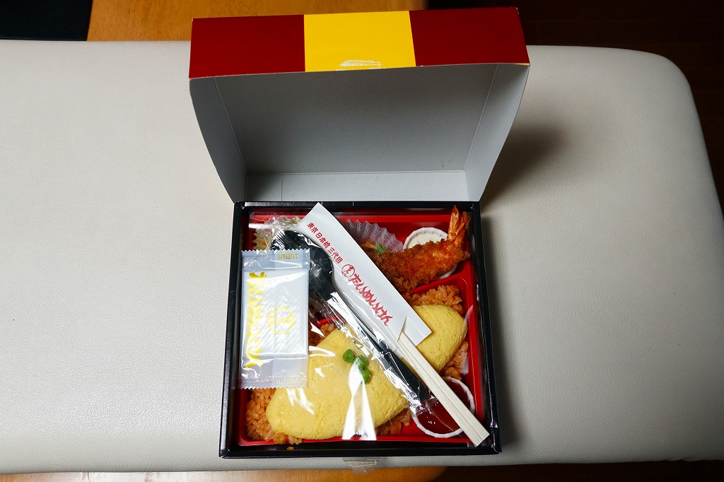 東京の駅や空港やデパ地下でおなじみの、「三代目たいめいけん」ブランドのお弁当のうちひとつで、2016(平成28)年までには登場していた模様。ケチャップライスにふわとろオムレツをのっそり載せ、エビフライ一尾に鶏肉やスパゲティやタルタルソースを添えるお惣菜。この弁当は2020年頃から、駅ではその姿を見ていない。