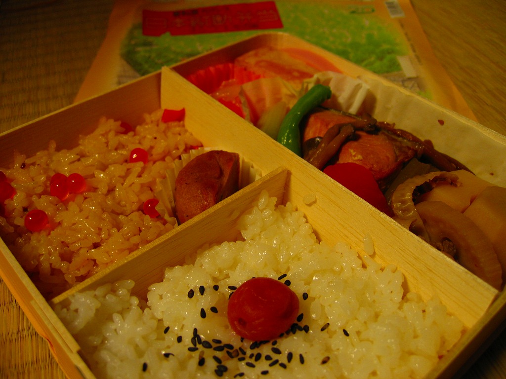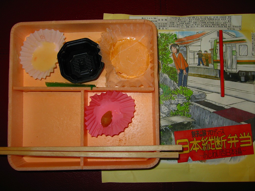 中身は「四国・九州編」ということで、かしわめしが1/4、明太子とカツオふりかけを載せた白御飯に大学芋を添えて1/4、残りはおかずで玉子焼、かまぼこ、豚肉照焼、ナスのオランダ煮、オリーブ、薩摩揚、筑前煮、パパイヤかぼすなど。コンテンツをあれこれと詰めすぎて、個々の食材や分量がチープな感じになった印象。これならば四国と九州をちゃんと分けて作ったほうが良かったと思う。