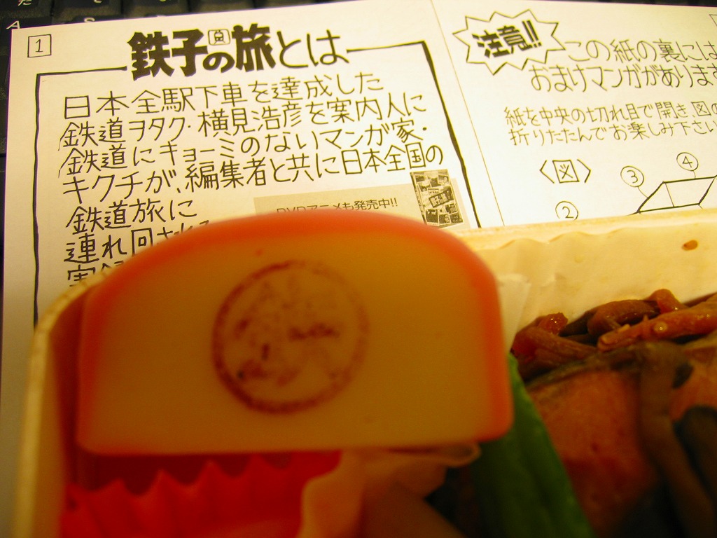 A4用紙の両面を使い、イラストを使ったおしながきと、漫画で描いたこの駅弁の誕生ストーリーを載せる。これは中身や分量をどうこう言うより、掛紙を眺めてしおりを読んで楽しむ駅弁だと思うし、経木折風の容器に掛紙をかけた駅弁らしいスタイルのほうにこそ、マンガ家や駅弁工場の思いが込められているような気がした。平凡な風味や内容も、汽車旅の道中食にはむしろ向くもの。