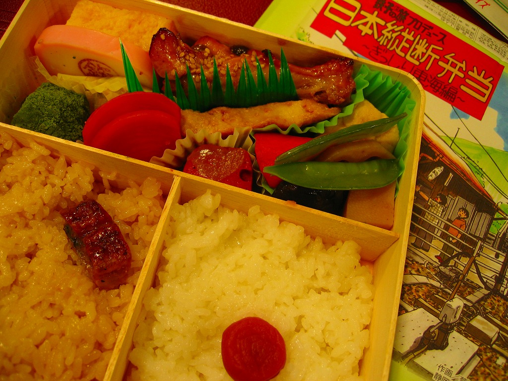 中身は掛紙ともども「東海編」ということで、日の丸御飯とウナギ付き茶飯、金目鯛ほう葉味噌焼、シイタケなどの煮物、手羽先、赤かぶ漬、抹茶わらびもちなど。千円という価格を考えると今回はちょっと割高な印象だが、国が仲裁に入るくらい激しいJR東日本とJR東海の不仲の中、JR東日本の100%子会社がよくぞ東海ネタの駅弁を出せたもの。伊豆半島も東海だ、と金目鯛を入れたという添付のマンガのネタに、裏話が隠れているのかもしれない。