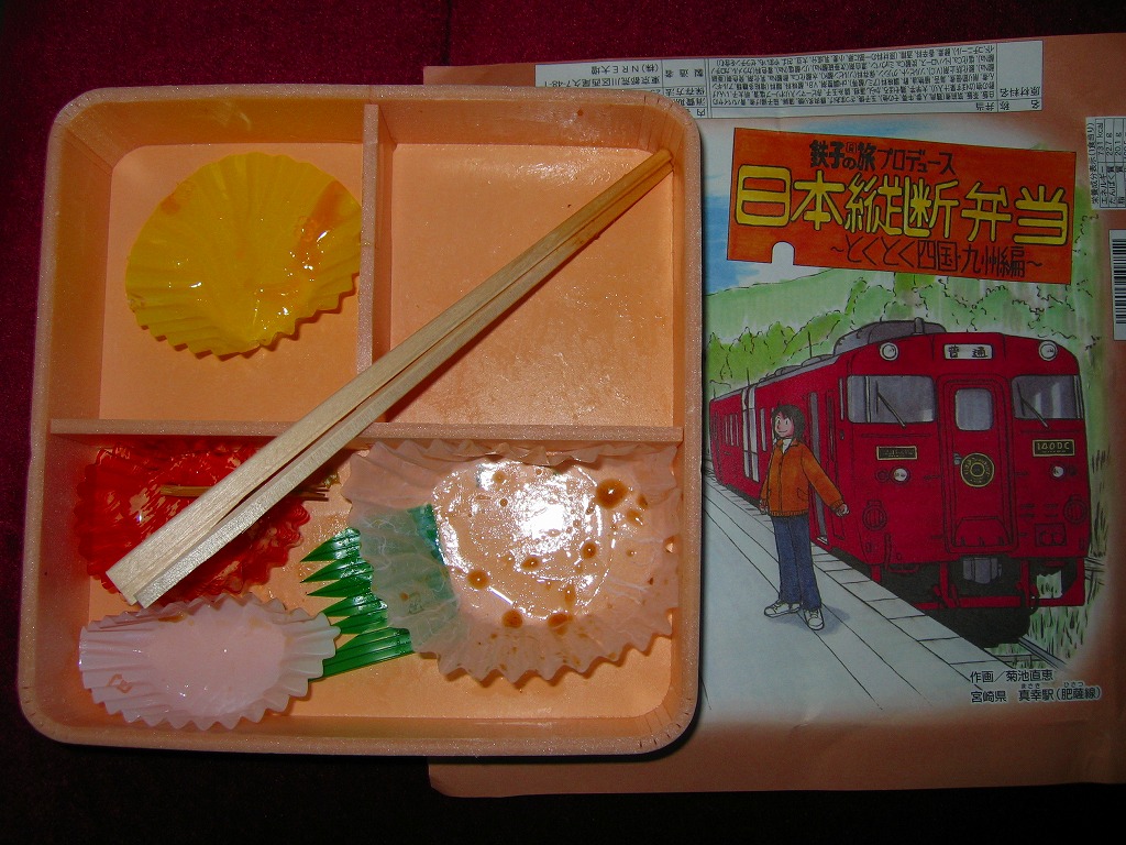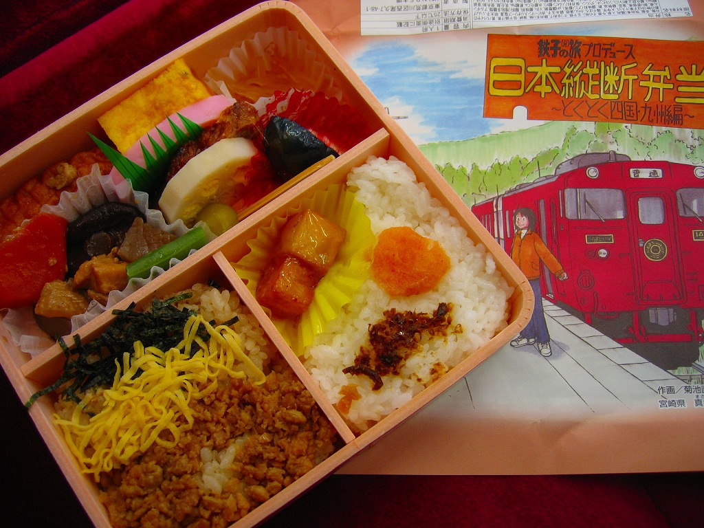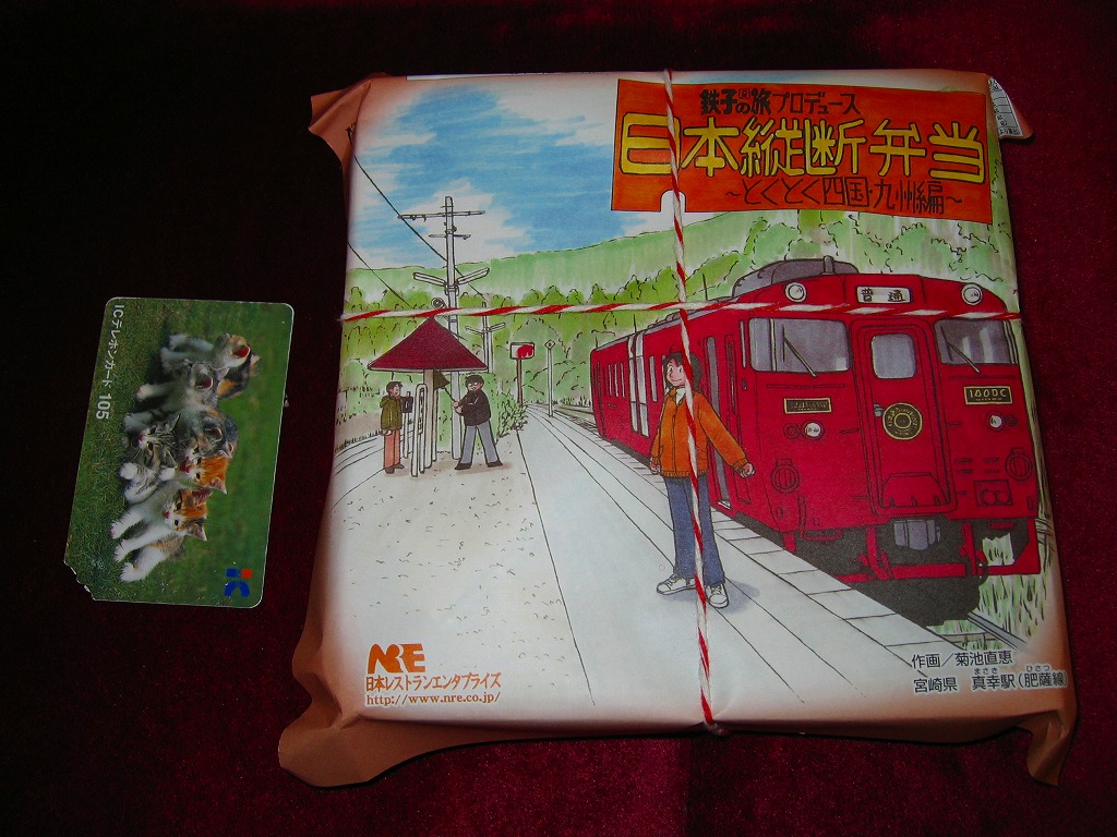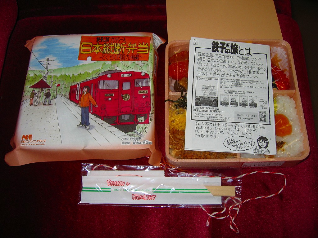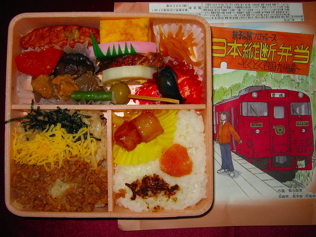 漫画「鉄子の旅」の著者である菊池直恵がプロデュースした駅弁の第5弾で、2009(平成21)年1月15日に西日本編から切り替え。今回は四国と九州が一緒にされて、一気にファイナルへ向かってしまった。ふたと枠に経木を使う正方形の容器に、九州の宮崎県・肥薩(ひさつ)線真幸(まさき)駅のイラストを漫画家自身が描いた掛紙をかける。