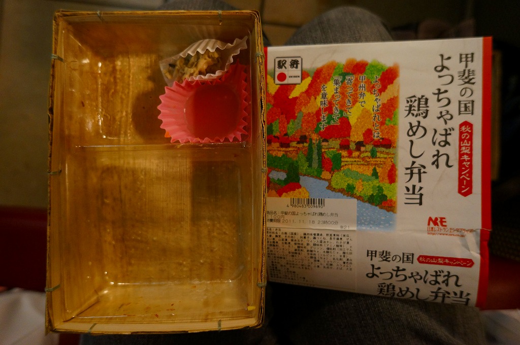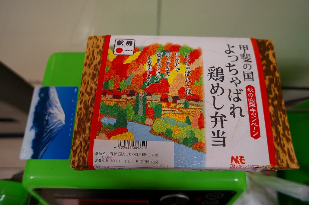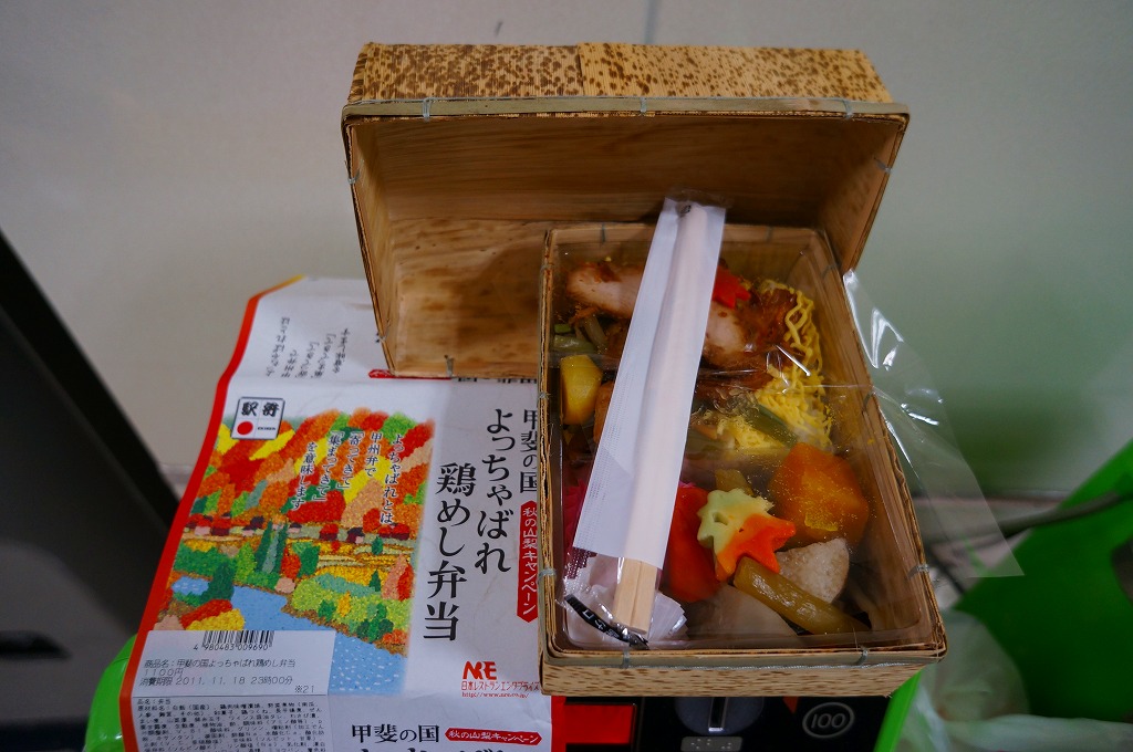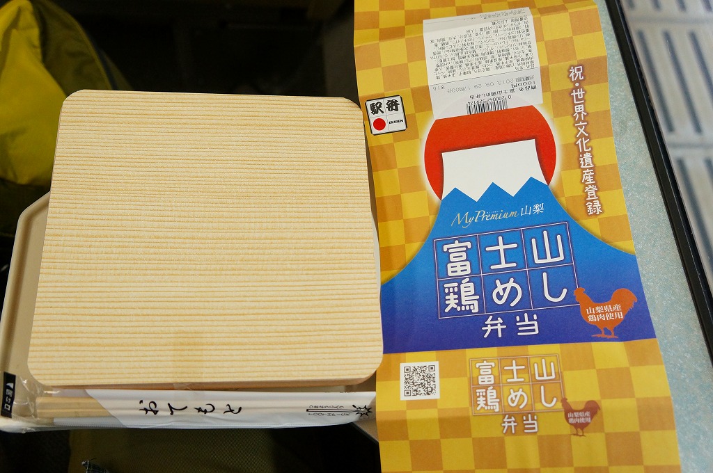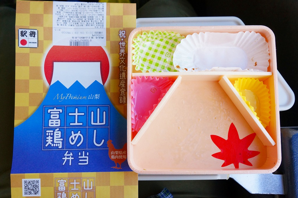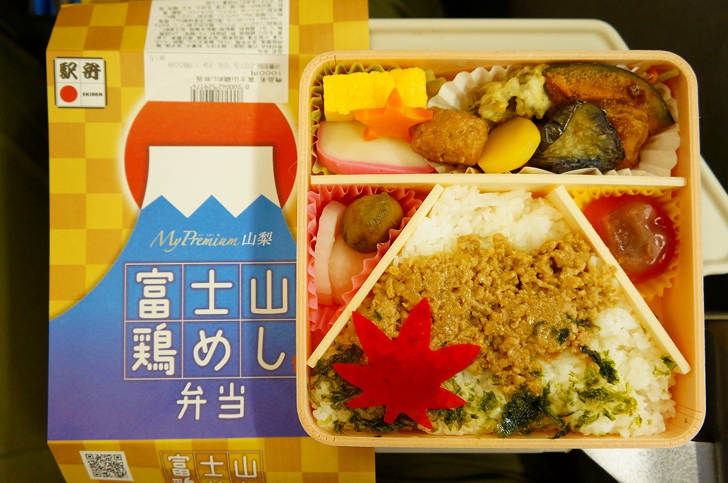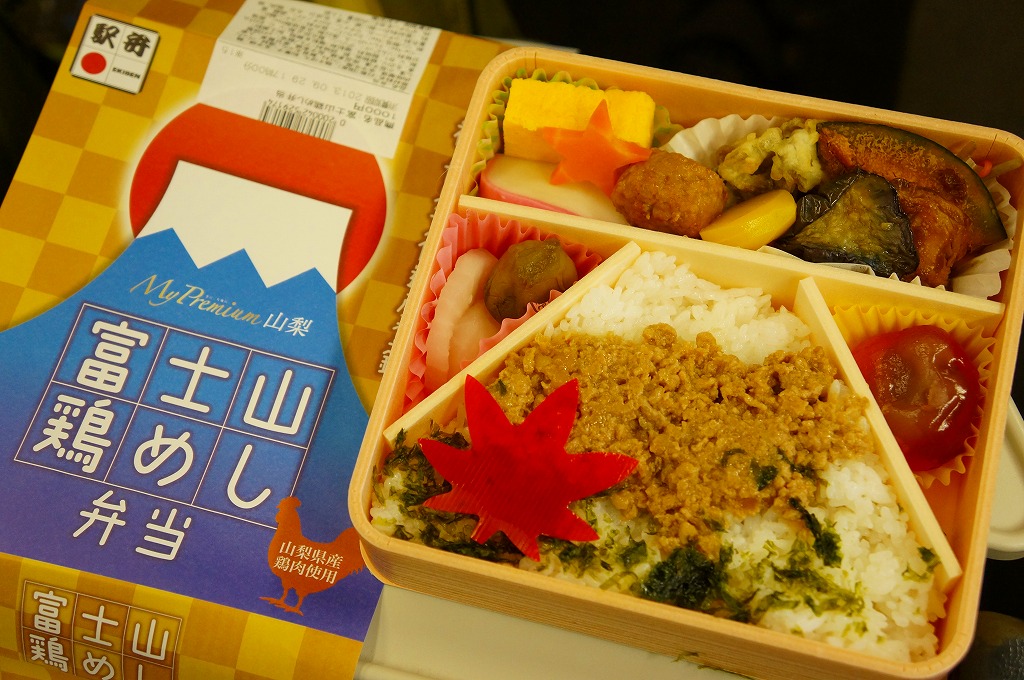 中身はとりそぼろと生のりをかけた白御飯に、鶏味噌焼、鶏つくね、玉子焼、かまぼこ、マイタケ天、カボチャとナスの素揚げ、星形ニンジン、べったら漬と小茄子漬、和菓子など。味と中身は総論として、東京のNREの鶏飯駅弁。実際に販売期間中の東京エリアではほぼ、既存の鶏飯駅弁を置き換えるような形でたくさん売られていた。鶏に山梨県産を使い、御飯で富士山を描くことで、発売の趣旨に合わせる。