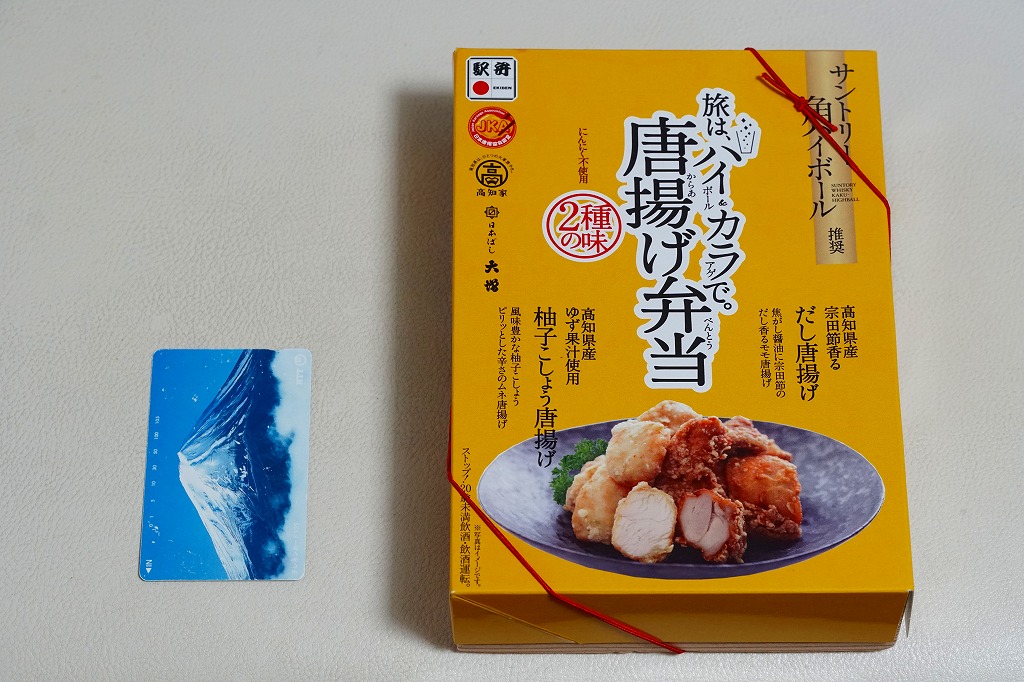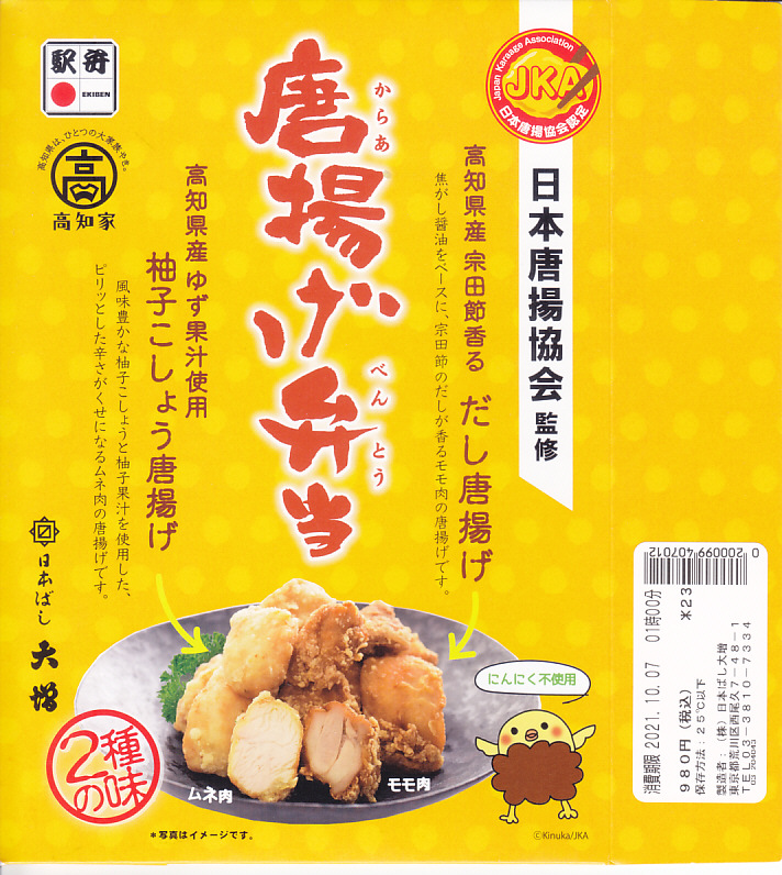 やはり特に宣伝されてはいないが、JKA日本唐揚協会監修という記述とそのキャラクター、高知県庁の公式プロモーション「高知家」のロゴマーク、にんにく不使用といううたい文句も読める。いずれにせよ、東京の駅弁屋で買える、「チキン弁当」でない唐揚げ弁当という位置付けに影響はないと思う。名を体で表す分かりやすい駅弁も、過去に東京駅で売られた下記の唐揚げ駅弁たちに比べて、鶏肉の分量や味のパンチが弱く思えたのは気のせいか。価格は2021年の発売時や購入時で980円、2022年6月から1,000円。