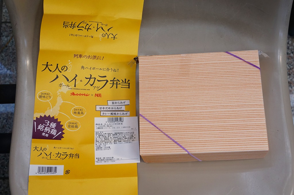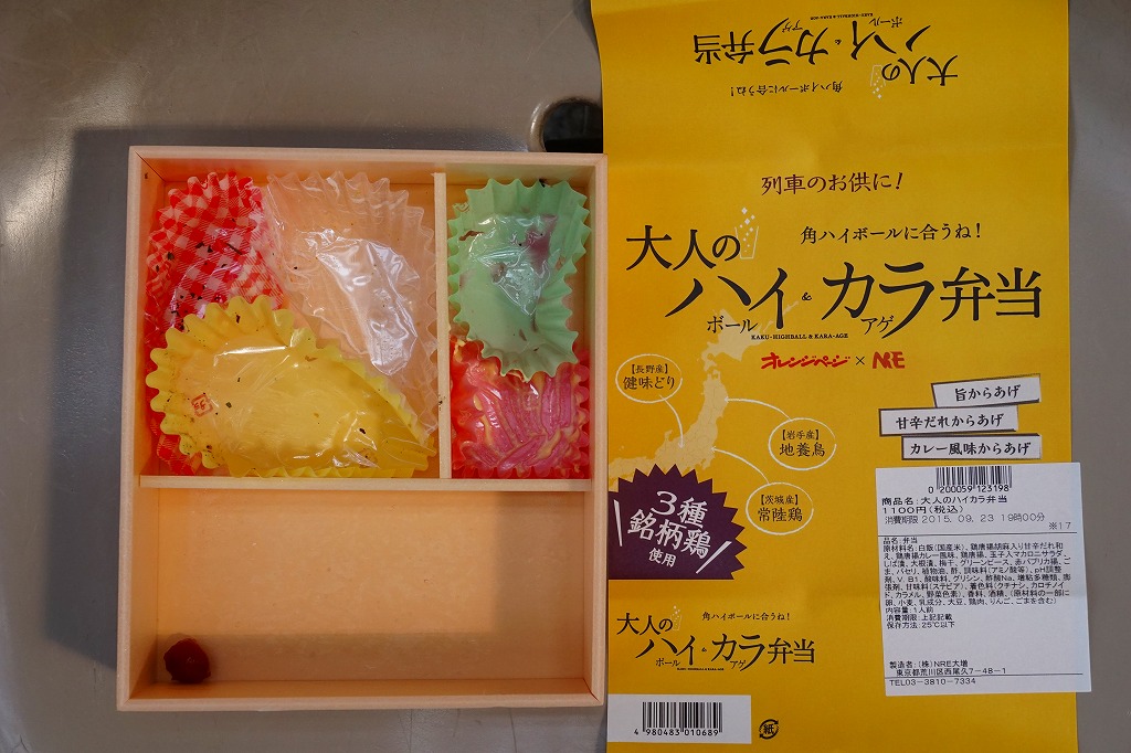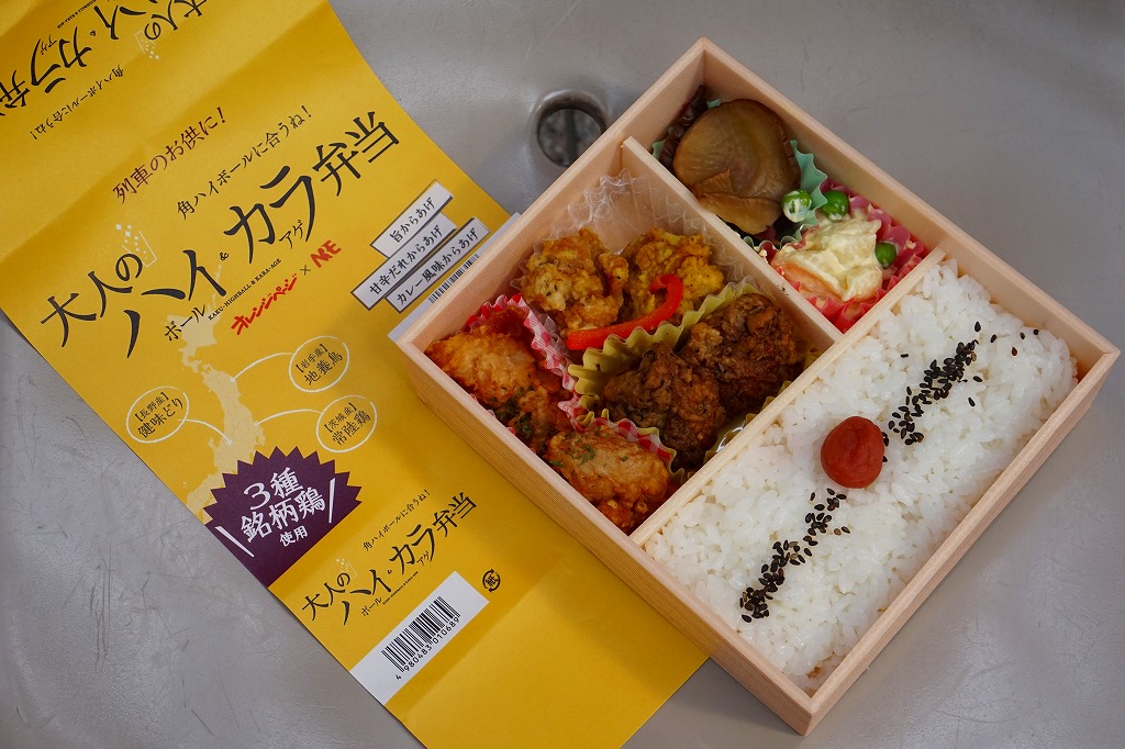 駅弁の名前は「大人のハイボール&カラアゲ弁当」とも。料理雑誌のオレンジページと駅弁屋のNREと、掛紙には記載がないが酒造会社としてのサントリーがタイアップし、2015(平成27)年9月1日から30日まで東京、上野、品川、新宿、大宮の各駅のNRE駅弁売店で販売された期間限定駅弁。この駅弁との同時購入で、サントリーの角ハイボール缶が50円引きになった。