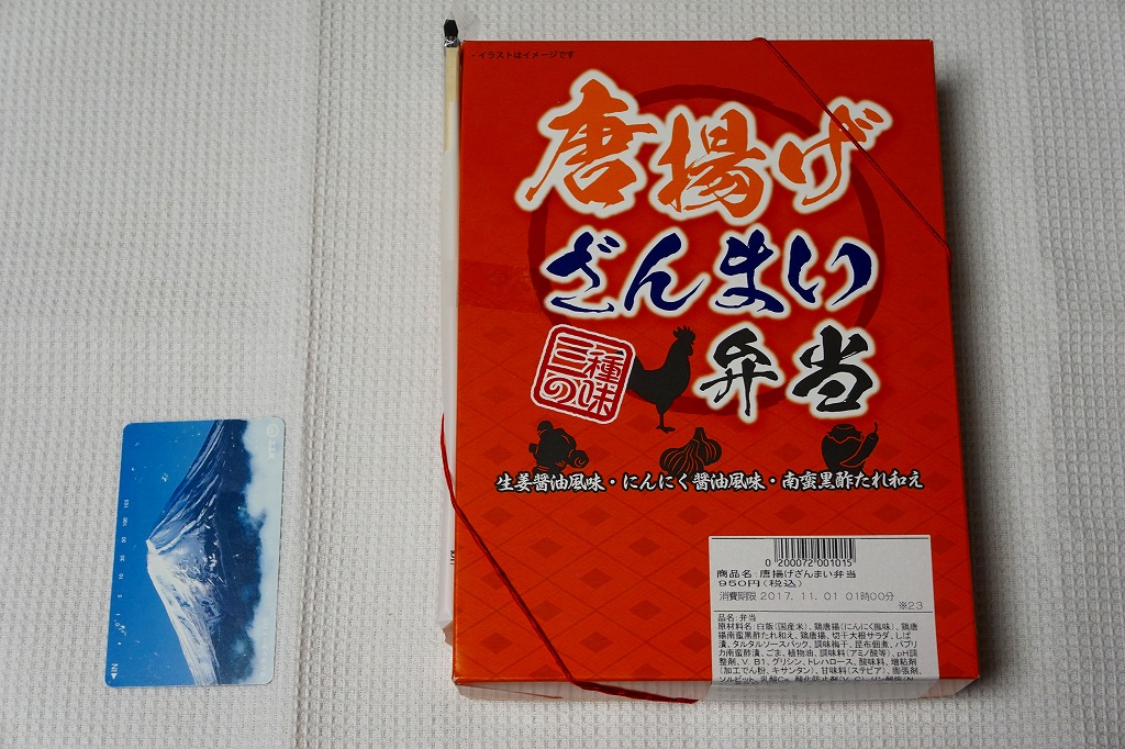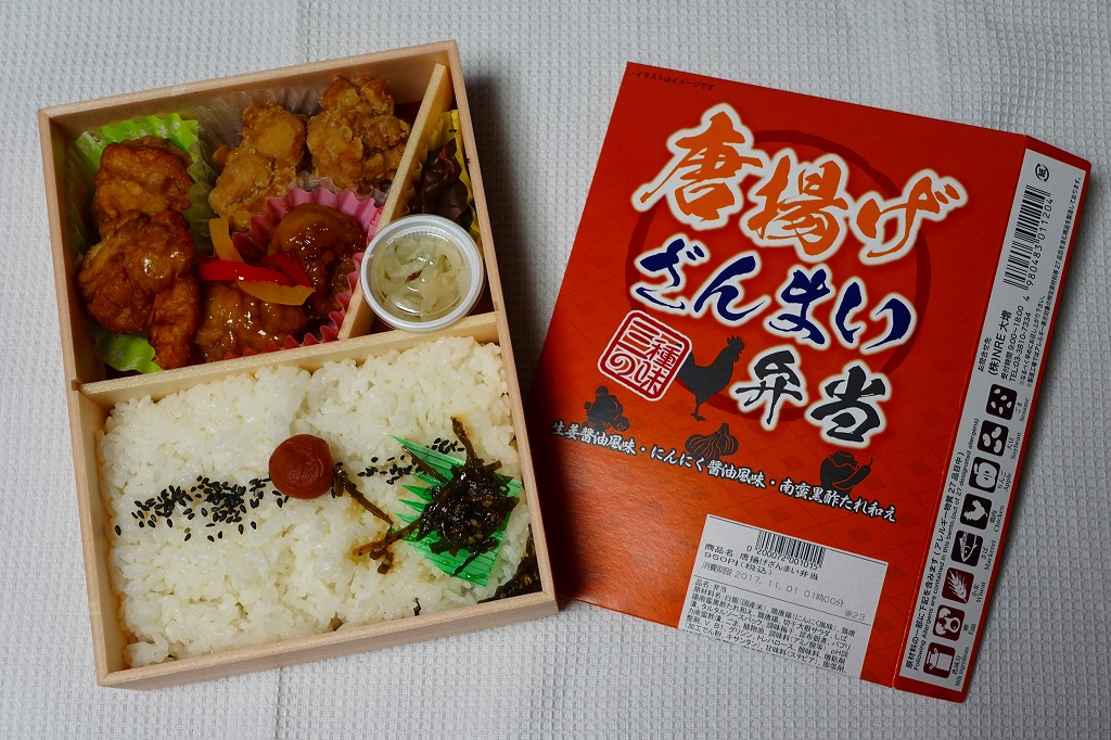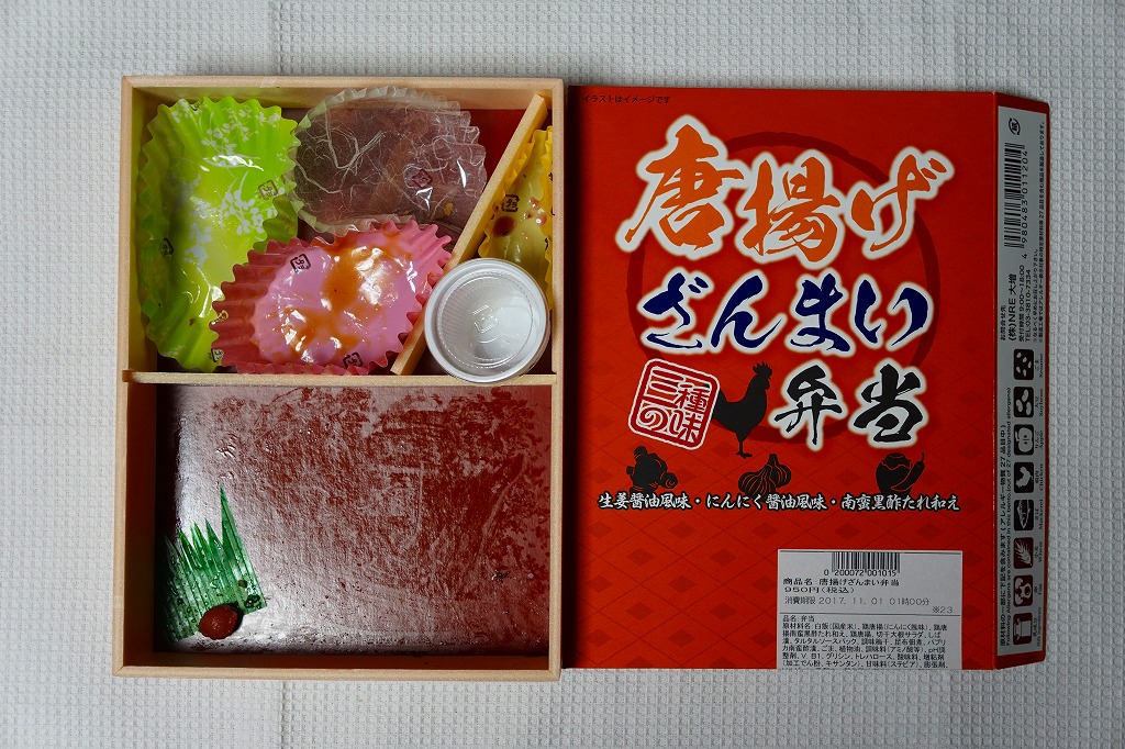 2017(平成29)年10月11日の発売。このような3種の鶏唐揚駅弁は、過去の東京駅の駅弁屋で何度か買えたような気がする。中身は日の丸御飯が半分、生姜醤油風味、にんにく味噌風味、南蛮黒酢たれ和えの鶏唐揚で3種の鶏唐揚が2個ずつ入り、しば漬、パプリカ南蛮酢漬、昆布佃煮でさらに3種の漬物類も突っ込んだ、しっかり整った唐揚げ弁当。価格は2017年の発売時や購入時で950円、2019年時点で980円。2021年7月頃までの販売か。