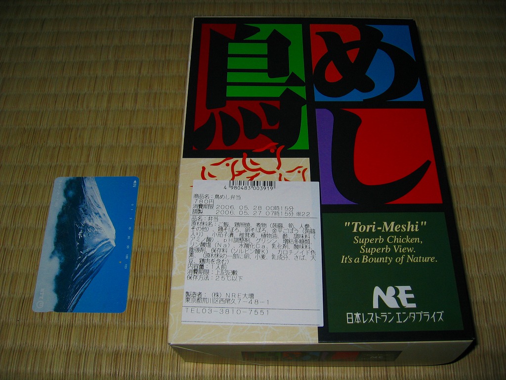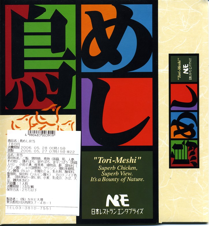 ボール紙製容器に白いトレーを突っ込み、御飯の上に鶏と卵のそぼろと鶏照焼にタケノコや椎茸などを無造作に置き、きんぴらごぼうなどを添える、いかにも工場製品という印象の弁当。味は悪くないだけに、丁寧に作れば印象も変わるだろうが、すると値段が許さないかもしれない。消費期限が分単位まで表示されるのもNREの弁当の特徴。2013年時点で上記の「鳥めし」にリニューアル。