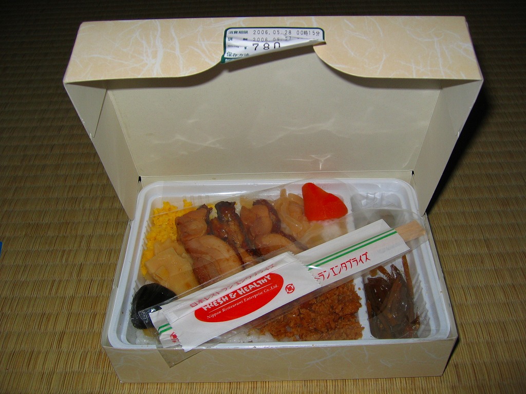つまり四角い「O−bento」。暖かい点は評価できるが本来の素材の良さは冷凍と解凍により失われた感が強く、この値段なら20円安い「鳥めし弁当」を選択したい。2003年5月限りで販売終了とか。
