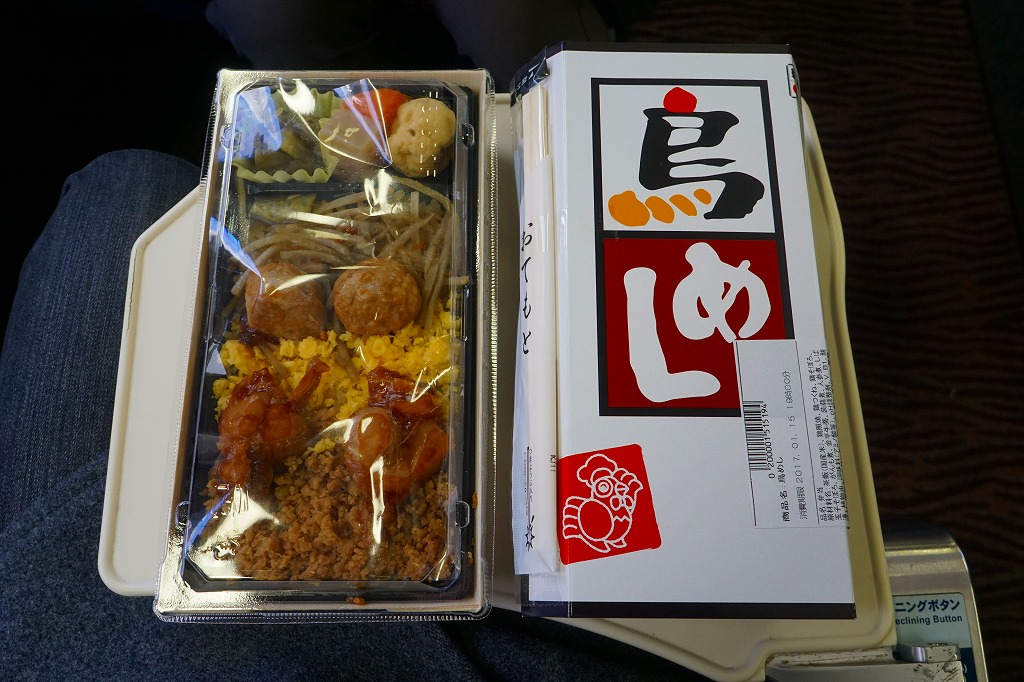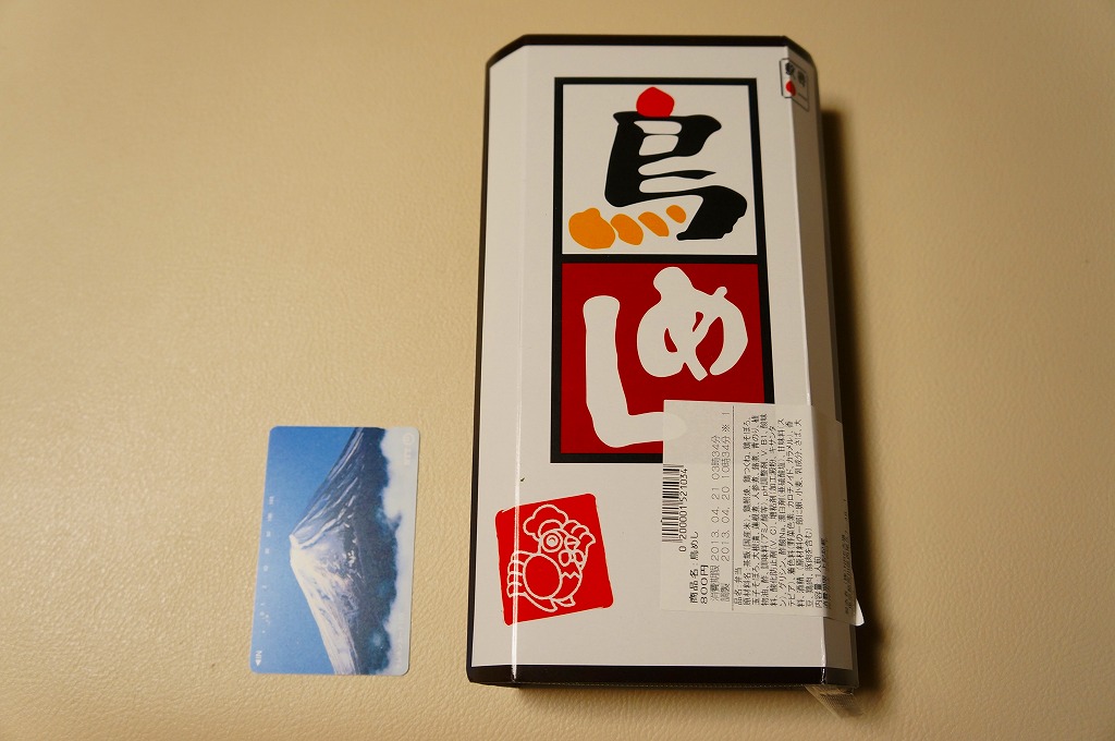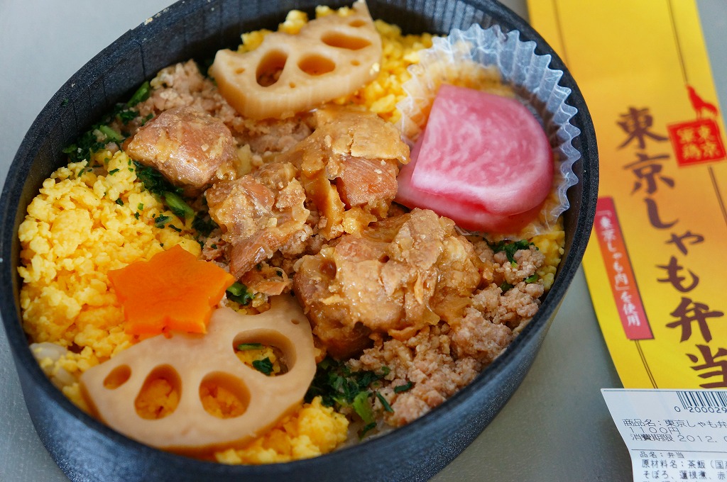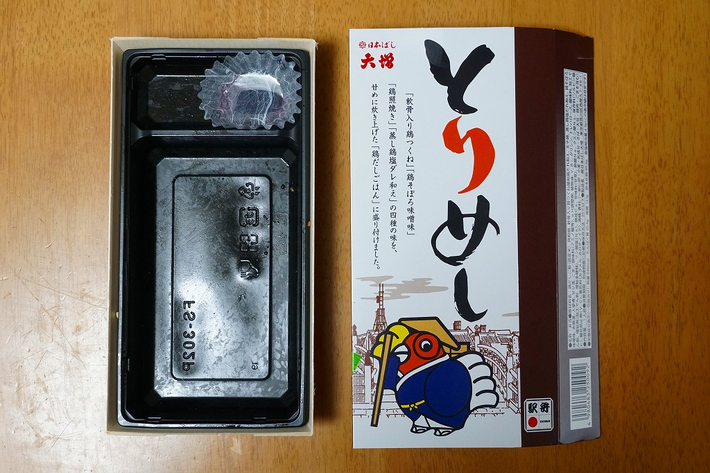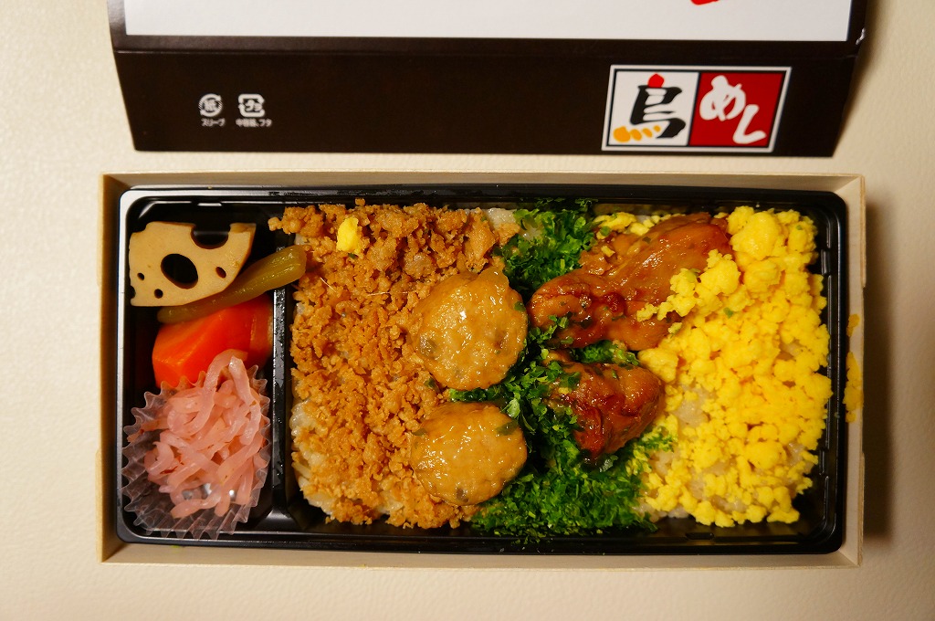 東京、品川、新宿、上野、大宮の各駅で、手広く売られる鶏飯駅弁。長方形の容器に茶飯を詰め、鶏照焼2個、鶏肉団子2個、鶏そぼろ、玉子そぼろ、きんぴらごぼうで覆い、がんもどき、こんにゃく、ニンジン煮、柴漬けを添える。近年に好まれる「鶏」でなく「鳥」の字を使う。特徴があるわけでなく、東京にちなむものでなく、でも駅弁として、味と中身と価格がよくできていると思う。飲み物と合わせて千円という価格も、よくできている。2020年11月に上記の「とりめし」へリニューアル。