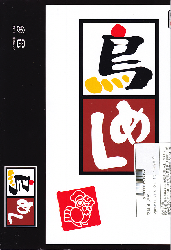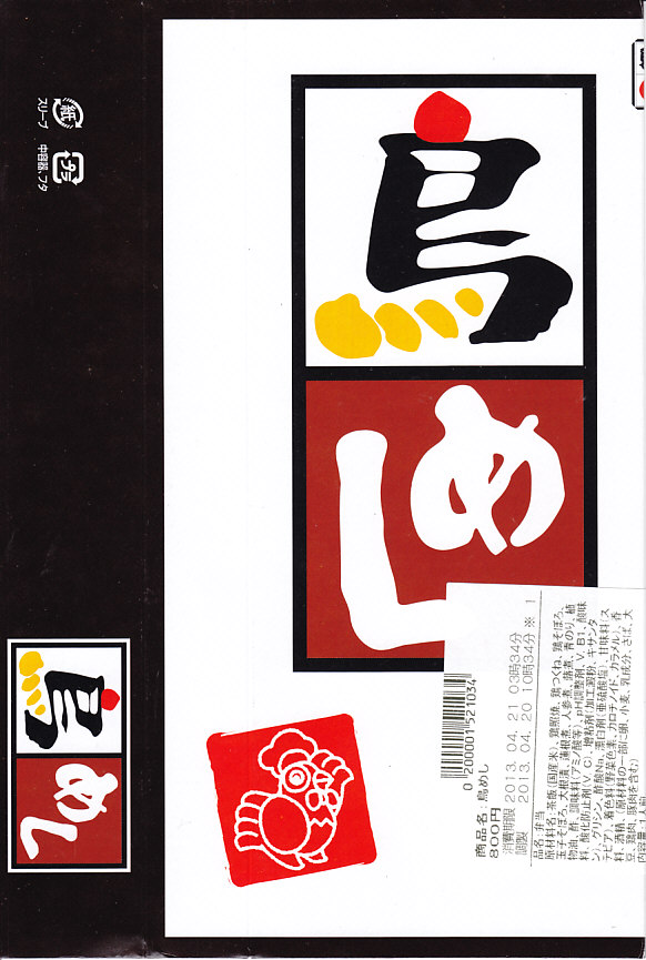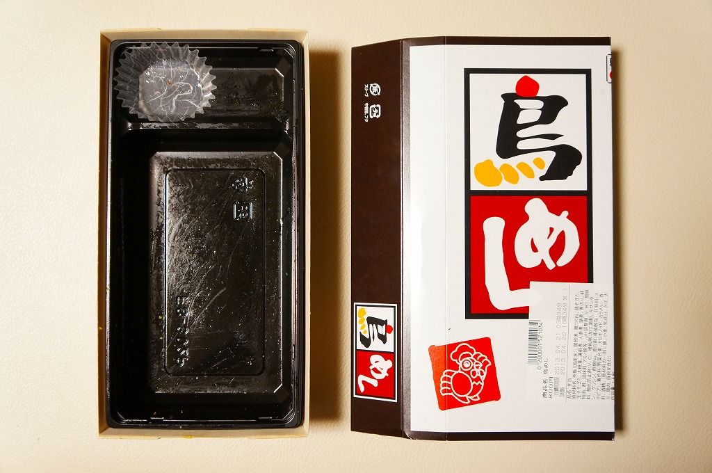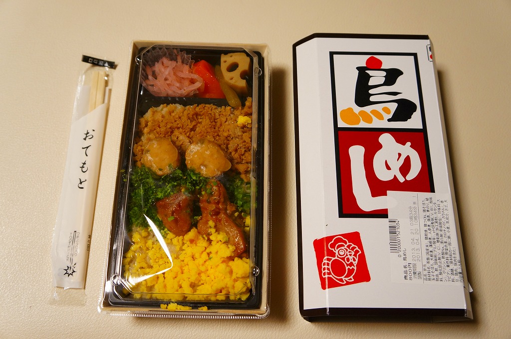 下記や上記の「鳥めし弁当」の、2013(平成25)年時点での姿。中身は2006(平成18)年のものとはまるで変わり、茶飯の上にとりそぼろ、青のり、玉子そぼろで三色旗を描き、ごろごろとした鶏照焼と鶏つくねを置き、ニンジンとフキとレンコンの煮物と大根漬を添える。中身の見栄えも工業製品風からやや手作り風へと良くなり、個性的とまではいかないが駅売り弁当としていい感じになった。パッケージには「チキン弁当」のトリもいる。価格は2013年の購入時で800円、2014年時点で青のりをきんぴらに、大根漬を柴漬けに替えたうえで850円。