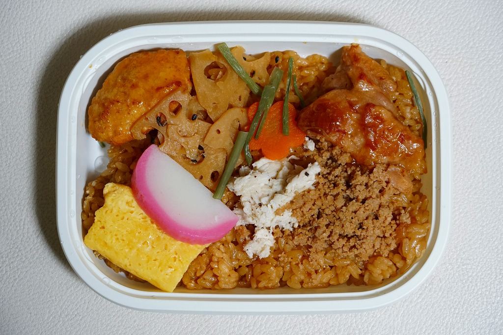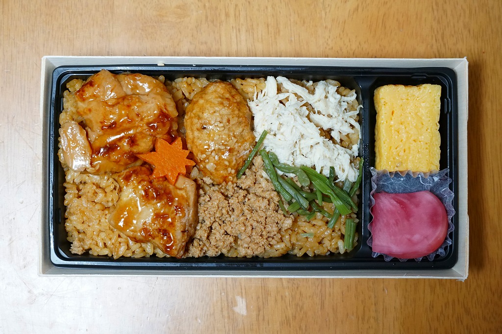 日の丸御飯に、茨城県の「常陸鶏(ひたちどり)」の赤い旨からあげ、岩手県の「地養鳥(じようどり)」の黒い甘辛だれからあげ、長野県の「健味どり(けんみどり)」の黄色いカレー風味からあげを詰め、マカロニサラダ、柴漬け、いぶり漬物を添える。3種各2個の鶏唐揚には、無味で小さく湿気た感じを受けたが、きっとウイスキーのソーダ割りのおつまみに合うものなのだろう。
