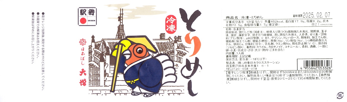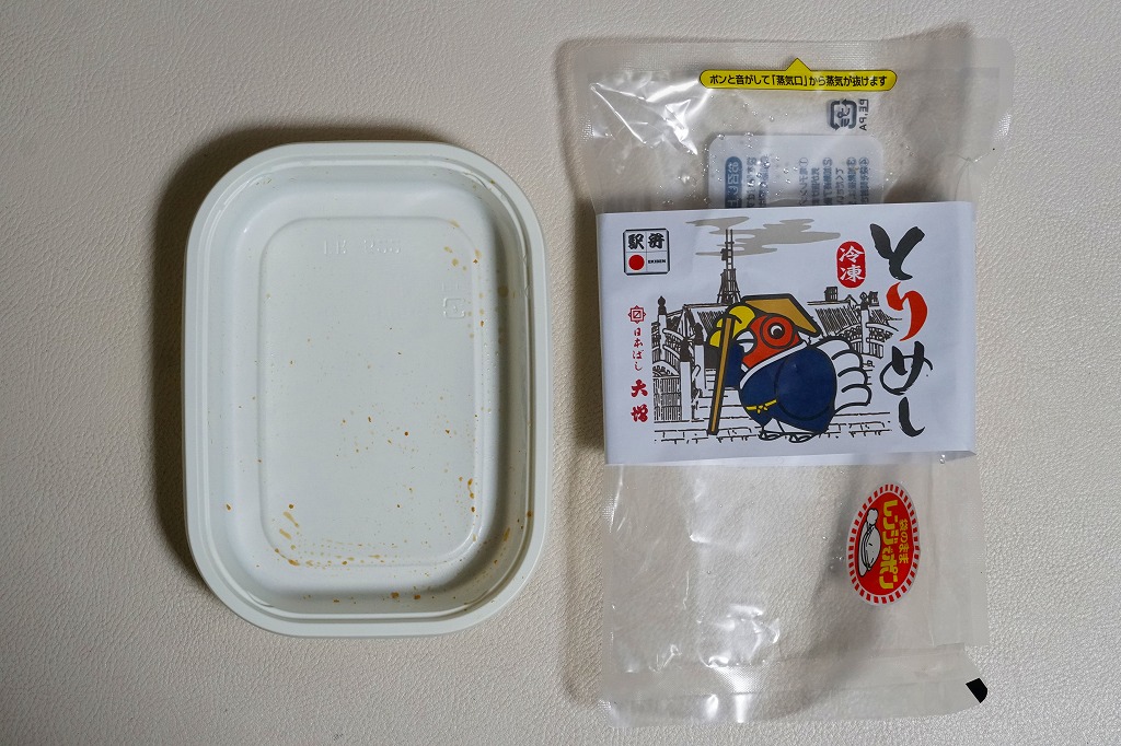 発売当時は長円形の木質エコ容器に、2024年時点で写真のような白く平たいプラ製トレーに、鶏だしご飯を敷き、鶏そぼろ、鶏照焼、鶏つくね、蒸し鶏、玉子焼、かまぼこ、れんこんきんぴら、にんじん、せりで覆い、まるごと冷凍し、透明な袋に密封し、東京駅弁のとりめしと同じ絵柄の紙帯を締める。指示どおり電子レンジで加熱すれば、東京駅弁のとりめしに似て非なるような味が、温かく少しだけいただける。駅弁の雰囲気が感じられるかは、人それぞれ。