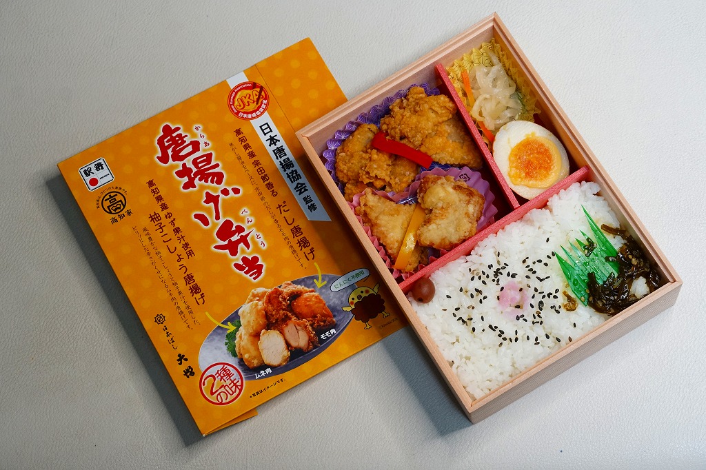 2021(令和3)年9月26日に東京、品川、新宿、上野、大宮の各駅で発売。10月のJR東日本の駅弁キャンペーン「駅弁味の陣2021」にエントリー。公式には過去を語らないが、下記の駅弁「唐揚げざんまい弁当」のリニューアルだろう。四角い容器に白飯を詰め、黒ごまを振って昆布と小梅を添え、鶏もも肉の高知県産宗田節のだし唐揚げと、鶏むね肉の高知県産ゆず果汁の柚子こしょう唐揚げを2個ずつ詰め、半身の味付け卵と切り干し大根を添える。