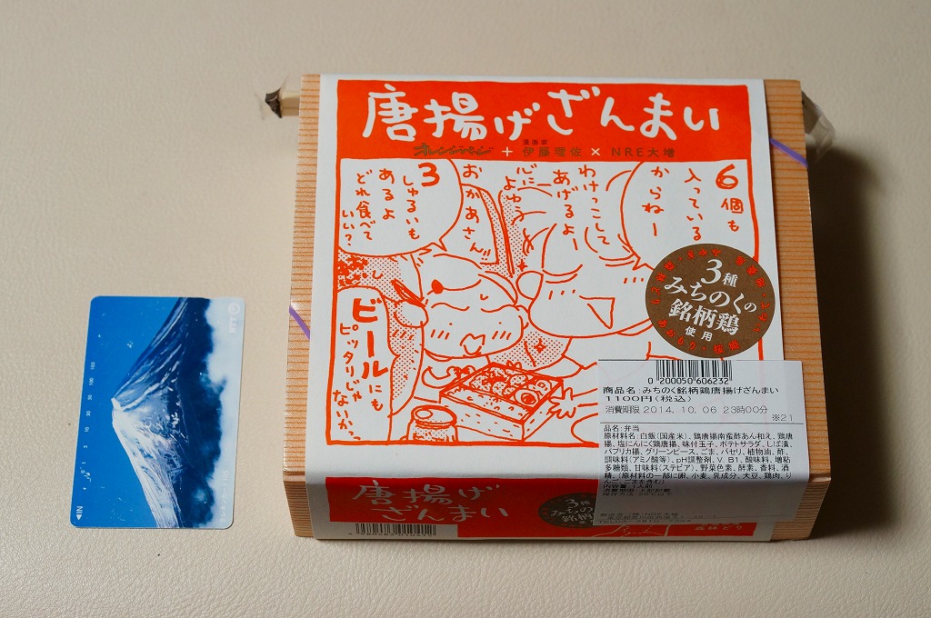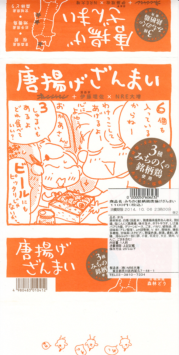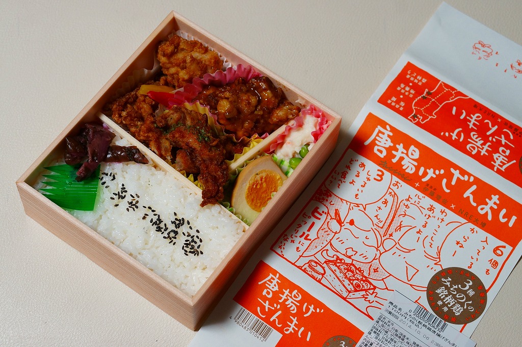 料理雑誌のオレンジページと駅弁屋のNREが、漫画家の伊藤理佐氏のアイデアをもとに開発し、2014(平成26)年10月1日に東京、新宿、品川、上野、大宮の各駅で発売。掛紙のイラストも同氏のもの。中身は白御飯に柴漬けを添え、宮城県産森林どり のシンプル唐揚げ(定番しょうゆ味)、岩手県産地養鳥の唐揚げ南蛮風(甘酢っぱい南蛮風)、青森県産桜姫の塩にんにく唐揚げ(パンチのきいた塩にんにく味)の鶏唐揚を各2個詰め、煮玉子、ポテトサラダ、パプリカを添える。