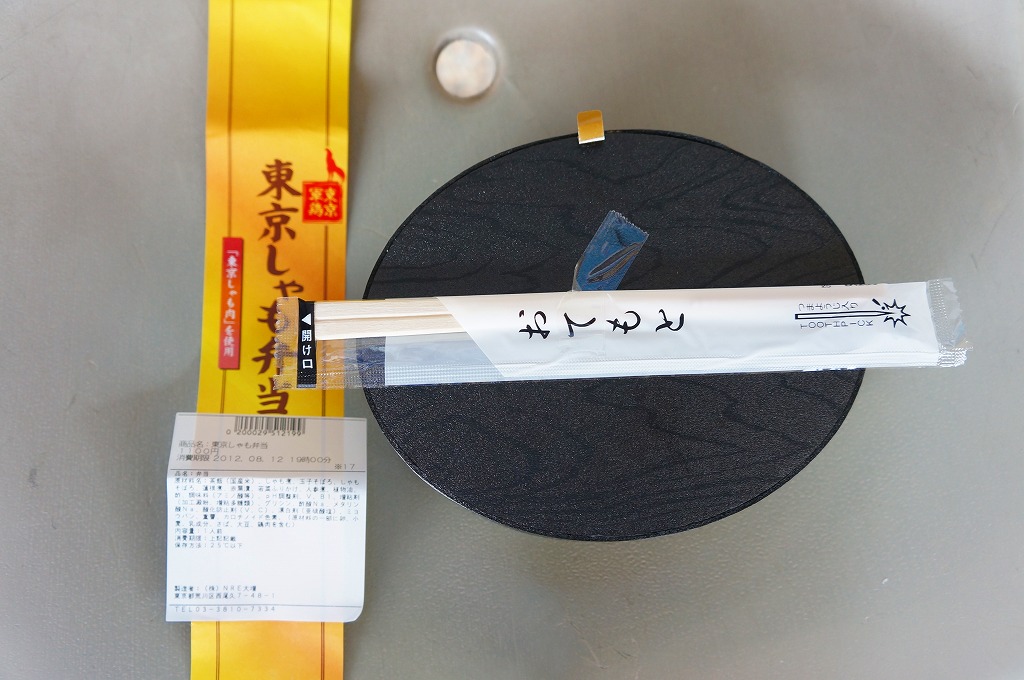 2001(平成13)年10月14日15時2分の調製である東京駅弁のボール紙製のふた。現在のNRE大増は、当時は日本レストラン調理センターの名称であった。意匠は異なるが価格も中身も上記の2006年のものと同じ。