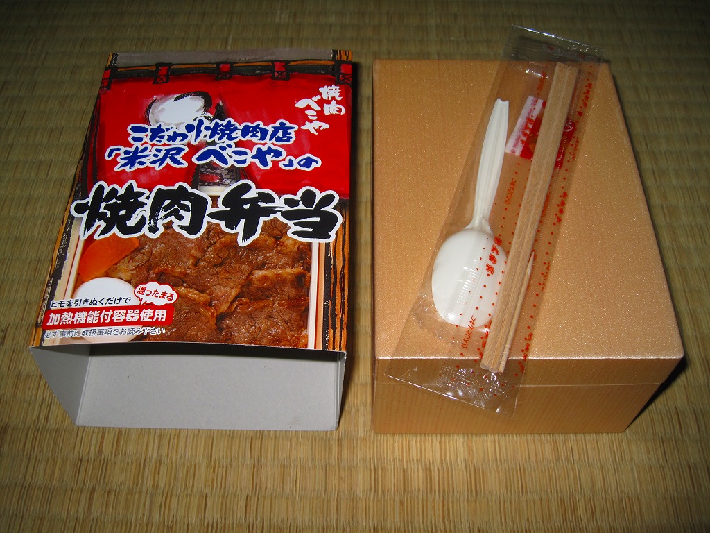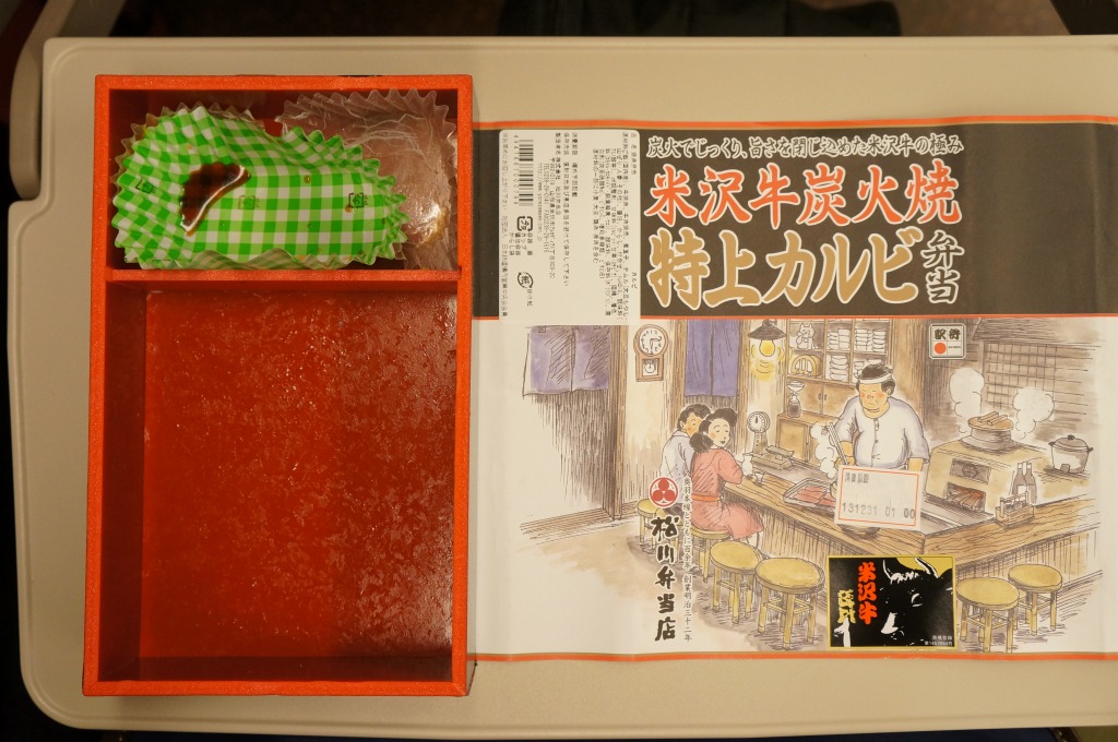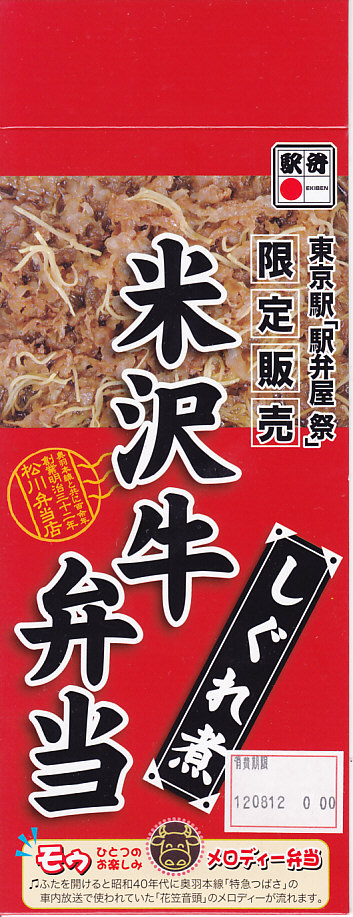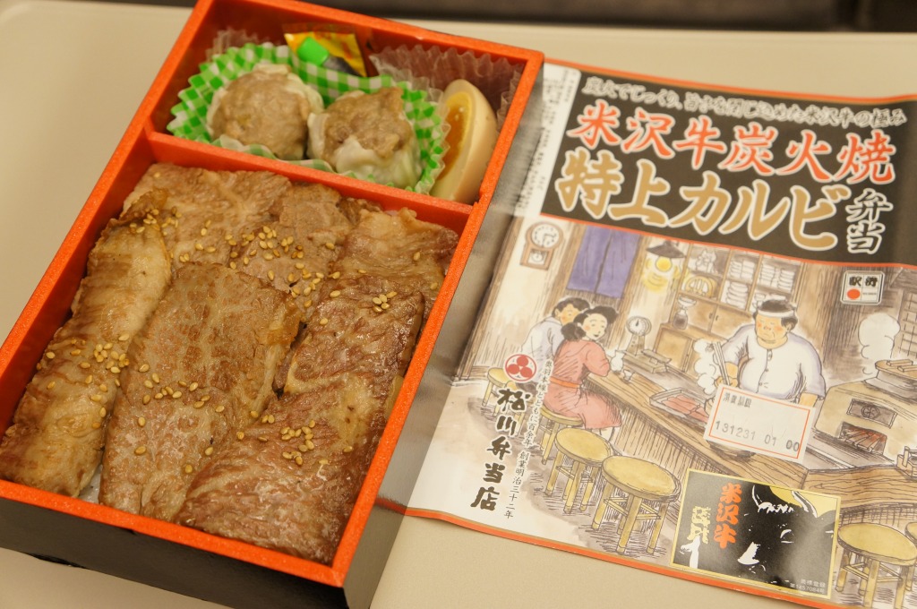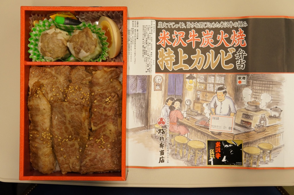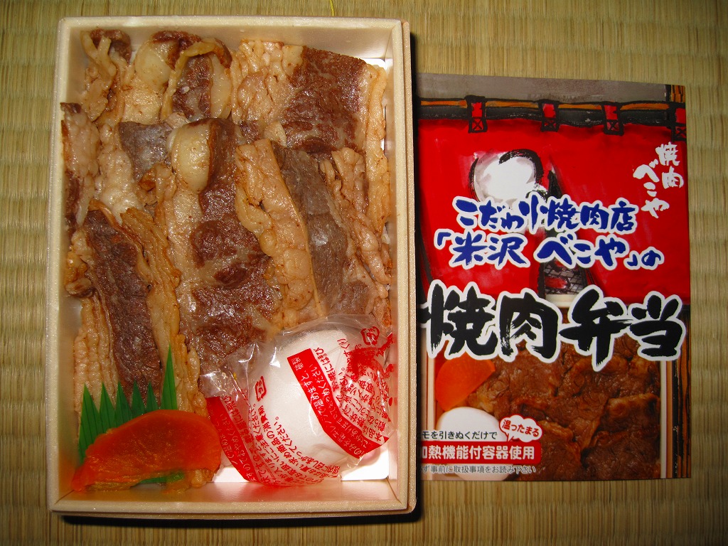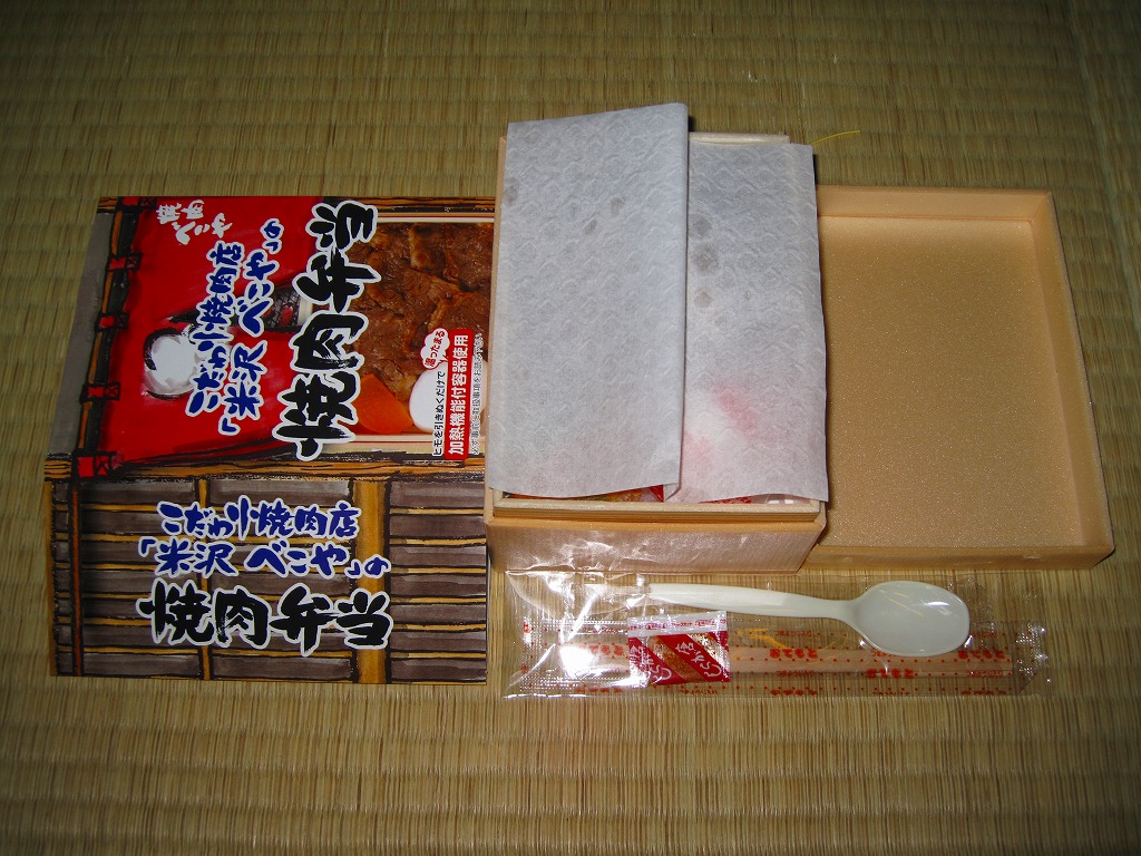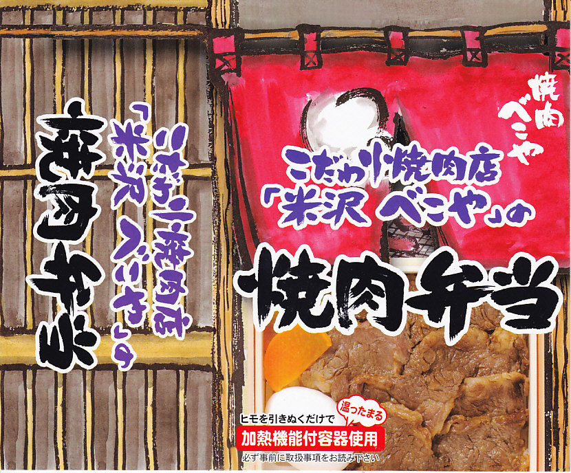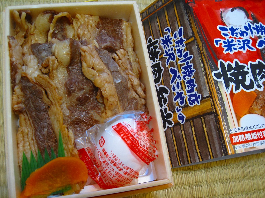 角のしっかりした直方体の加熱機能付き容器を、中身の写真や弁当の名前を印刷したボール紙の枠にぴったりはめる。中身は白御飯の上に牛バラ肉を貼り、半熟玉子とダイコン味噌漬を添えるもの。御飯の少量はともかく、肝心の肉が油だらけのうえ身が固い。宣伝が賑やかな分だけ、味は米沢の輸送駅弁より劣化した印象。