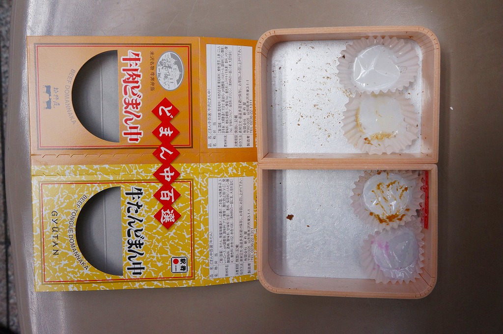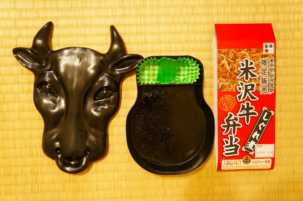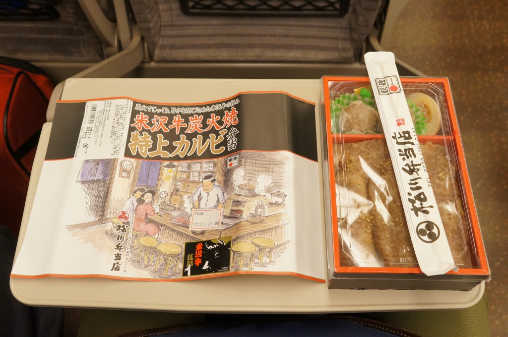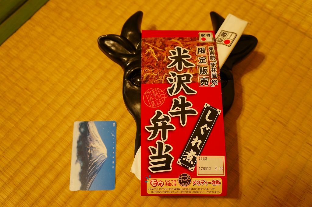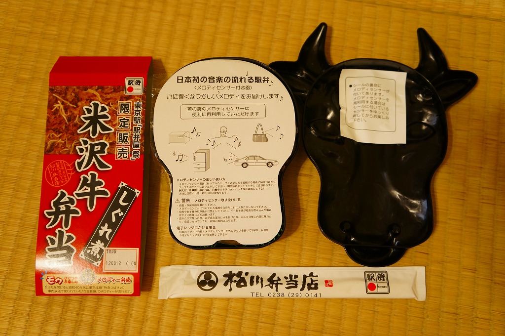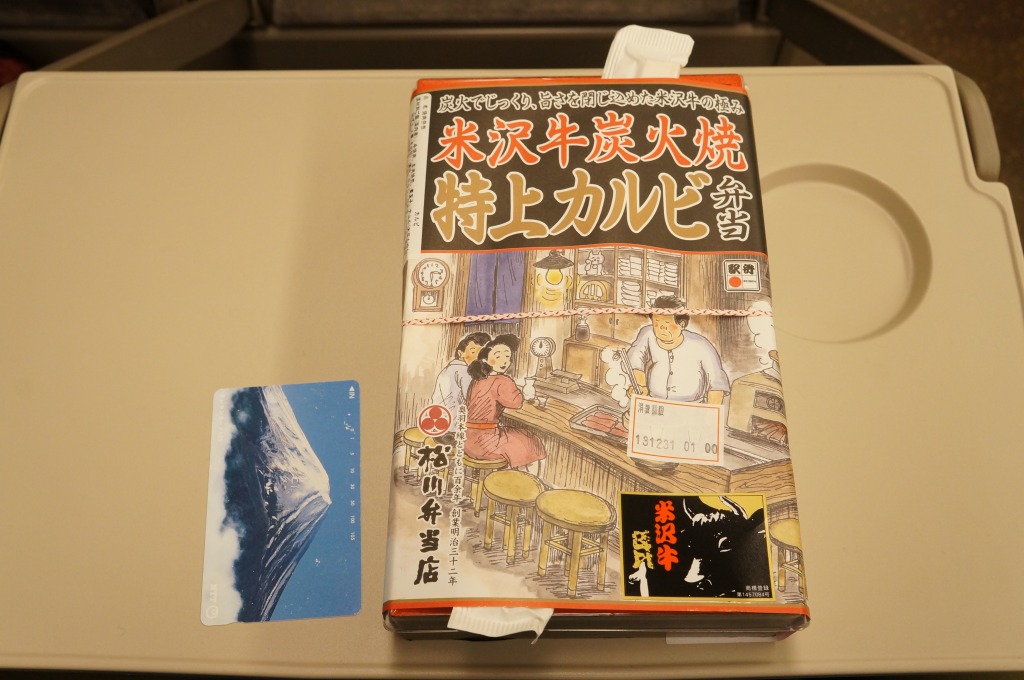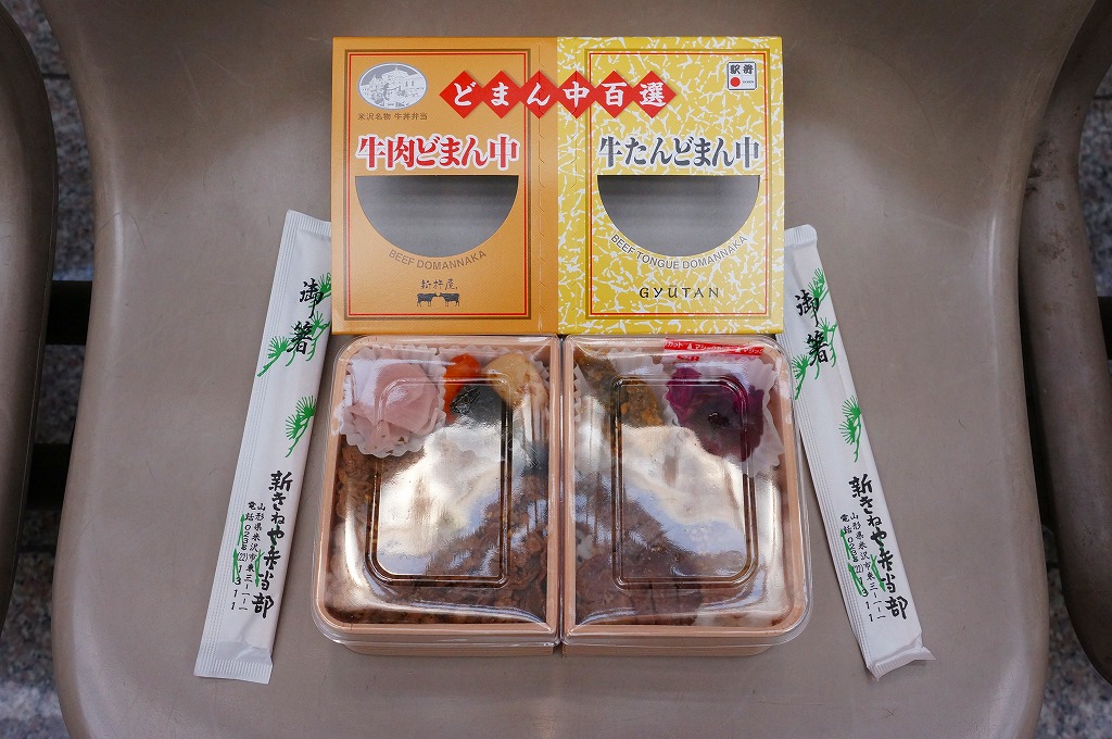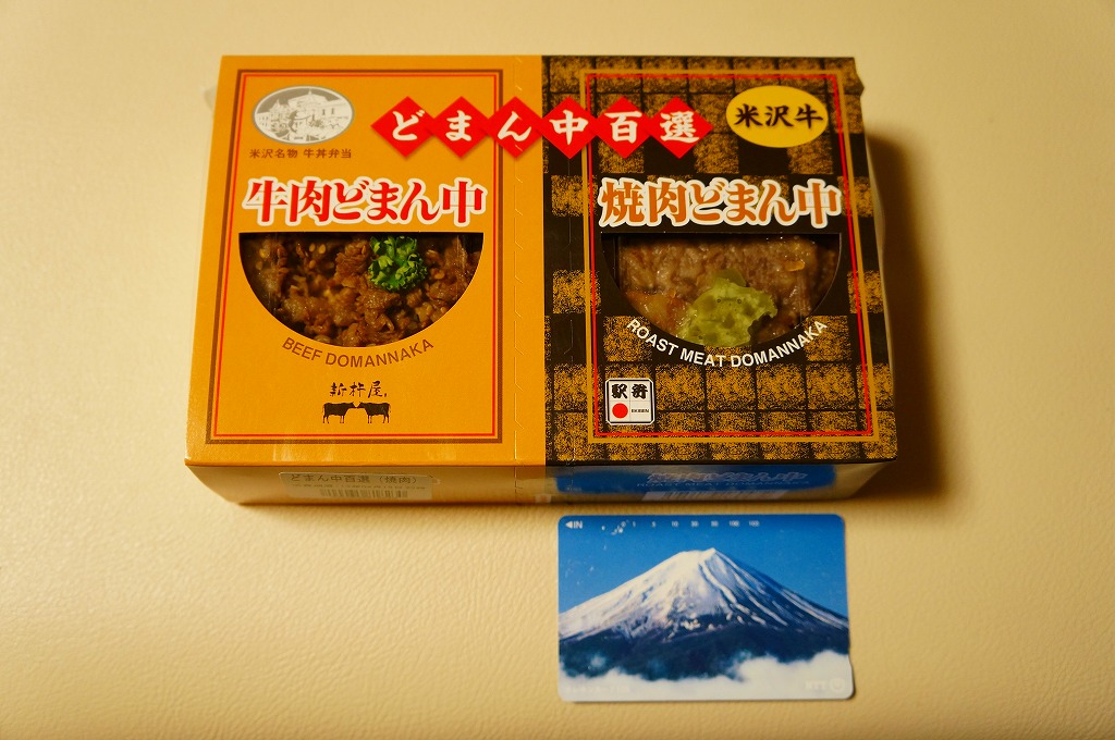角のしっかりした直方体の加熱機能付き容器を、中身の写真や弁当の名前を印刷したボール紙の枠にぴったりはめる。中身は白御飯の上に牛バラ肉を貼り、半熟玉子とダイコン味噌漬を添えるもの。御飯の少量はともかく、肝心の肉が油だらけのうえ身が固い。宣伝が賑やかな分だけ、味は米沢の輸送駅弁より劣化した印象。