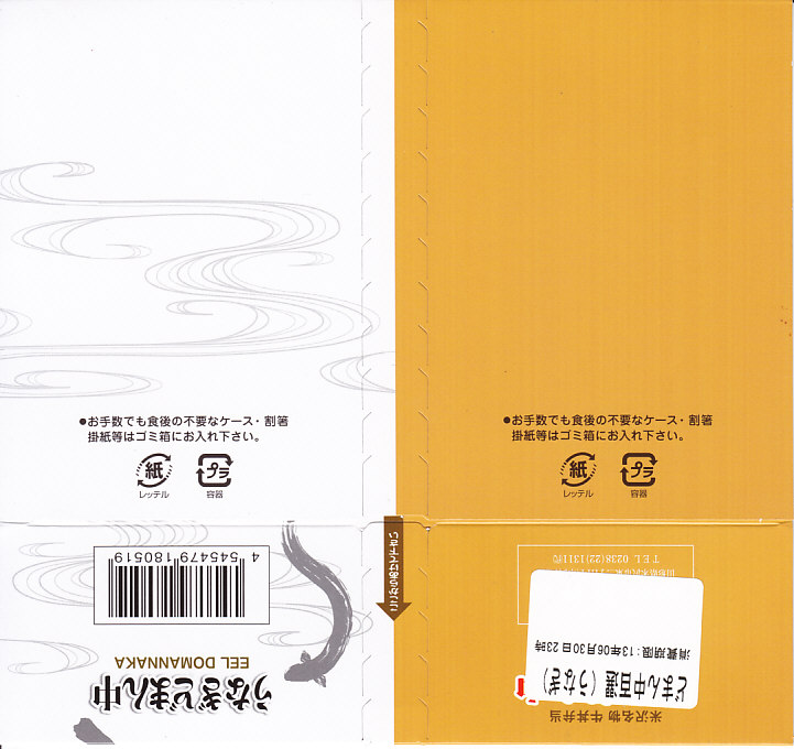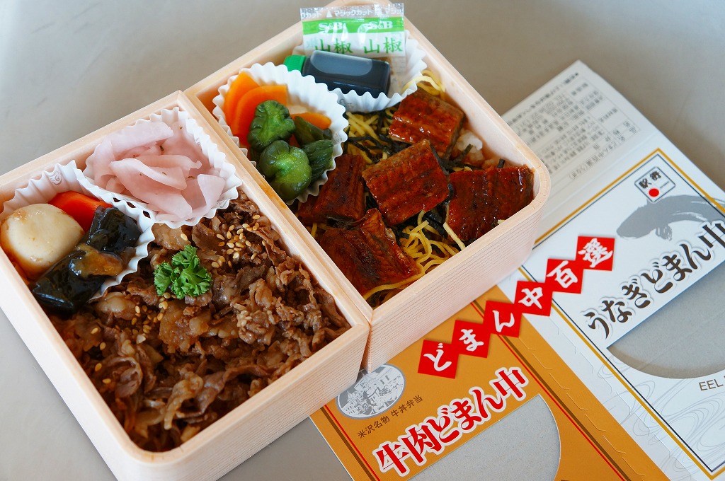 つまり、米沢駅の名物駅弁「牛肉どまん中」をハーフサイズにして、さらに「うなぎどまん中」なる部分を同じサイズでくっつけた。割り箸を2膳付けており、真ん中で千切ってふたつのミニ駅弁にすることもでき、調製表示も2枠書いてある。これはとてもユニークな試み。調製元はもちろん、「牛肉どまん中」の米沢駅の駅弁屋であるが、あくまでも東京駅限定の駅弁である。