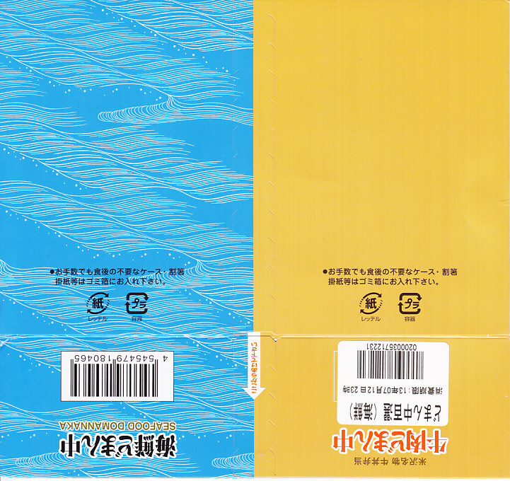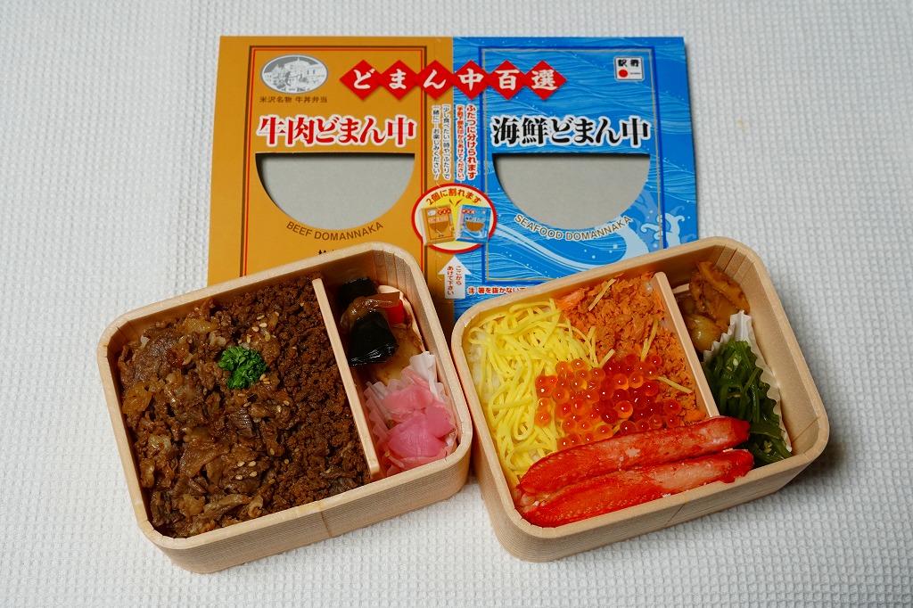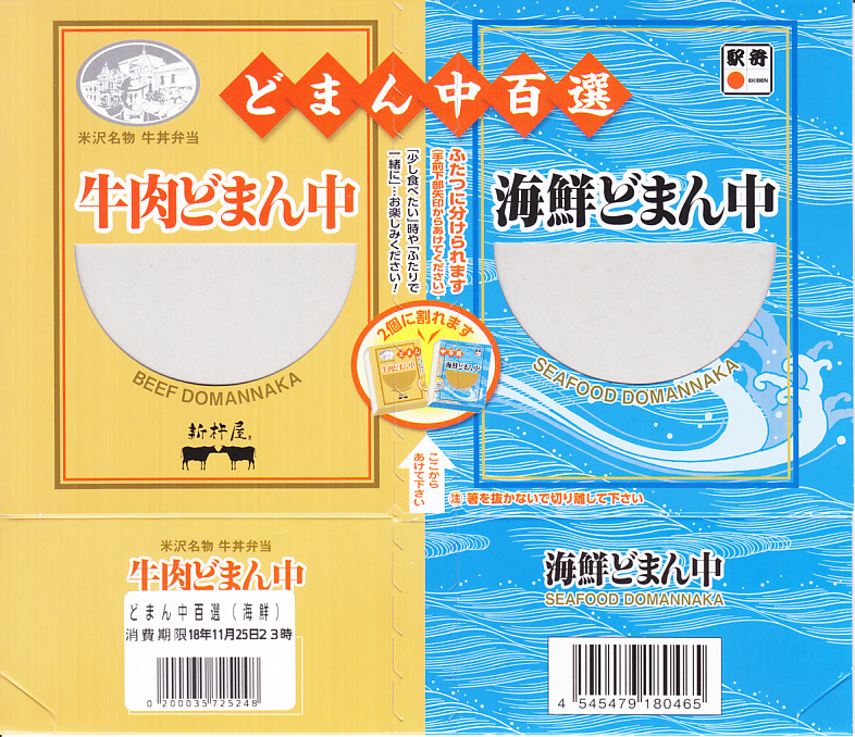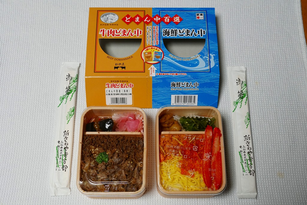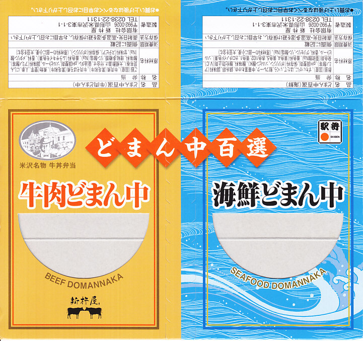 つまり、米沢駅の名物駅弁「牛肉どまん中」をハーフサイズにして、さらに「海鮮どまん中」なる部分を同じサイズでくっつけた。割り箸を2膳付けており、真ん中で千切ってふたつのミニ駅弁にすることもでき、調製表示も2枠書いてある。これはとてもユニークな試み。調製元はもちろん、「牛肉どまん中」の米沢駅の駅弁屋であるが、あくまでも東京駅限定の駅弁である。このシリーズは不定期での販売に見える。