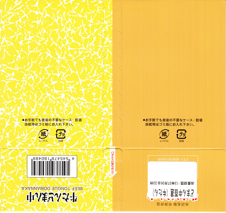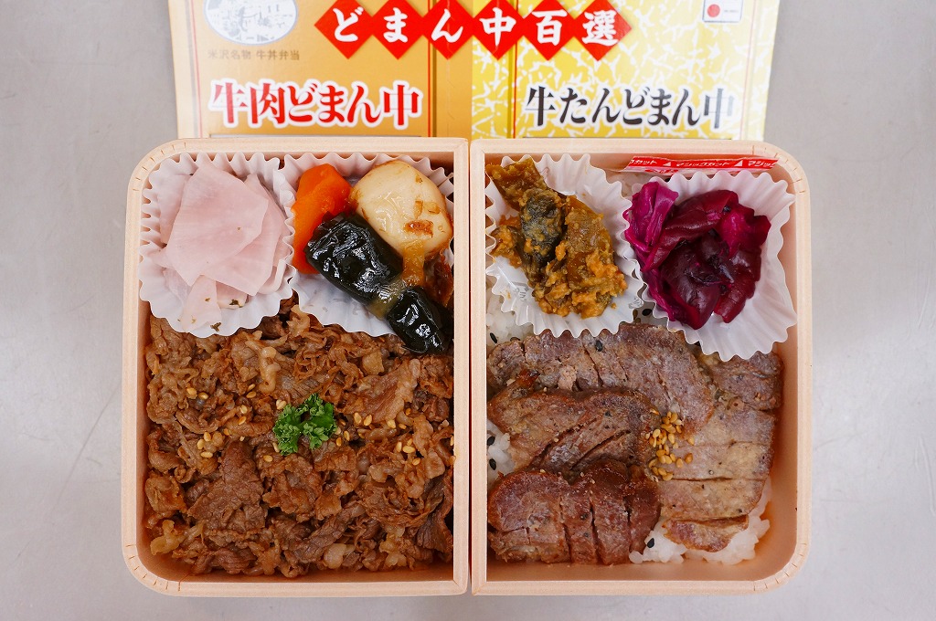 つまり、米沢駅の名物駅弁「牛肉どまん中」をハーフサイズにして、さらに「牛たんどまん中」なる部分を同じサイズでくっつけた。割り箸を2膳付けており、真ん中で千切ってふたつのミニ駅弁にすることもでき、調製表示も2枠書いてある。これはとてもユニークな試み。調製元はもちろん、「牛肉どまん中」の米沢駅の駅弁屋であるが、あくまでも東京駅限定の駅弁である。このシリーズは不定期での販売に見える。