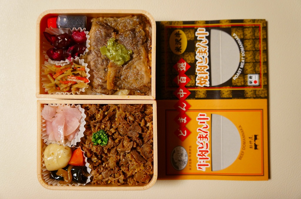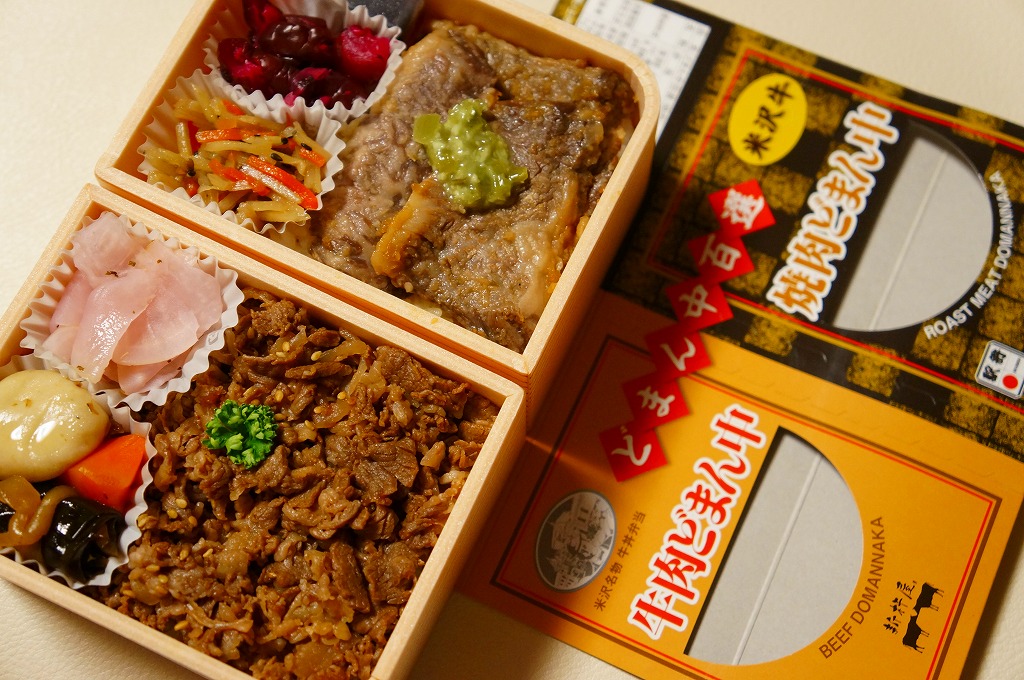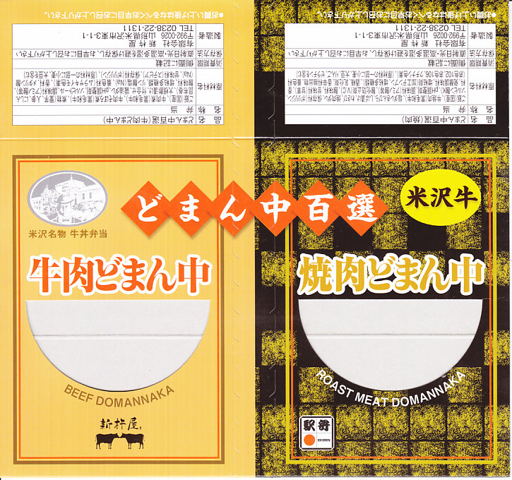 つまり、米沢駅の名物駅弁「牛肉どまん中」をハーフサイズにして、さらに「焼肉どまん中」なる部分を同じサイズでくっつけた。割り箸を2膳付けており、真ん中で千切ってふたつのミニ駅弁にすることもでき、調製表示も2枠書いてある。これはとてもユニークな試み。調製元はもちろん、「牛肉どまん中」の米沢駅の駅弁屋であるが、あくまでも東京駅限定の駅弁である。このシリーズは不定期での販売に見える。