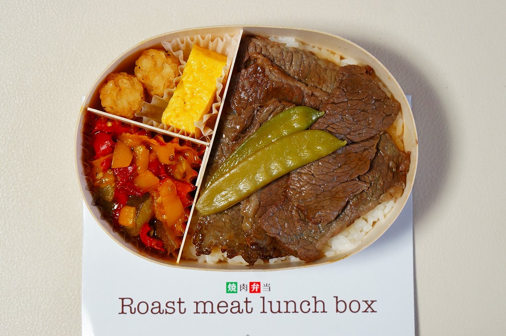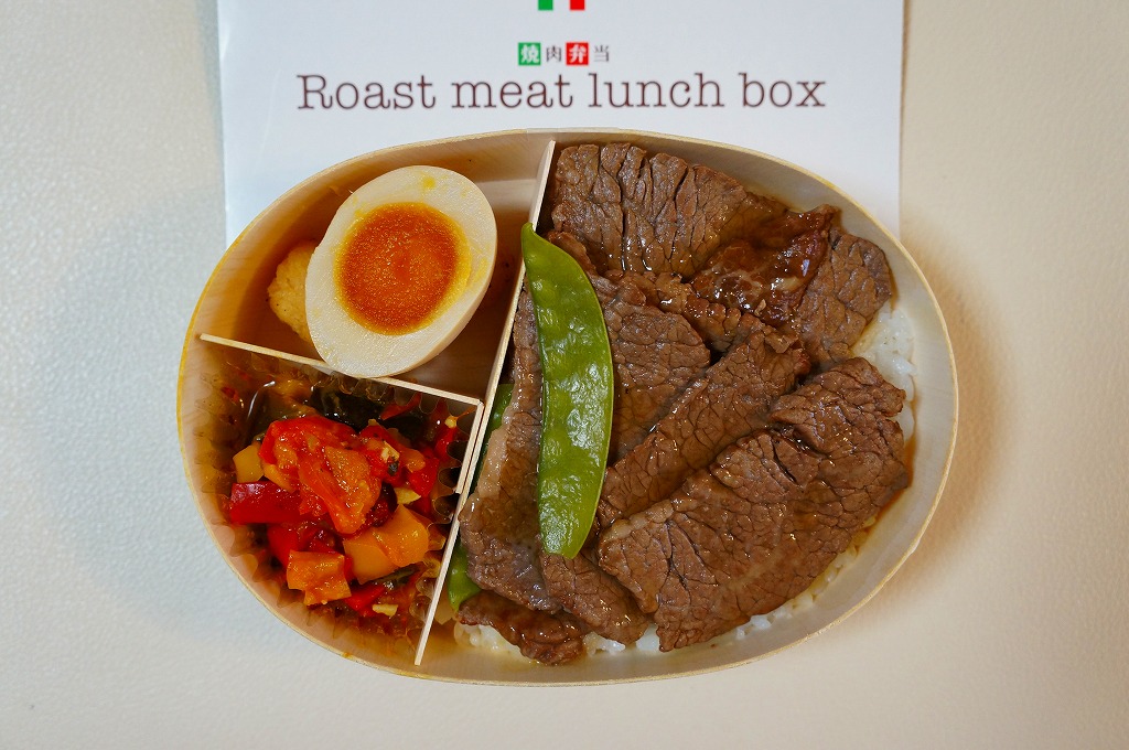 上記の駅弁「焼肉弁当 Roast meat lunch box」と同じもの。煮玉子が玉子焼になったのは、リニューアルか改修か、あるいは時節柄によるものか。いずれにせよ現存しない。