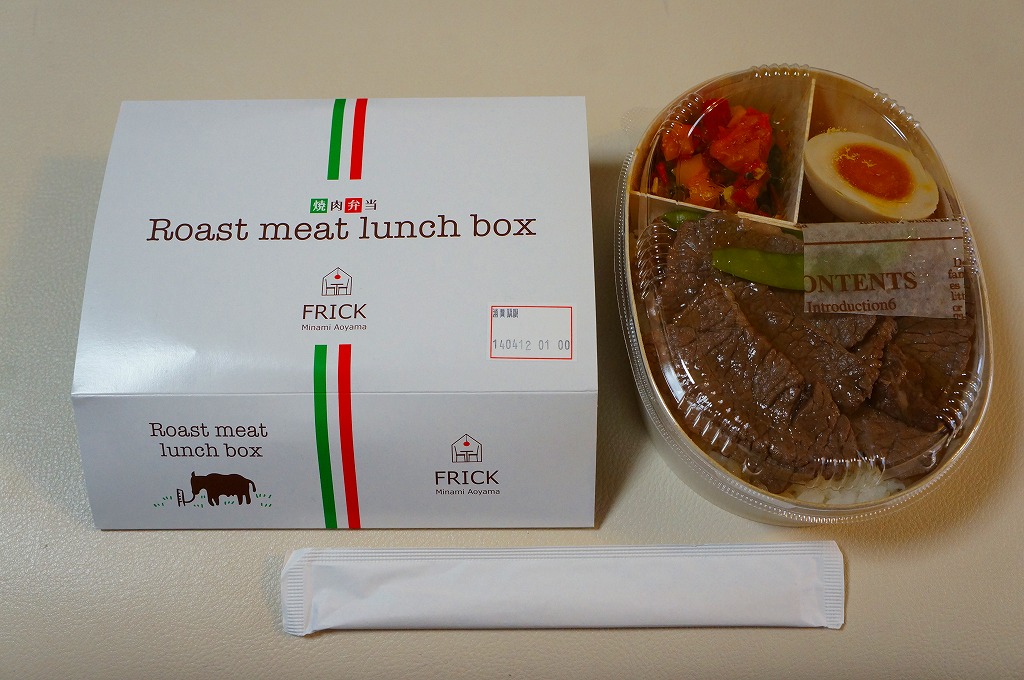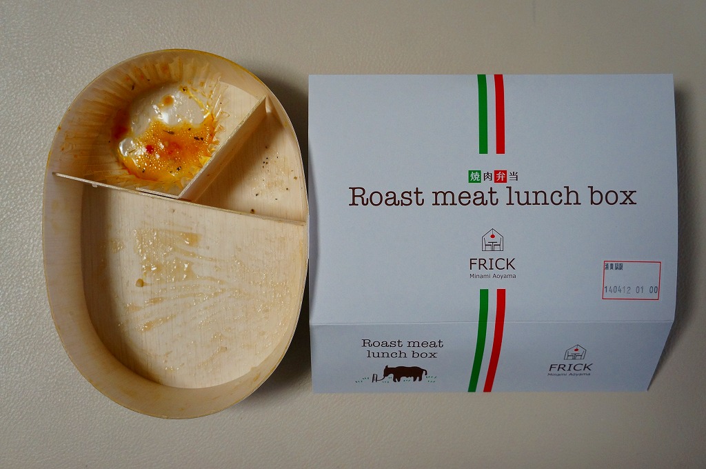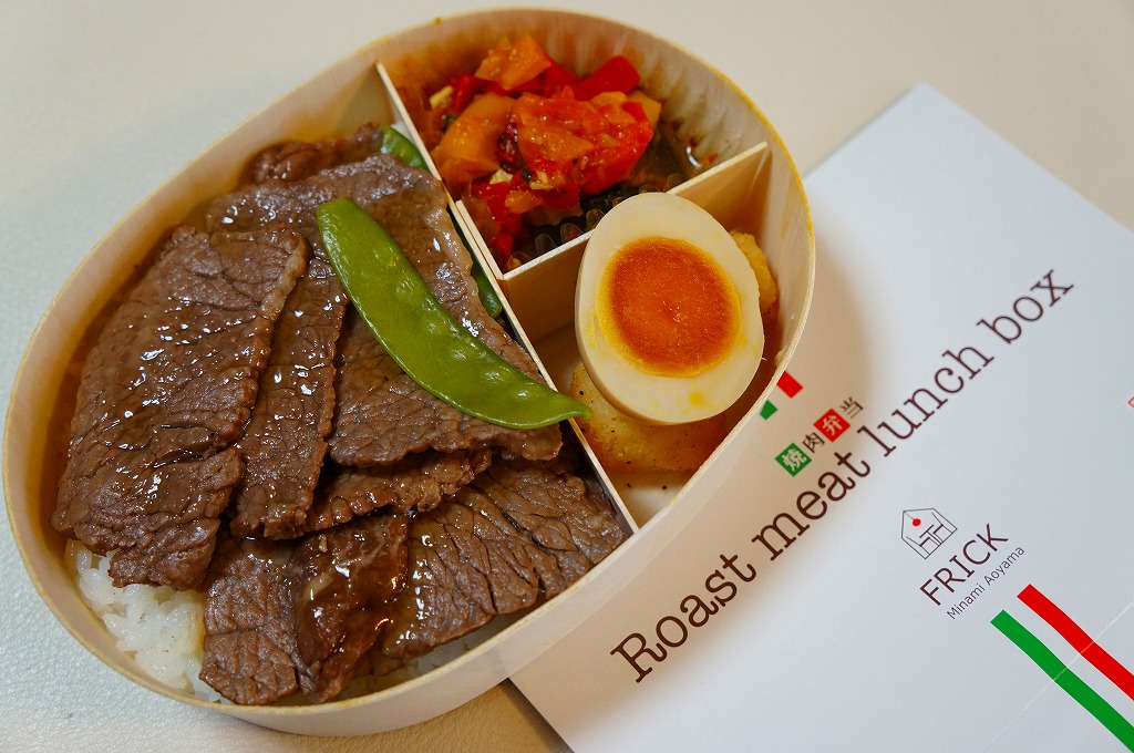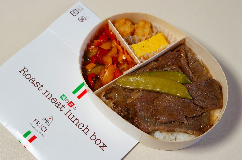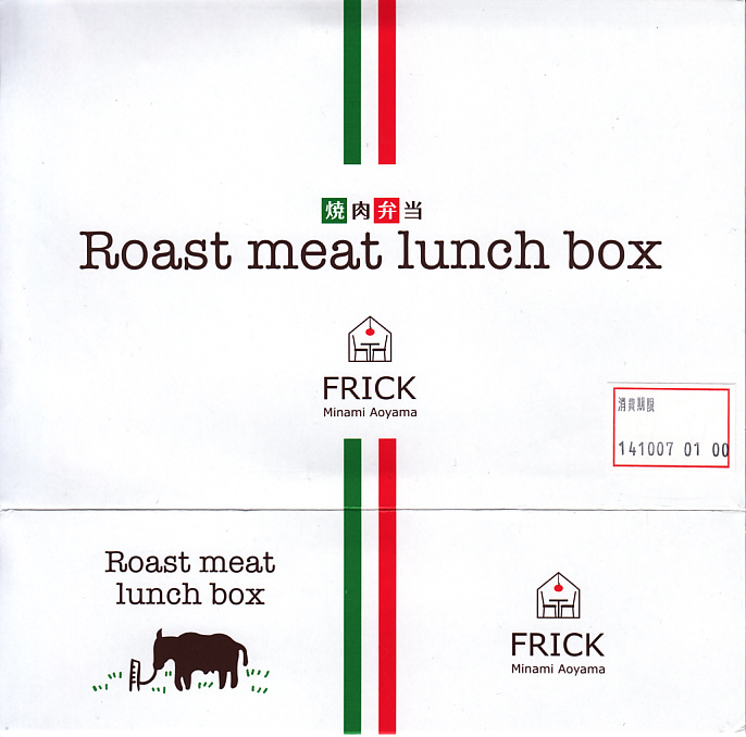 2013(平成25)年頃の発売か。東京都・南青山のイタリアンレストラン「FRICK」を名乗るお弁当で、調製元はなぜか山形県は米沢駅の駅弁屋。楕円形の木製エコ容器に、白御飯を詰め、牛焼肉で覆い、煮玉子とピーマンやズッキーニなどのトマト煮込みを添える。とってもおしゃれなランチボックスになっていた。2015年頃までの販売か。