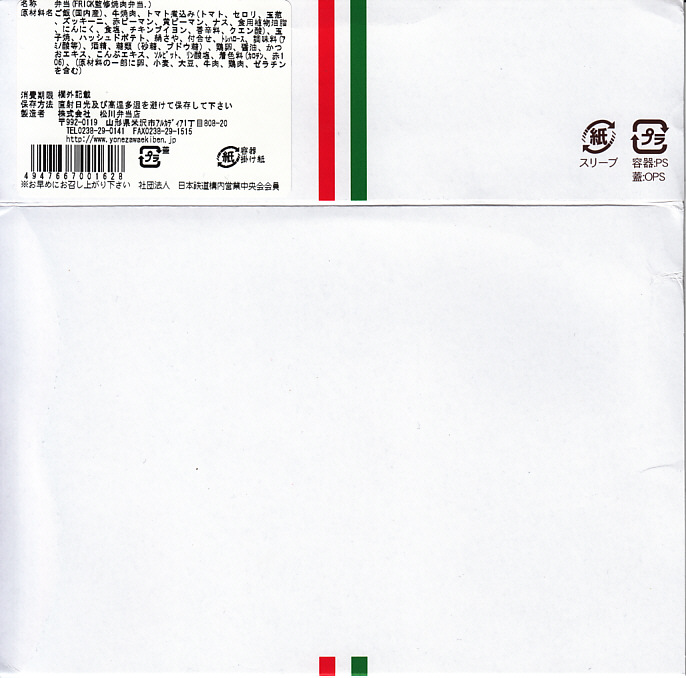 2013(平成25)年7月12日に購入した、東京駅弁のスリーブ。注意書きの多さを除き、上記の2018年のものと基本的には変わらない。容器や中身や味も同じ。