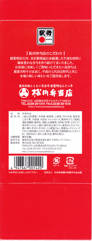 2022(令和4)年10月1日に発売。鉄道開業150年を記念し、JR東日本仙台支社管内の4駅の、南東北に拠点を置く各駅弁会社6社が発売した7駅弁のうちひとつ。この駅弁を含め、同時にそのすべてが、JR東日本の駅弁キャンペーン「駅弁味の陣2022」にエントリー。これは名前から山形駅、あるいは調製元から米沢駅の駅弁に聞こえて、しかし売られるのは東京駅と仙台駅、詳しくはその両駅で各地の駅弁を集めて売る店「駅弁屋 祭」らしい。純にイベント向け、キャンペーン向けの商品か。