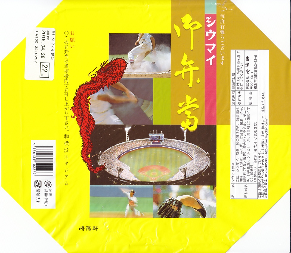 2016(平成28)年4月28日に購入した、横浜スタジアム限定発売のシウマイ弁当の掛紙。容器と中身は引き続き、通常版のシウマイ弁当と同じで、価格は100円高い。掛紙は変わらないように見えて、球場の写真が差し替わることがある。今回は弁当の名前が「お弁当」から、駅弁と同じ「御弁當」に変わっていた。