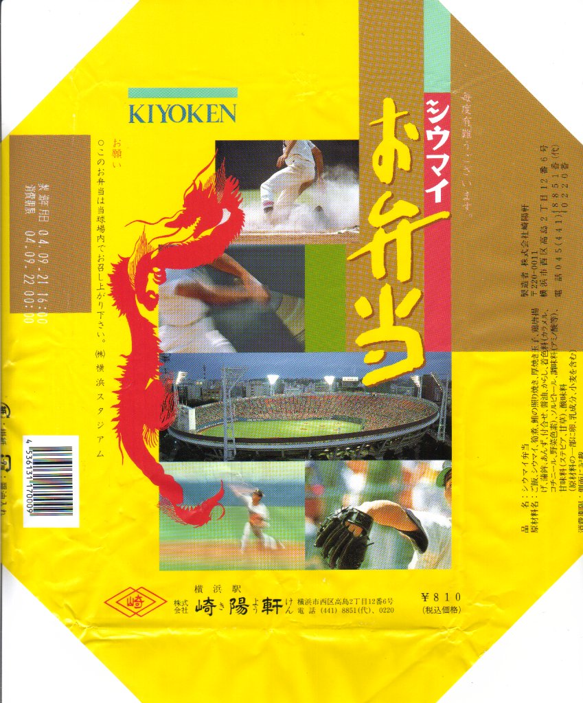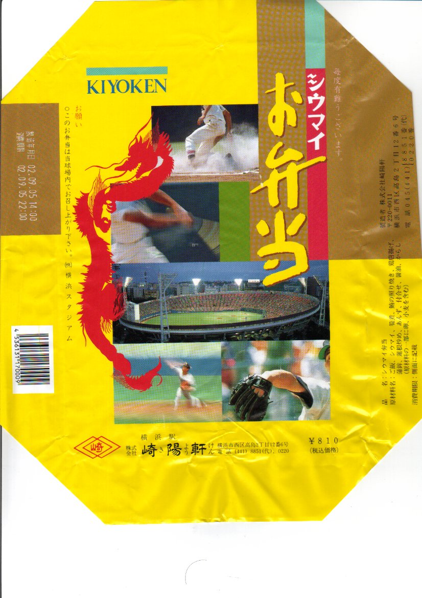 2004(平成16)年9月21日に購入した、横浜スタジアム限定発売のシウマイ弁当の掛紙。下記の2002年9月時点のものと比べて、右側の食品表示と左側の識別表示が変わったくらい。