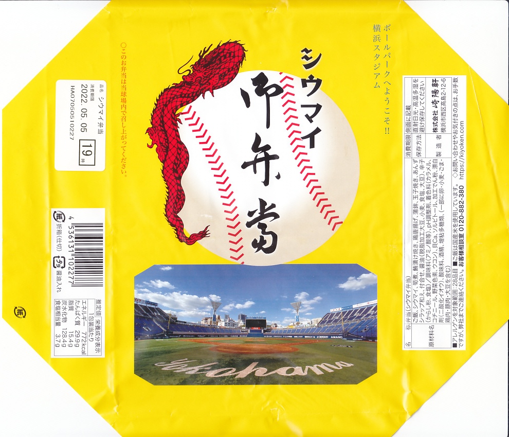 2019(平成31)年4月23日に購入した、横浜スタジアム限定発売のシウマイ弁当の掛紙。絵柄は下記の2016年のものから変わらず、法令の強化で食品表示が激増した。この絵柄は2021年プロ野球ペナントシーズンまで使われた。