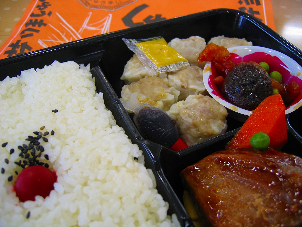 仕出し弁当のプラ容器を、商品名を4箇所にも書いたオレンジ色の掛紙で包む。中身は日の丸御飯に小さめのしゅうまいが6個、焼マグロに、人参や椎茸などの煮物に、揚げ豚肉、柴漬けなど。横浜駅弁で有名な崎陽軒の「シウマイ御弁當」を、ホカ弁風にグレードダウンしたらこうなったという印象もあるが、駅弁のシウマイと比べてやや柔らかく薄味のしゅうまいにも、きっとファンがいると思う。