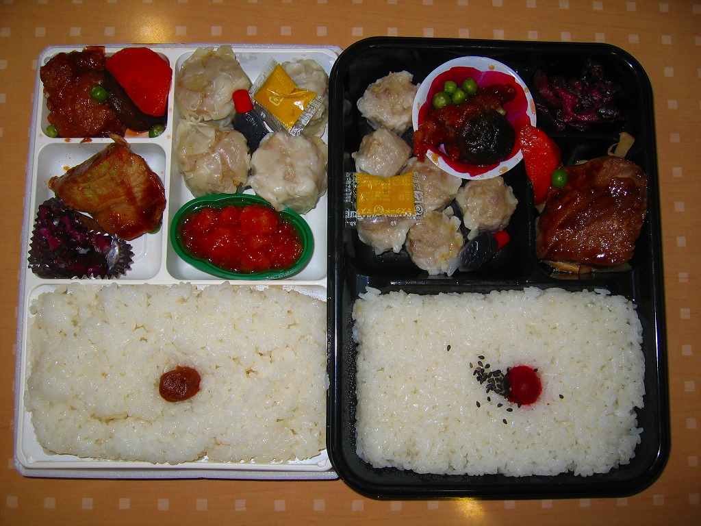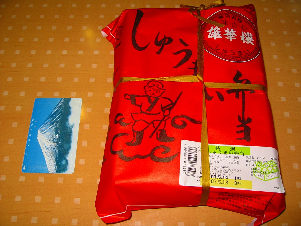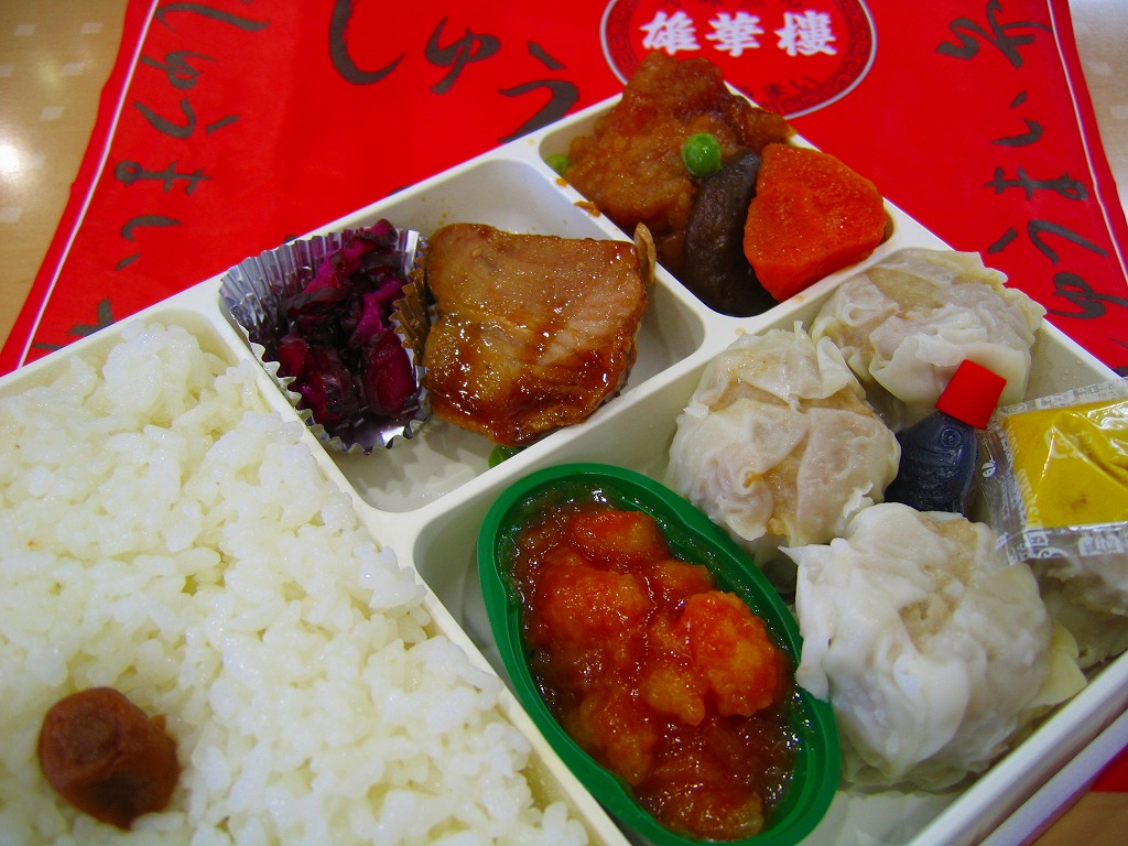 訪問時の海老名サービスエリアは、この弁当の掛紙にも書かれる「雄華樓」の焼売や豚まんが、土産物の主力商品として売り場面積と陳列個数が目立っていた。中華街の職人を戦前に招いて鉄道駅で商売にしたのが崎陽軒で、戦後に招いてドライブインやサービスエリアで商売にしたのが「雄華樓」ブランドの加次食品。今はいずれも横浜中華街に逆進出し店舗を持つ。