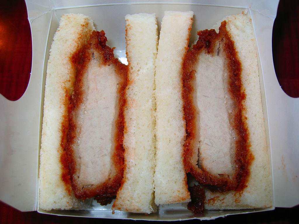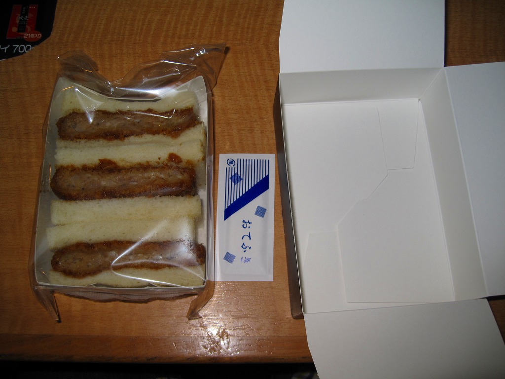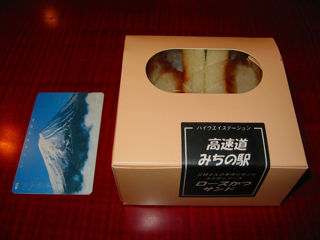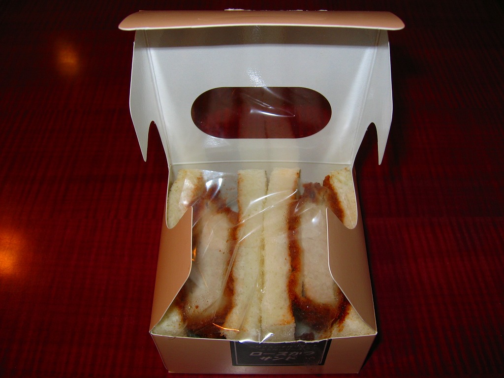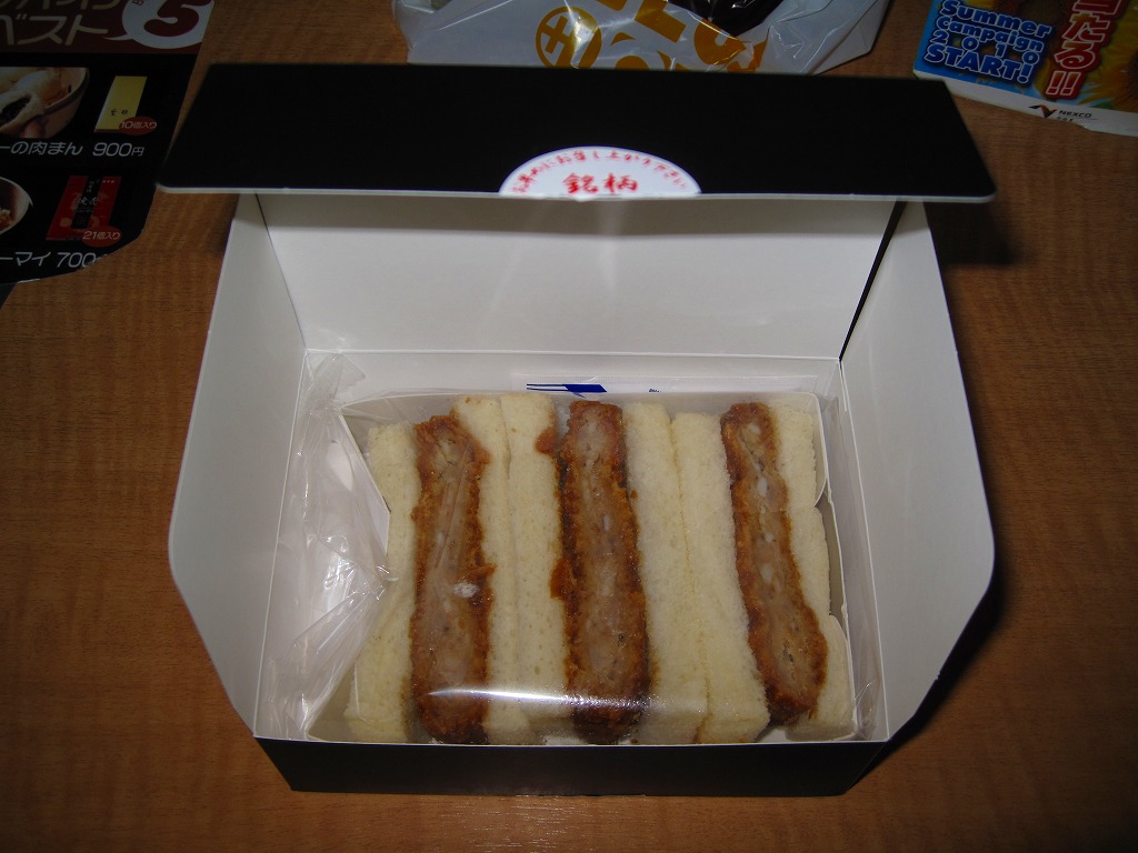 海老名サービスエリアで見つけたコンビニサンド。速弁ができたからか、できる前からか、2切れのロースカツサンドは厚手の紙箱に詰められており、商品名シールで封をしている。カツは写真では厚めに見えるがもともとサイズが小さく、肉は硬めで、手が汚れるし食べにくい形状で、趣味的に容器の保管性が最悪で、どうも良い印象が持てない。製造者は所在地が海老名や東名高速と何の関連もなく、電話帳にも載っていない模様。
